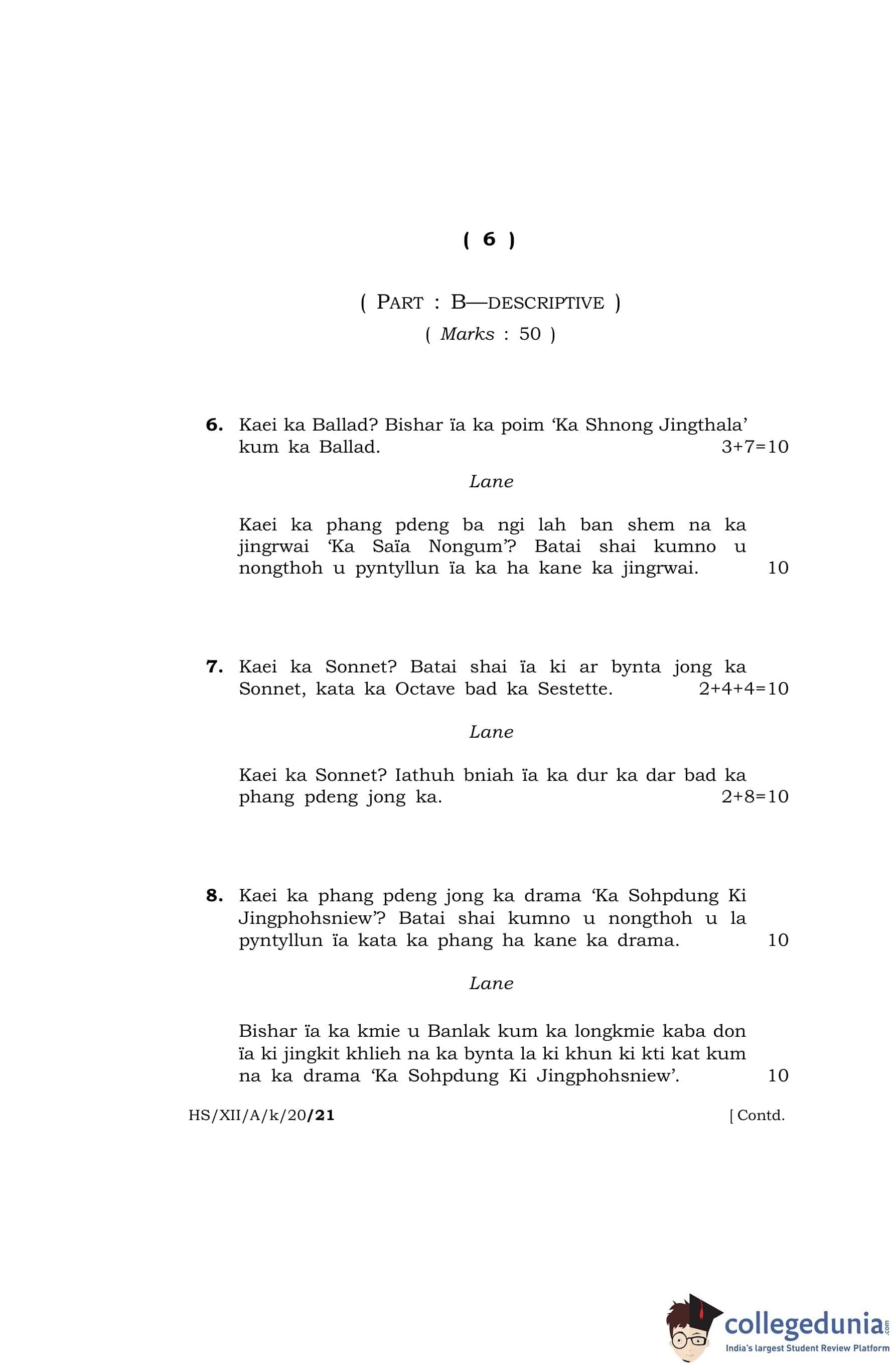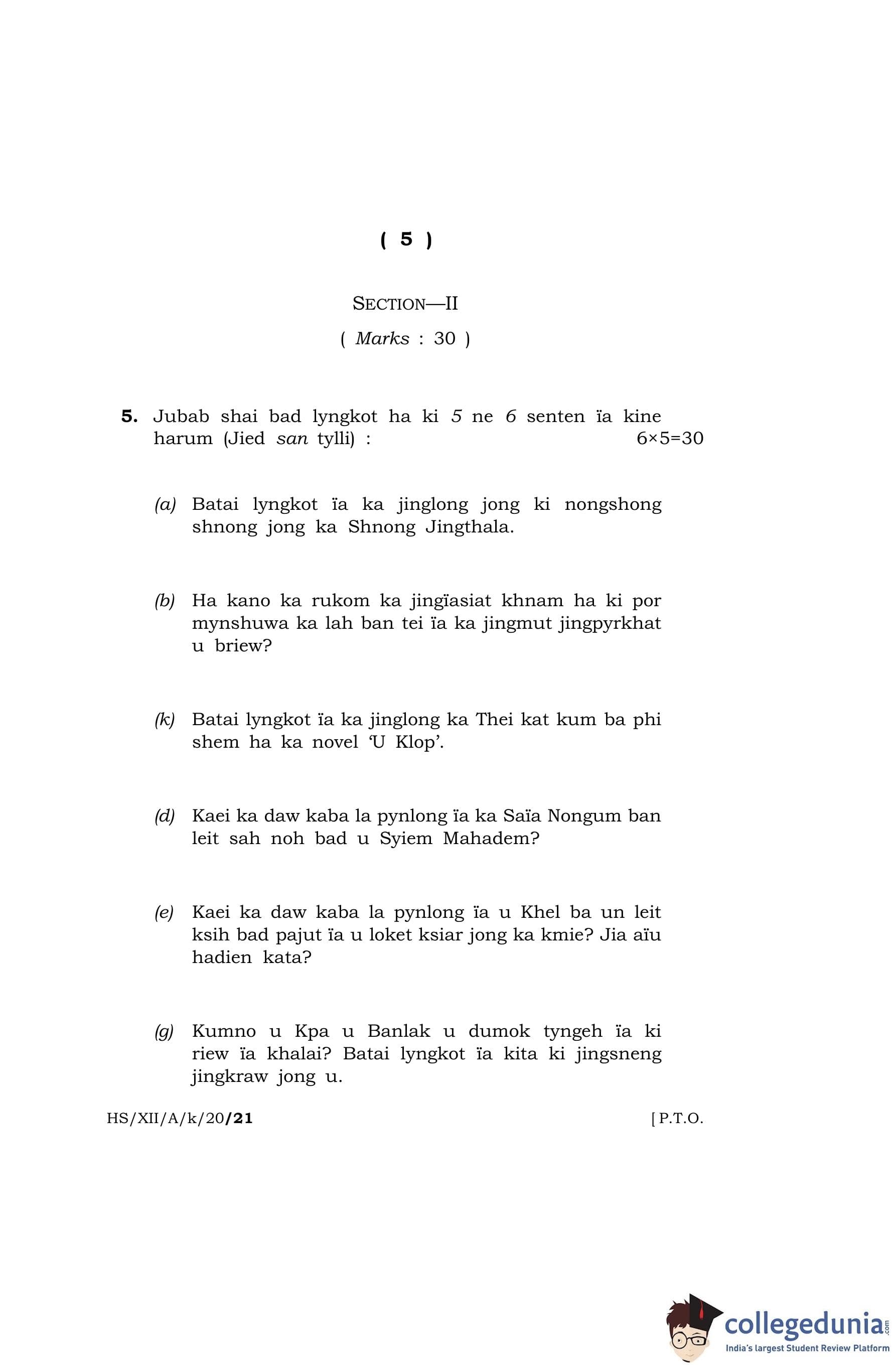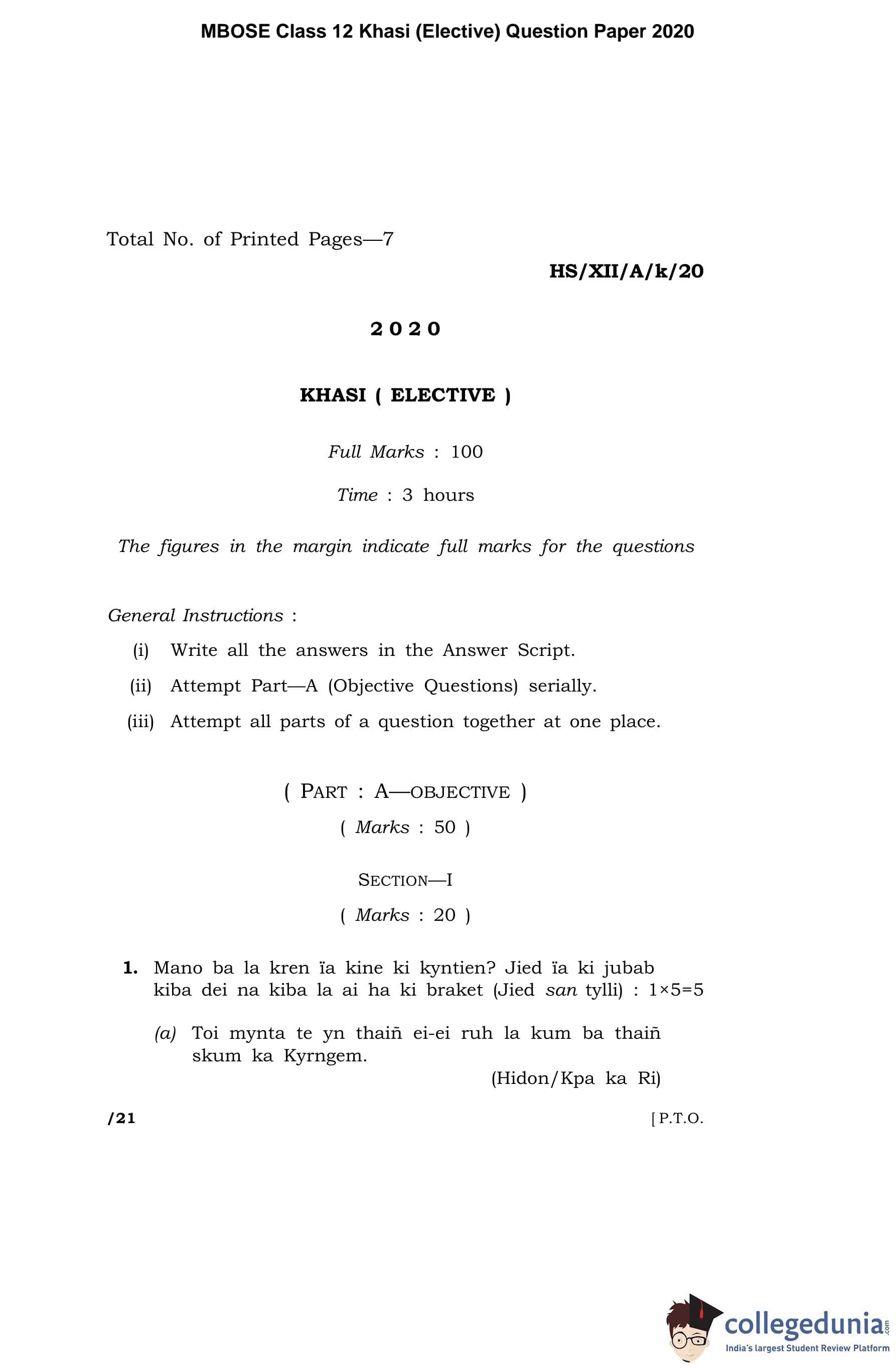 MBOSE Class 12 Khasi (Elective) Question Paper 2020 with Answer Key pdf is available for download here. The exam was conducted by Meghalaya Board of School Education on March 19, 2020 in the Morning Session 10 AM to 1 PM. The question paper comprised a total of 10 questions divided among 2 sections.