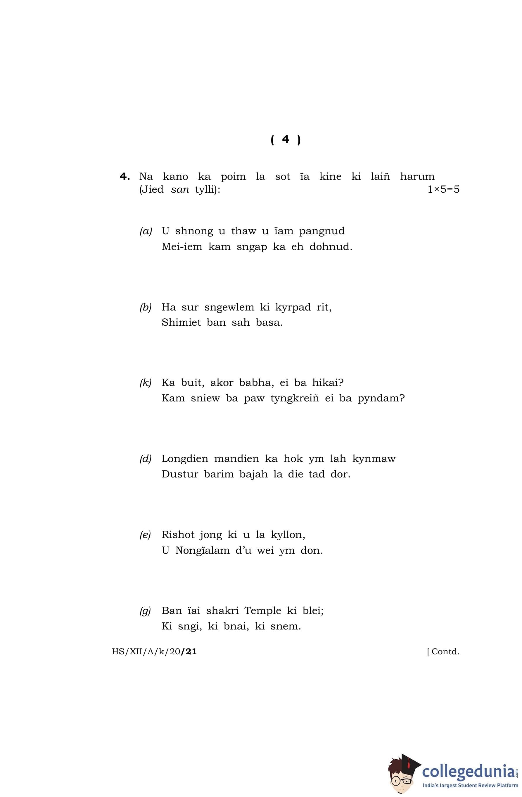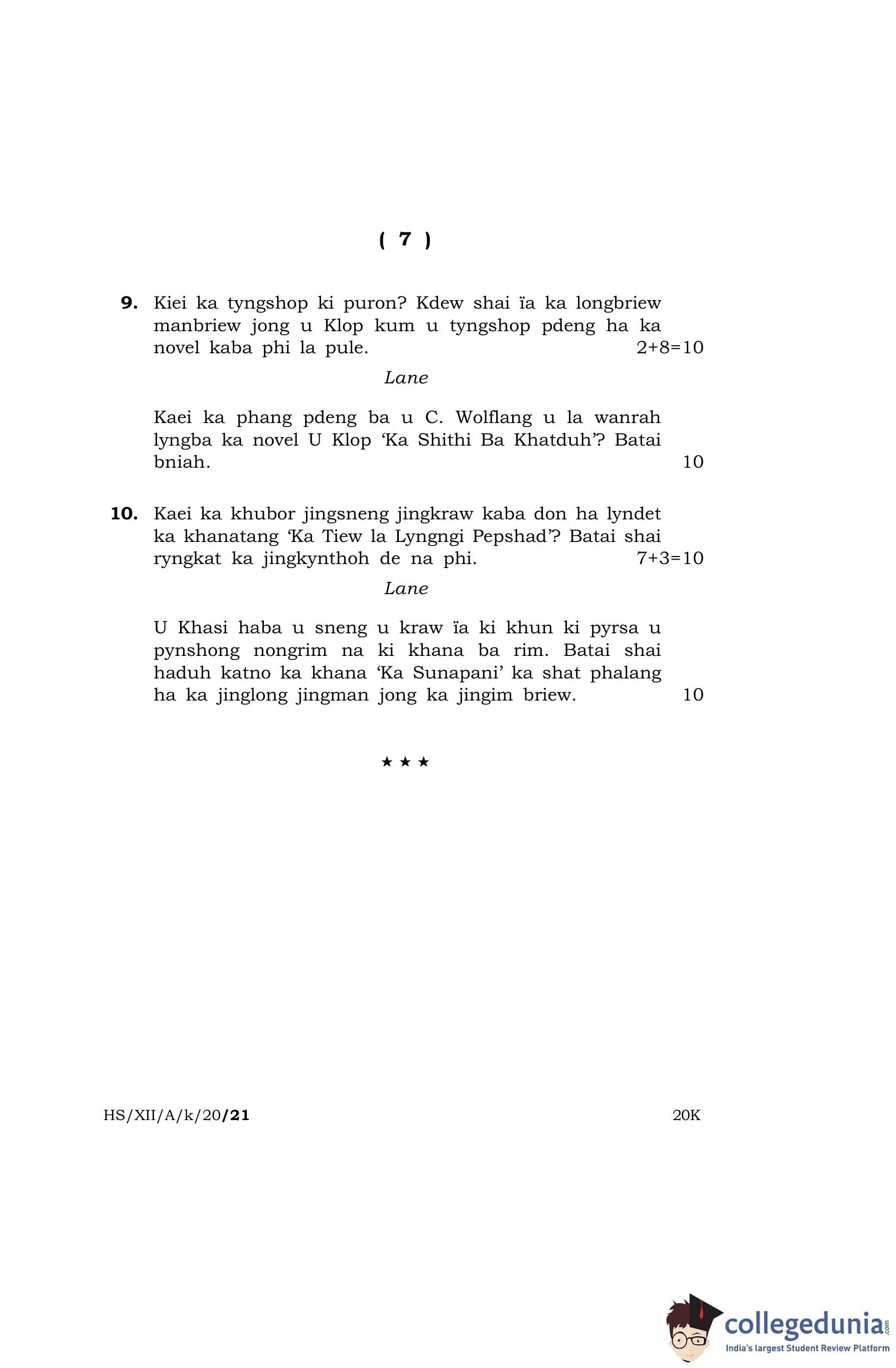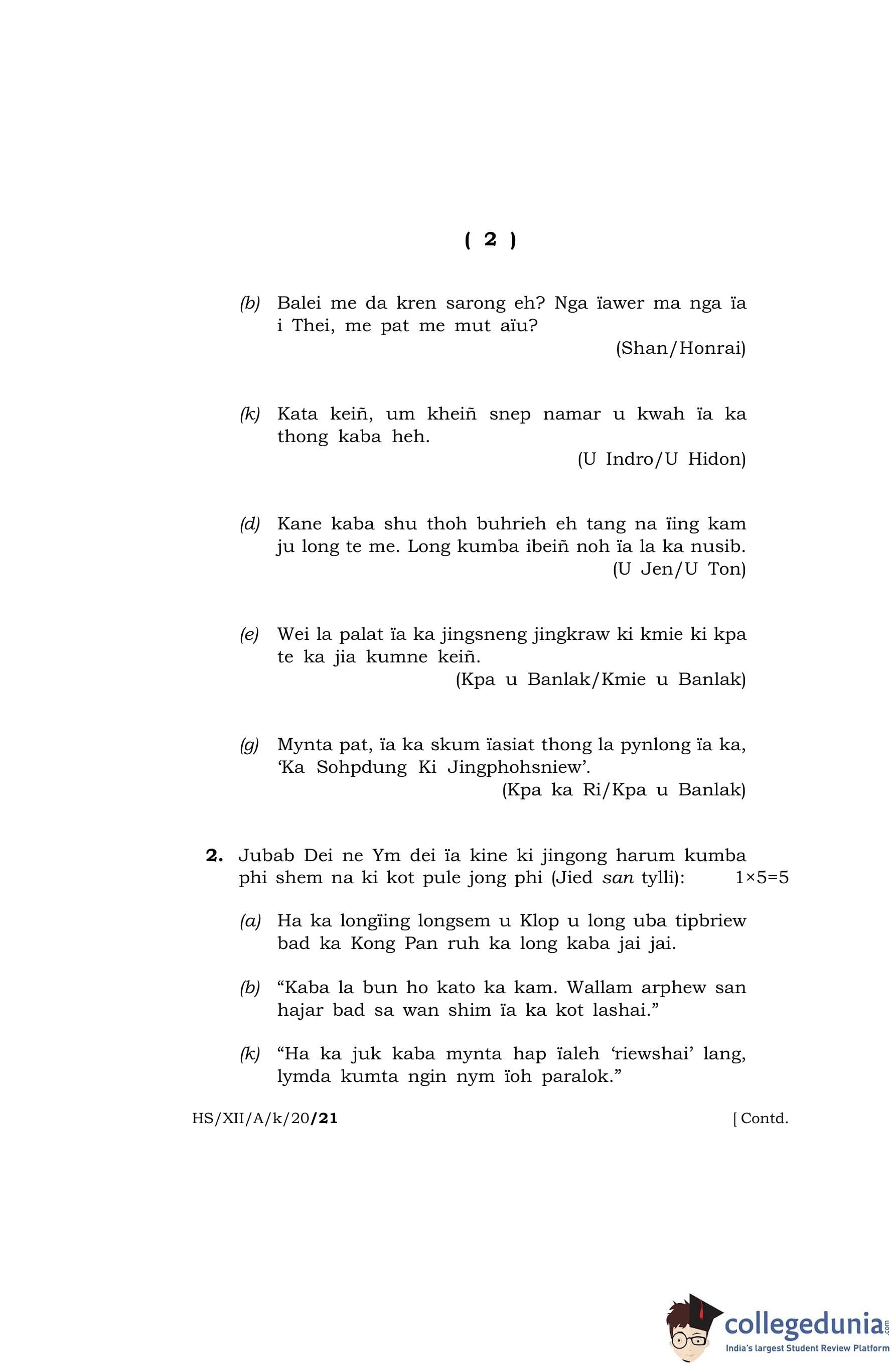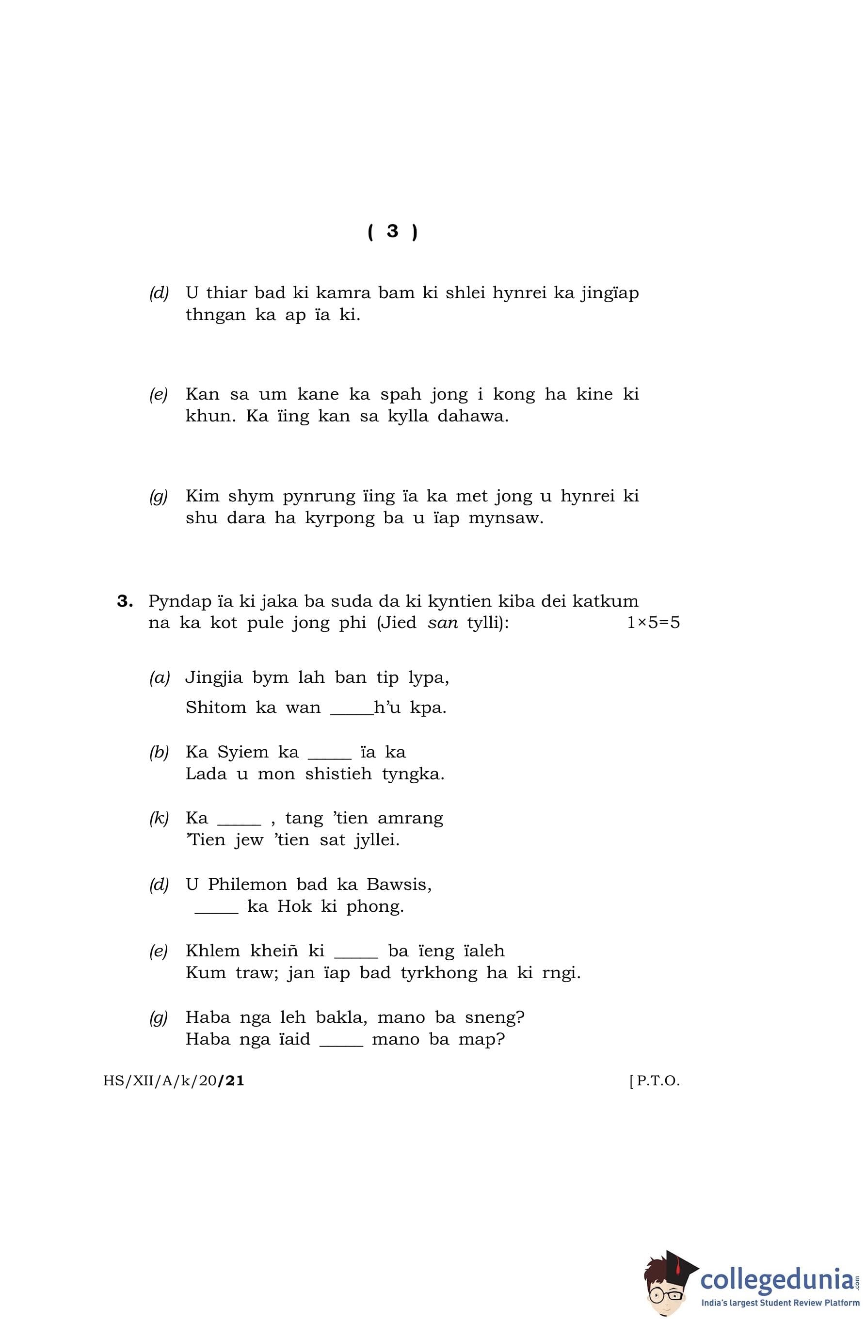 MBOSE Class 12 Khasi (Elective) Question Paper 2020 with Answer Key