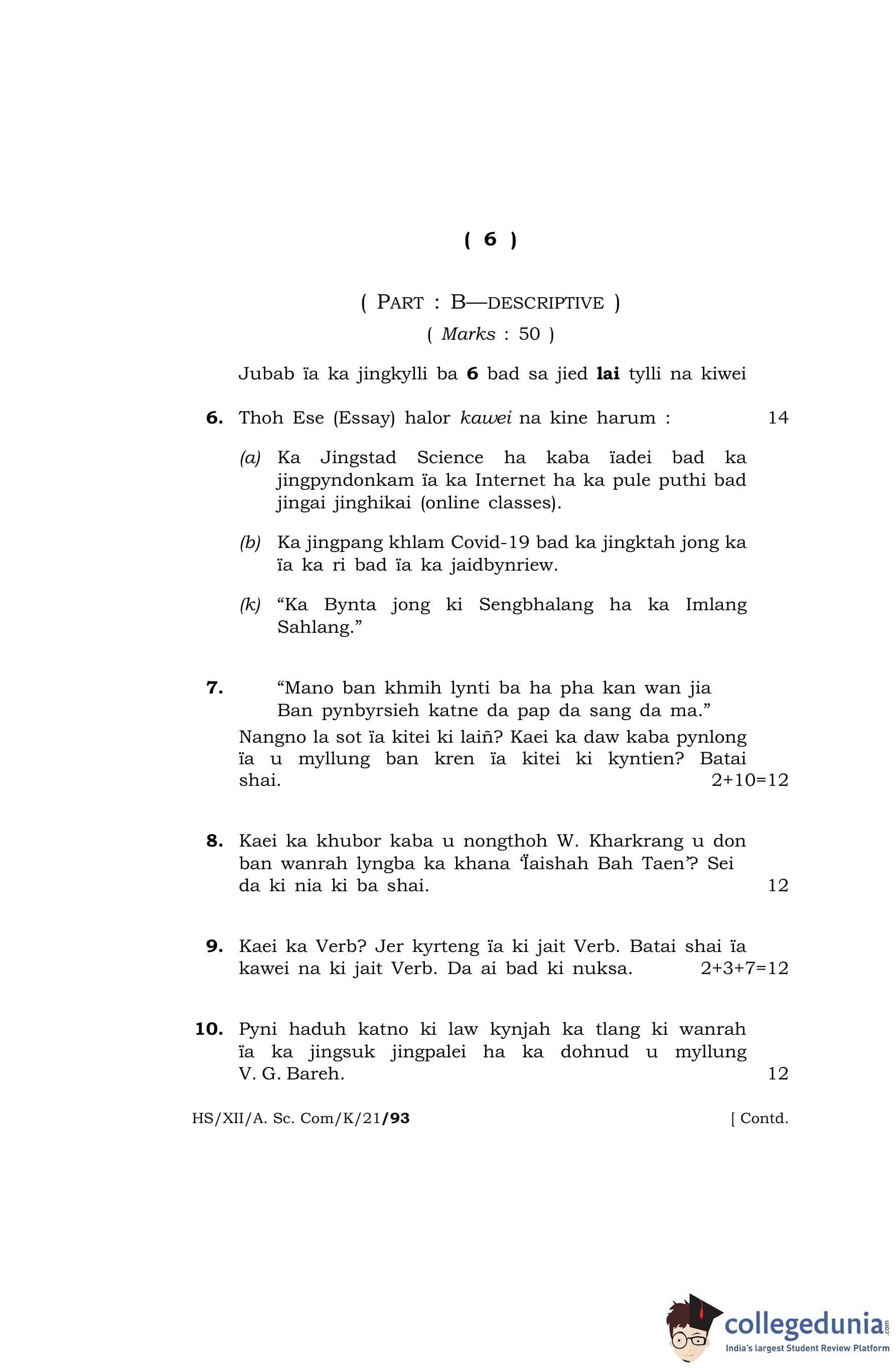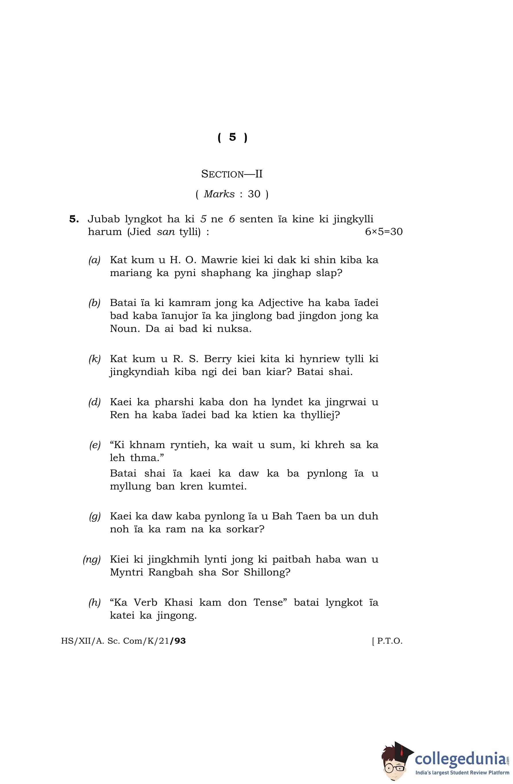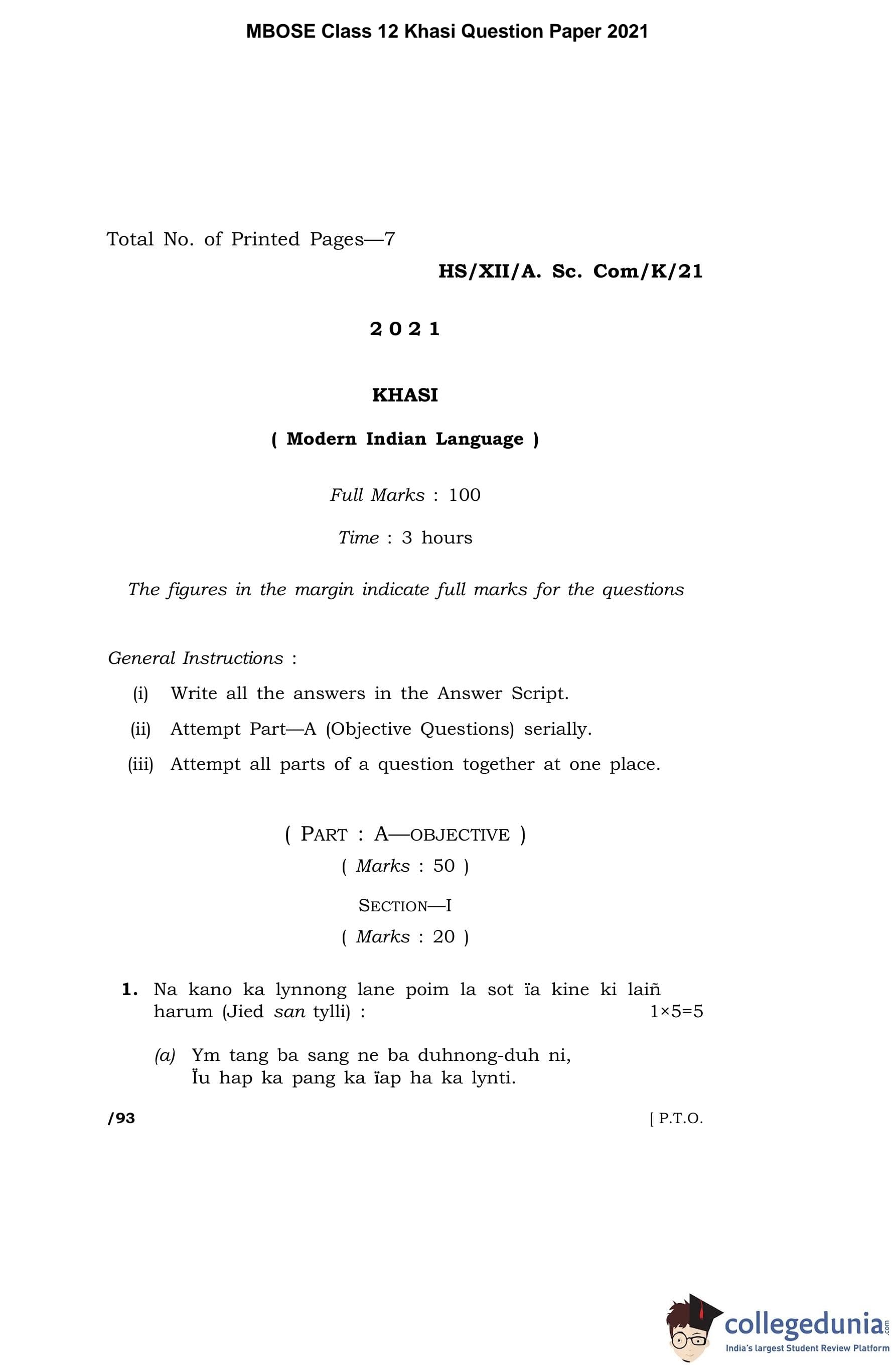 MBOSE Class 12 Khasi Question Paper 2021 with Answer Key pdf is available for download here. The exam was conducted by Meghalaya Board of School Education on April 20, 2021 in the Morning Session 10 AM to 1 PM. The question paper comprised a total of 14 questions divided among 2 sections.