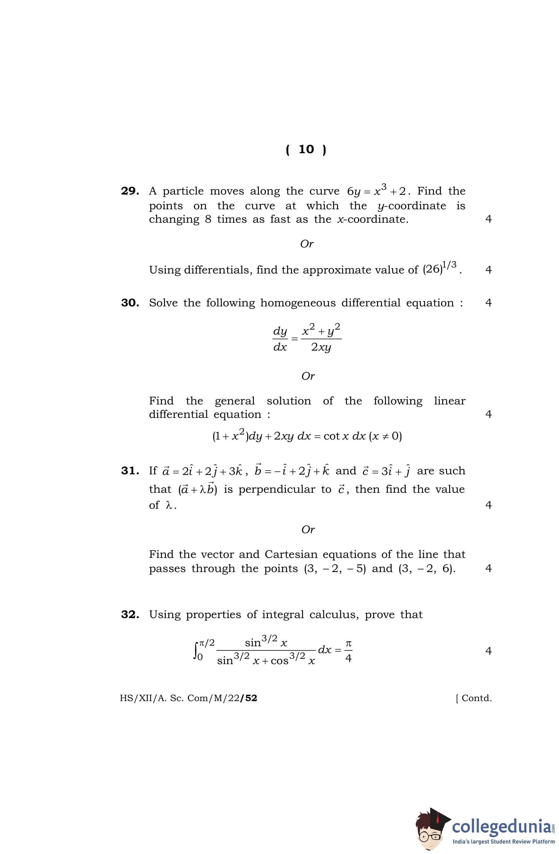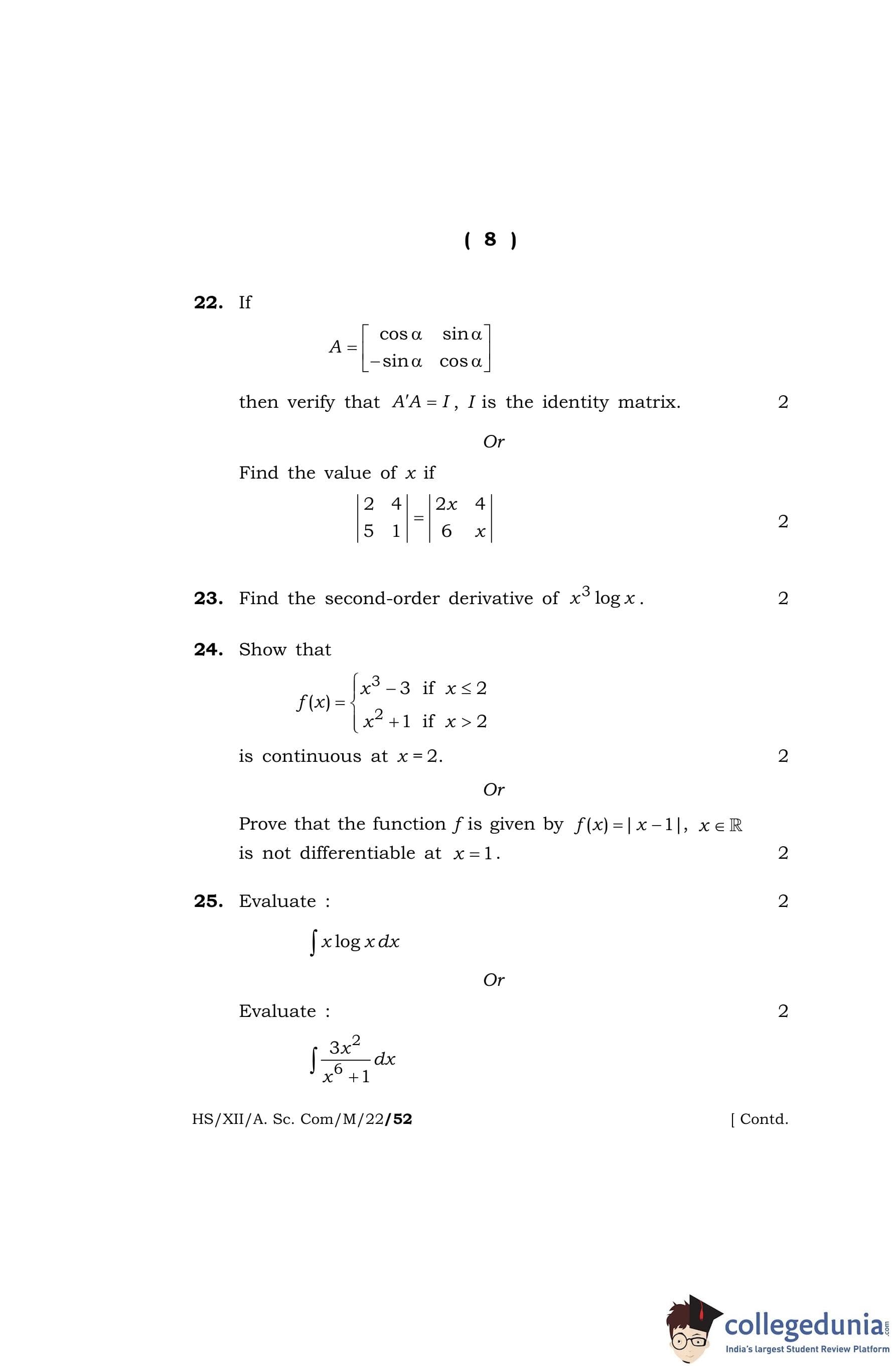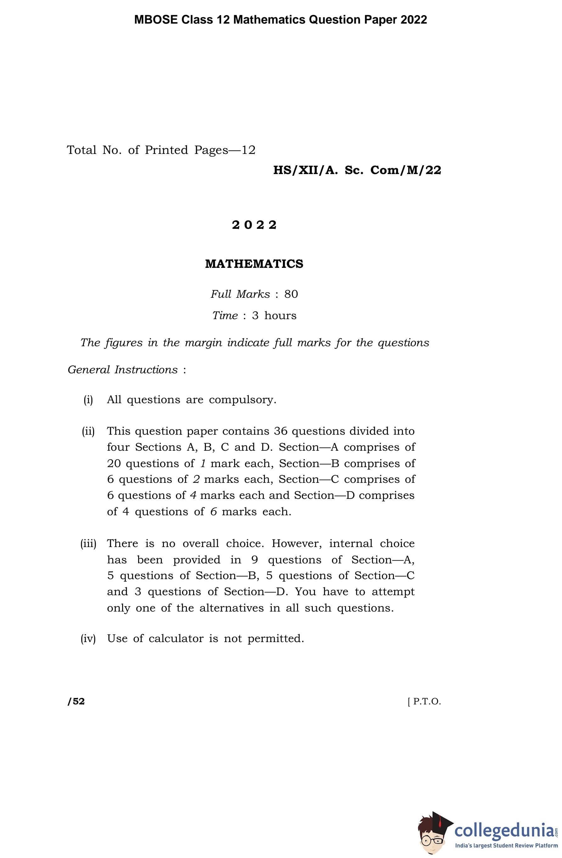 MBOSE Class 12 Mathematics Question Paper 2022 with Answer Key pdf is available for download here. The exam was conducted by Meghalaya Board of School Education on April 7, 2022 in the Morning Session 10 AM to 1 PM. The question paper comprised a total of 36 questions divided among 4 sections.