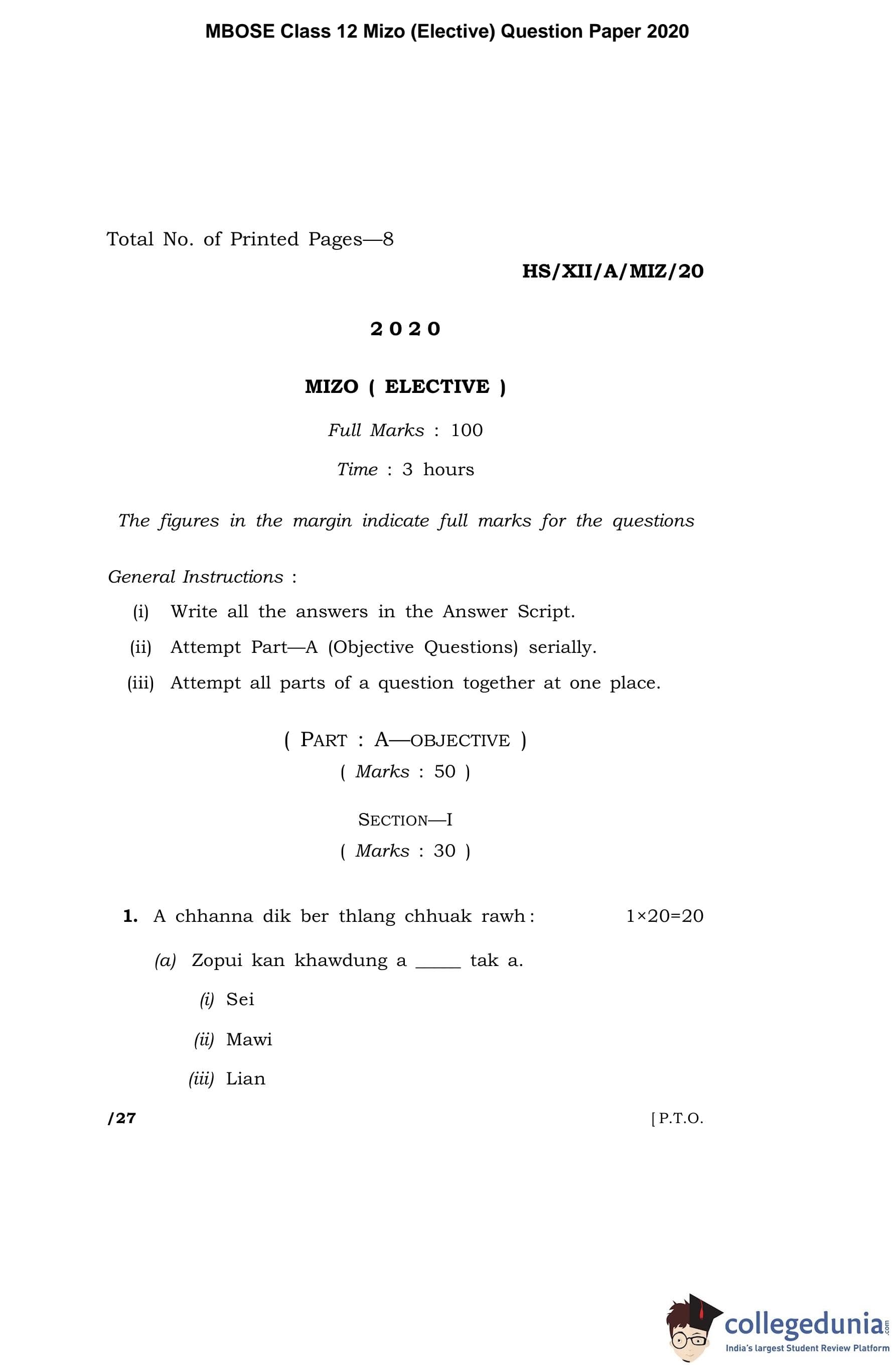 | MBOSE Class 12 Mizo (Elective) Question Paper 2020 PDF | MBOSE Class 12 Mizo (Elective) Answer Key 2020 PDF |