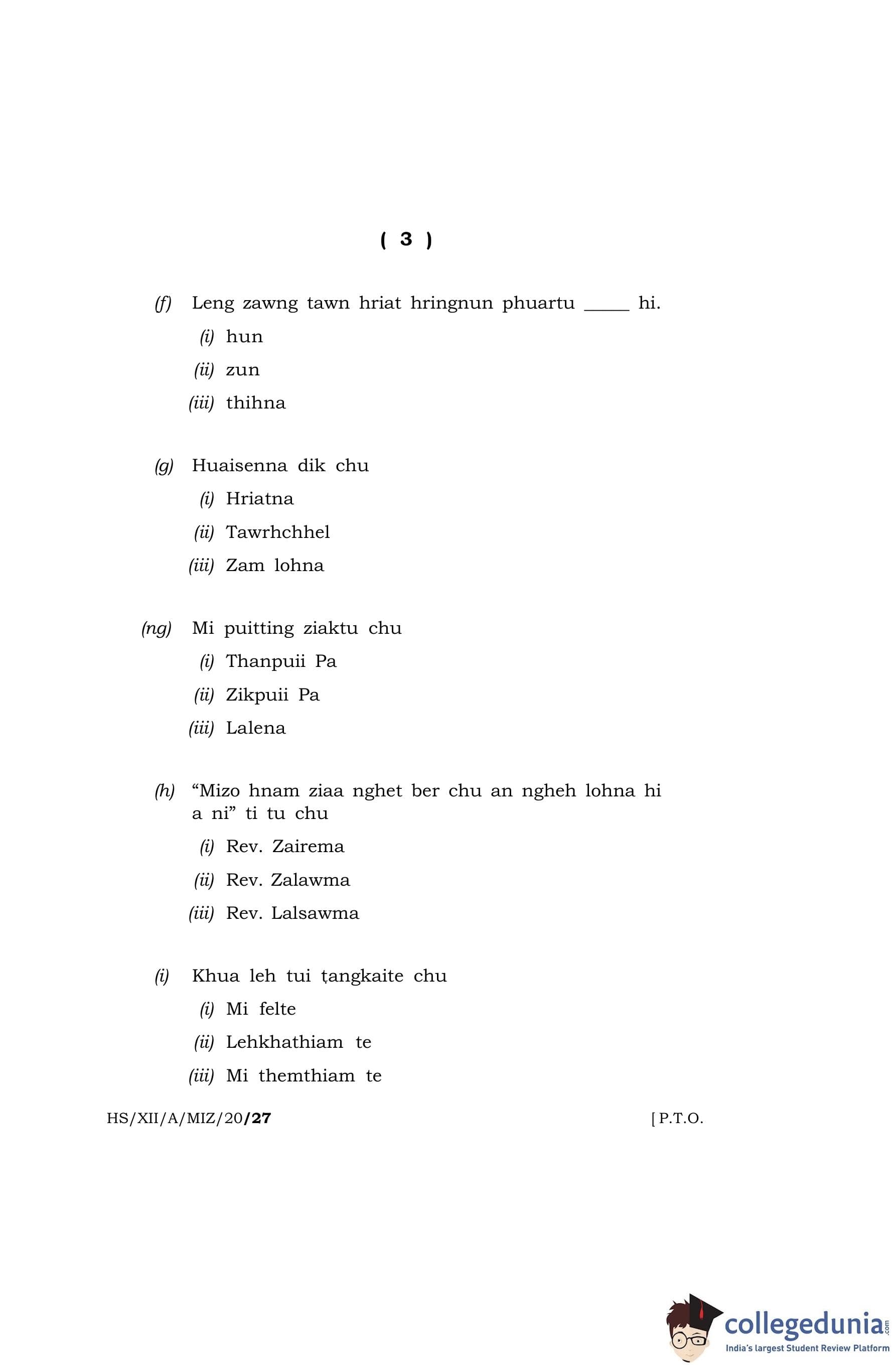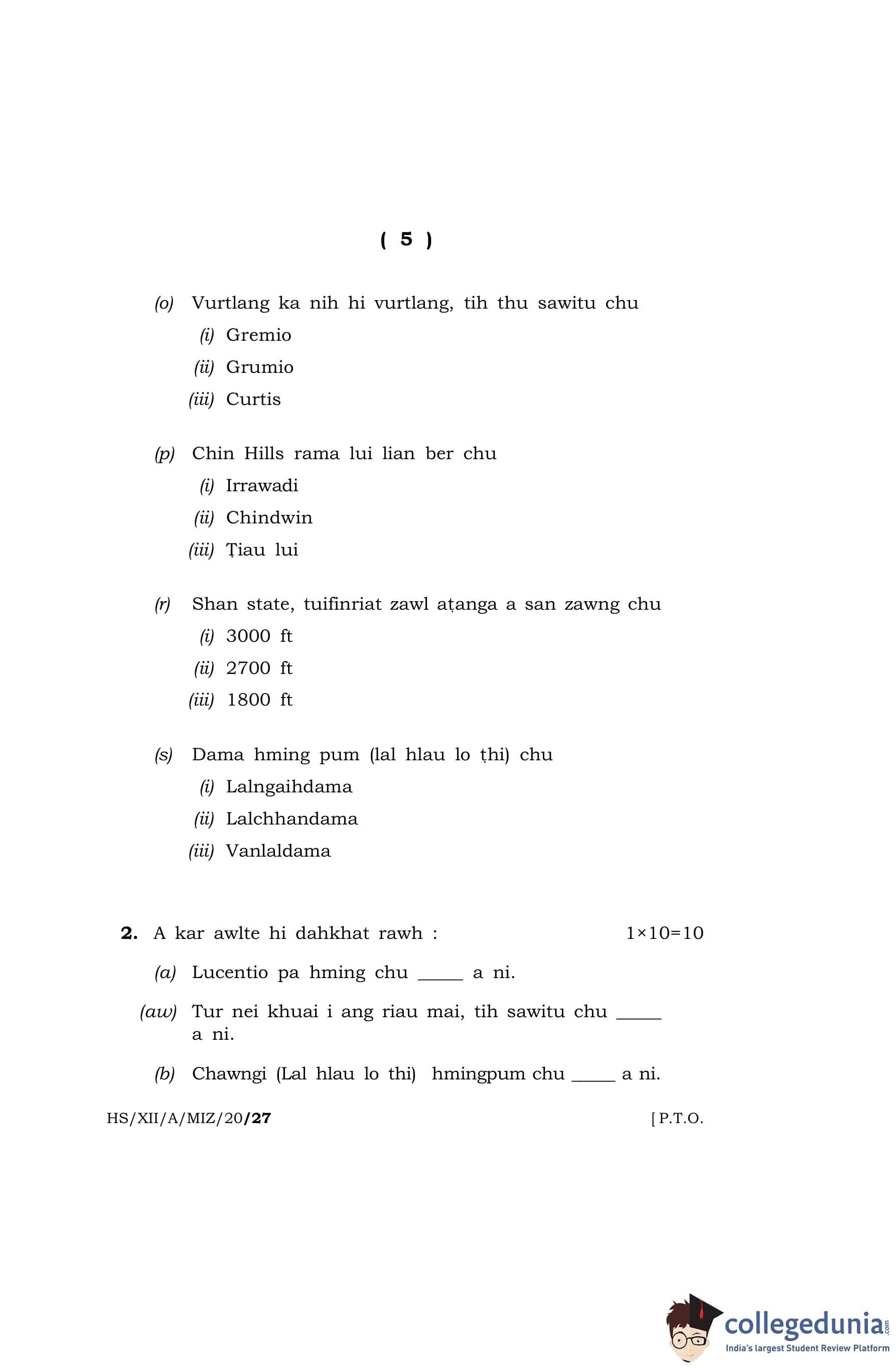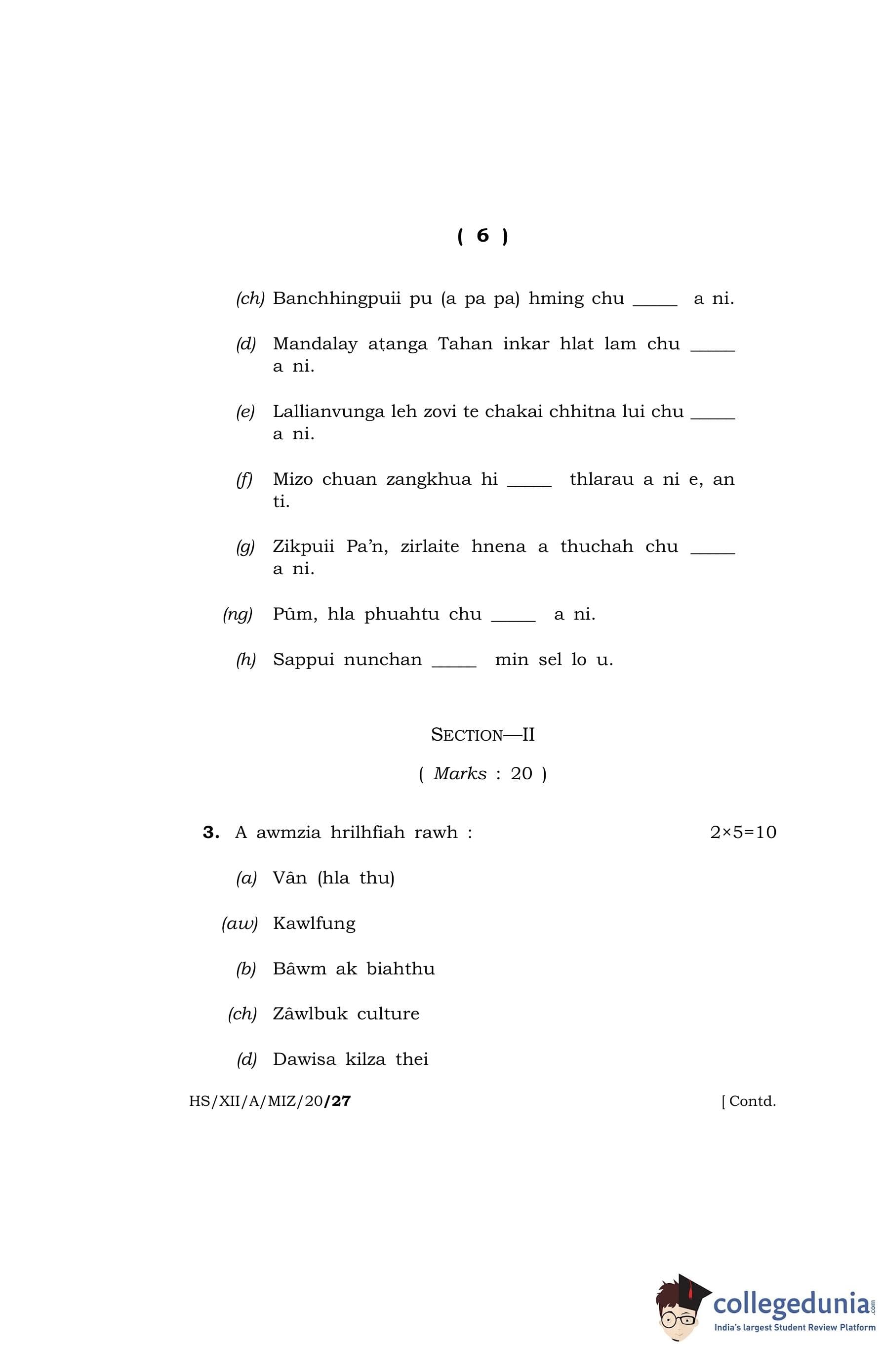 MBOSE Class 12 Mizo (Elective) Question Paper 2020 with Answer Key