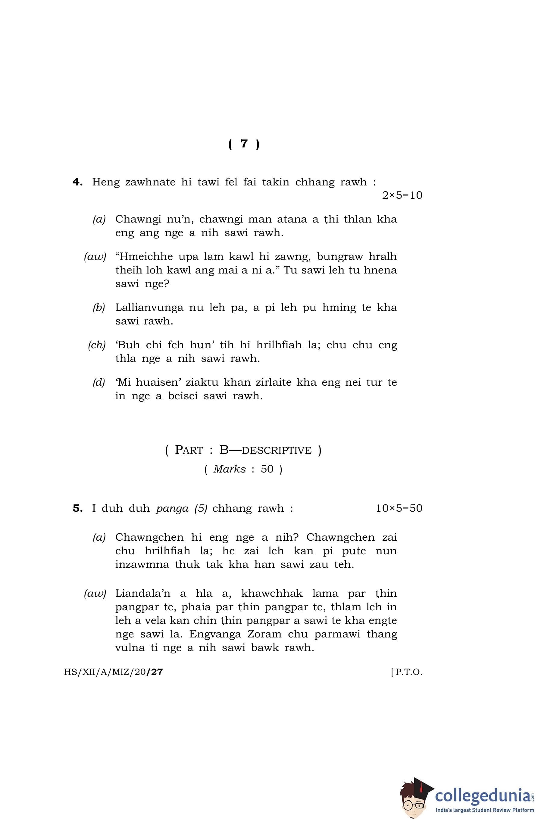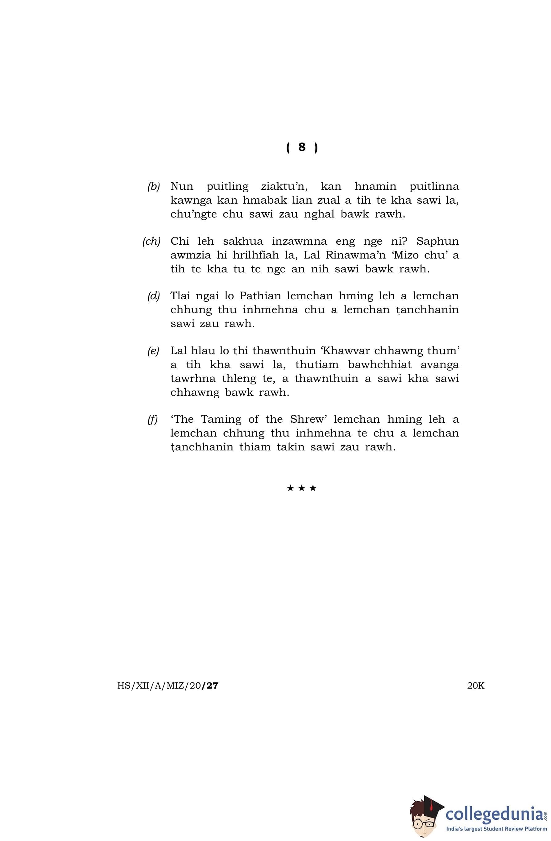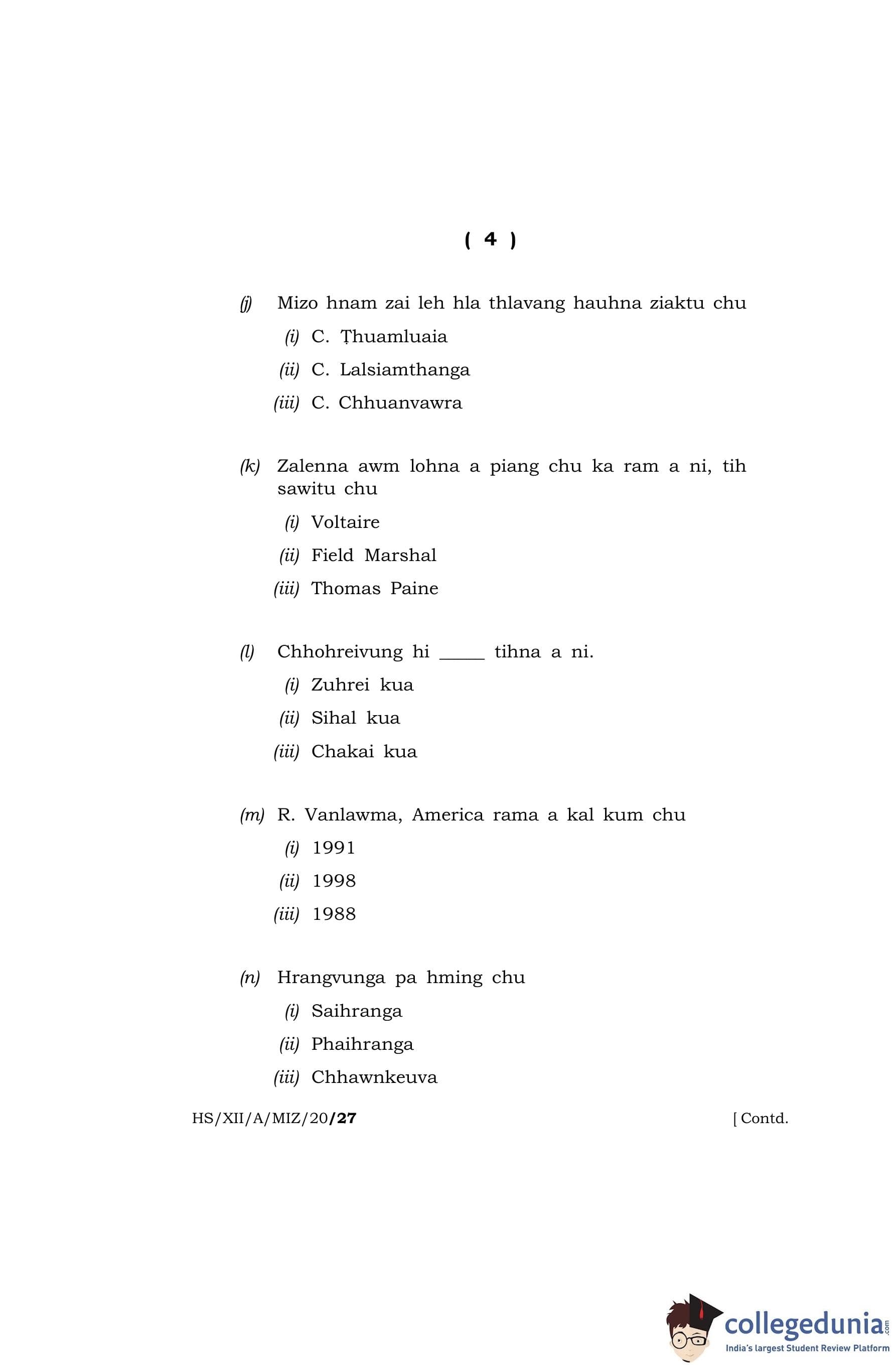 MBOSE Class 12 Mizo (Elective) Question Paper 2020 with Answer Key