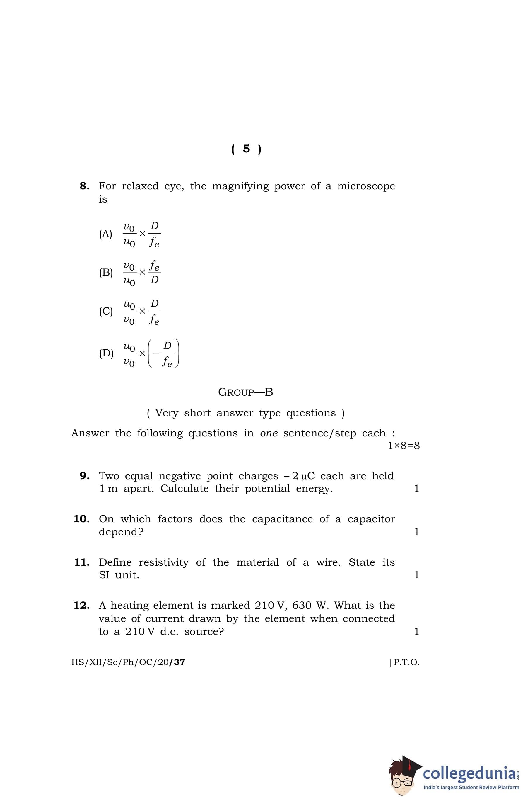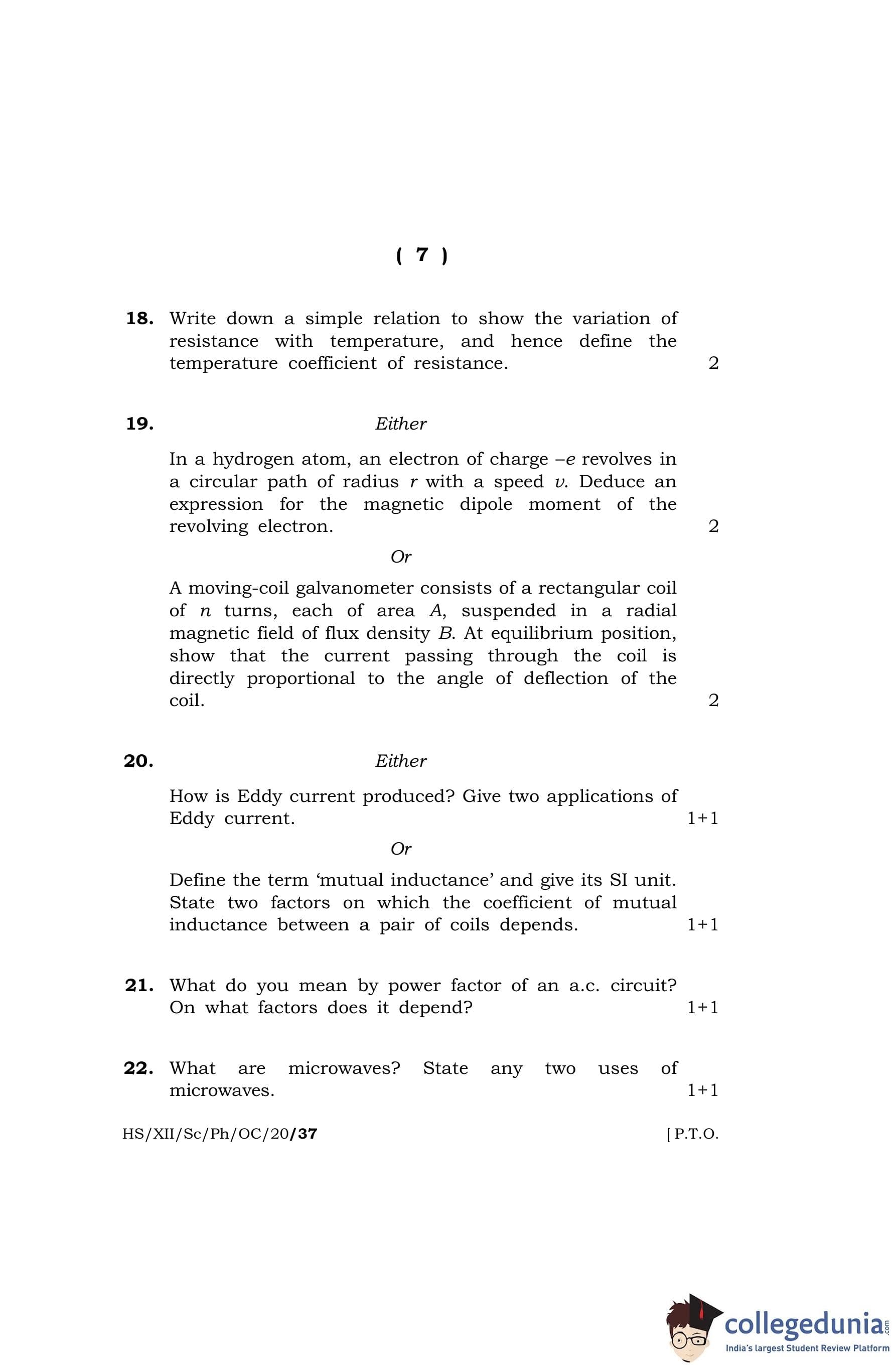 MBOSE Class 12 Physics Question Paper 2020 with Answer Key