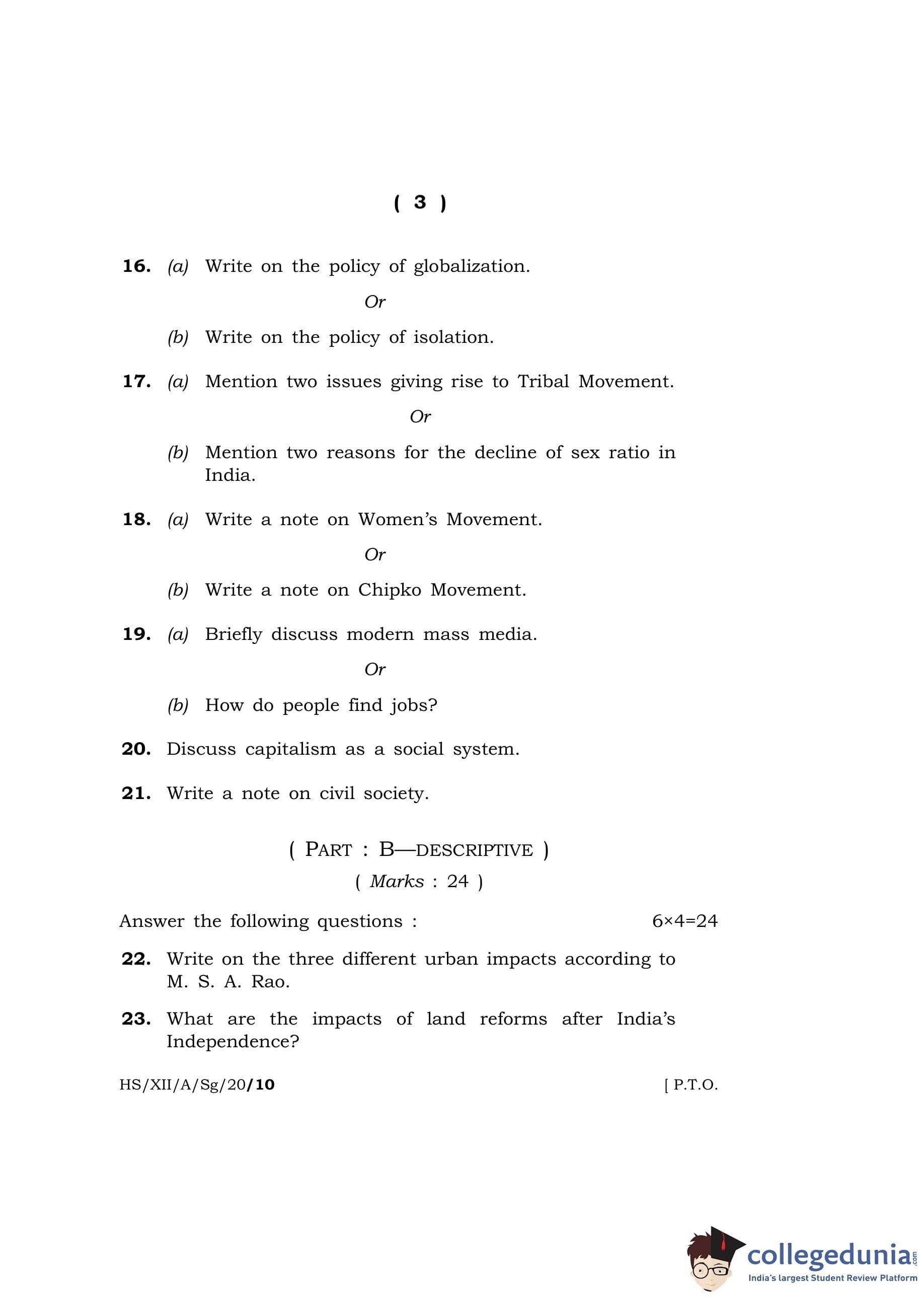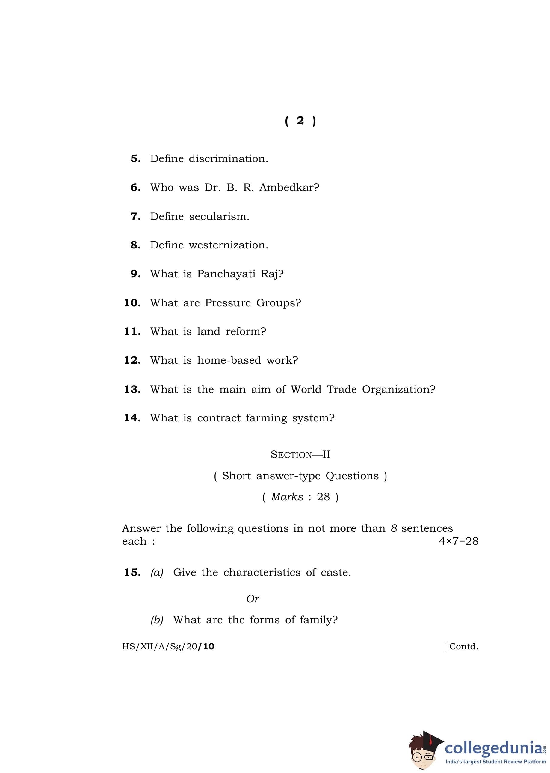 MBOSE Class 12 Sociology Question Paper 2020 with Answer Key pdf is available for download here. The exam was conducted by Meghalaya Board of School Education on March 4, 2020 in the Morning Session 10 AM to 1 PM. The question paper comprised a total of 25 questions divided among 2 sections.
