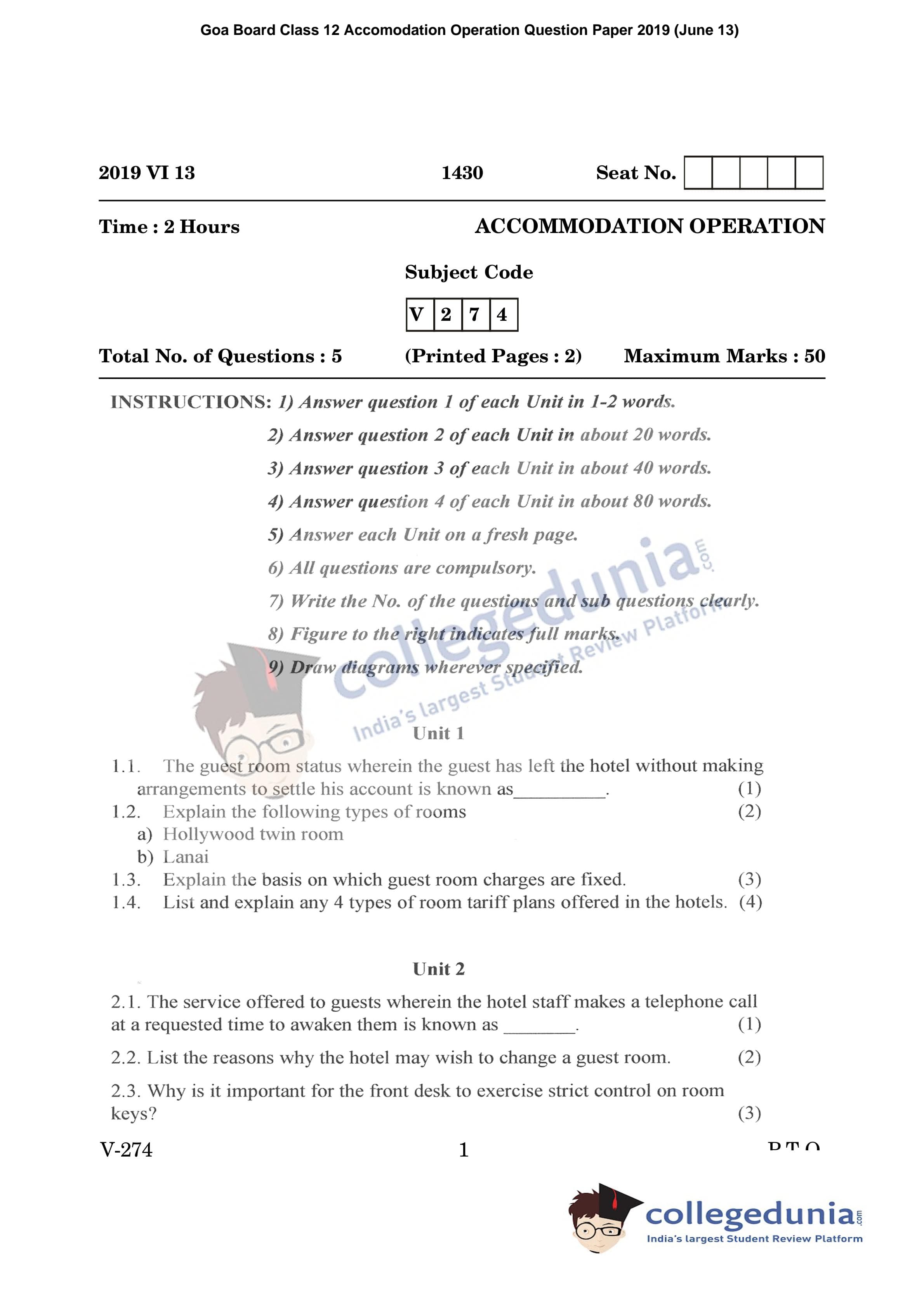 | Goa Board HSSC Accomodation Operation Question Paper 2019 PDF | Goa Board HSSC Accomodation Operation Answer Key 2019 PDF |