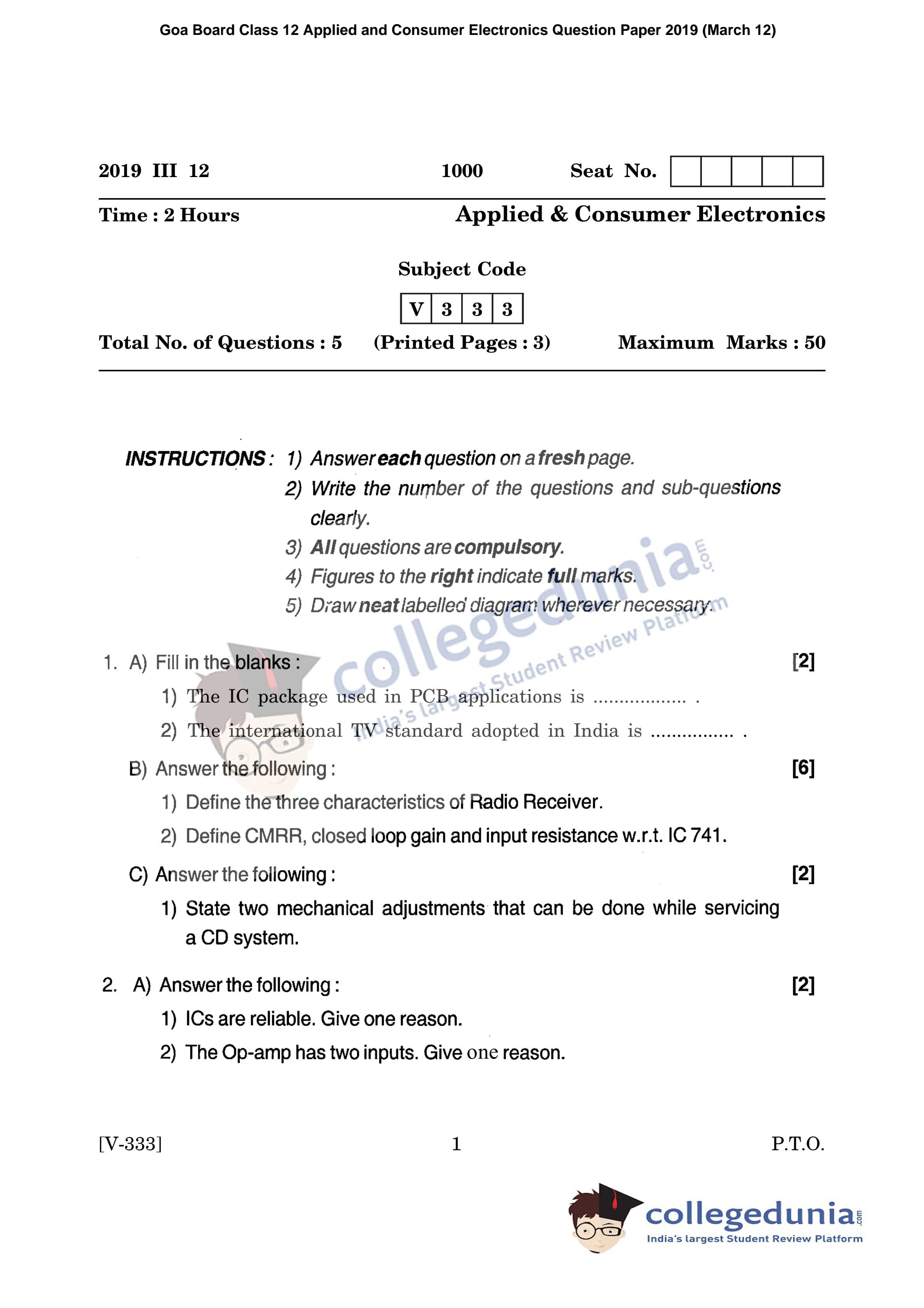 Goa Board HSSC Applied and Consumer Electronics Question Paper 2019 with Answer Key (March 12)