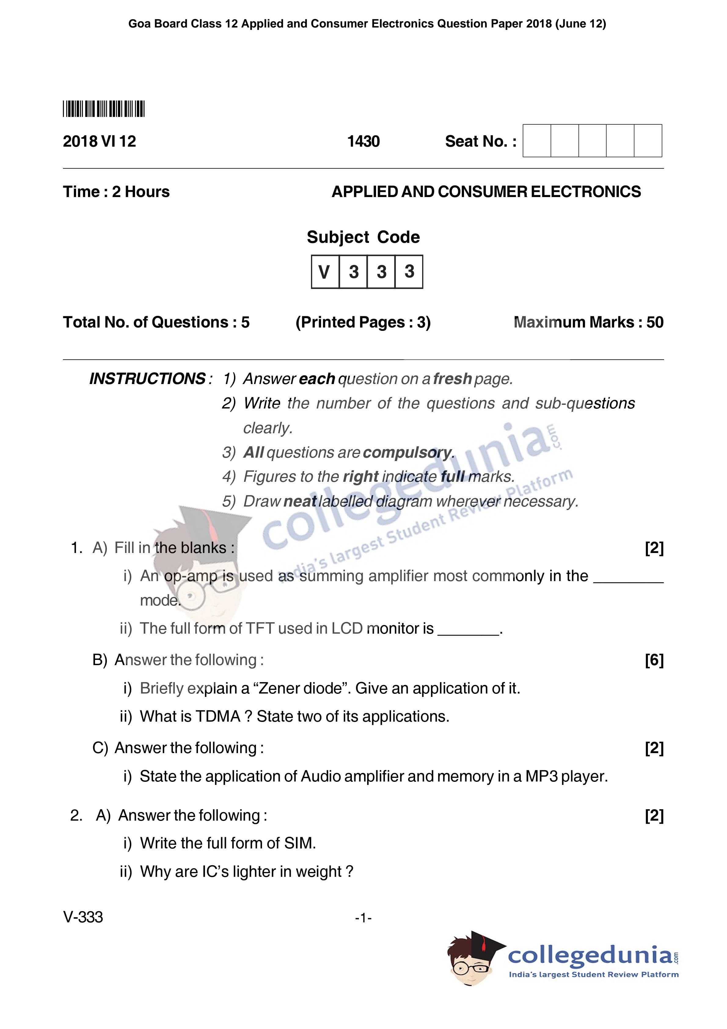 | Goa Board HSSC Applied and Consumer Electronics Question Paper 2018 PDF | Goa Board HSSC Applied and Consumer Electronics Answer Key 2018 PDF |