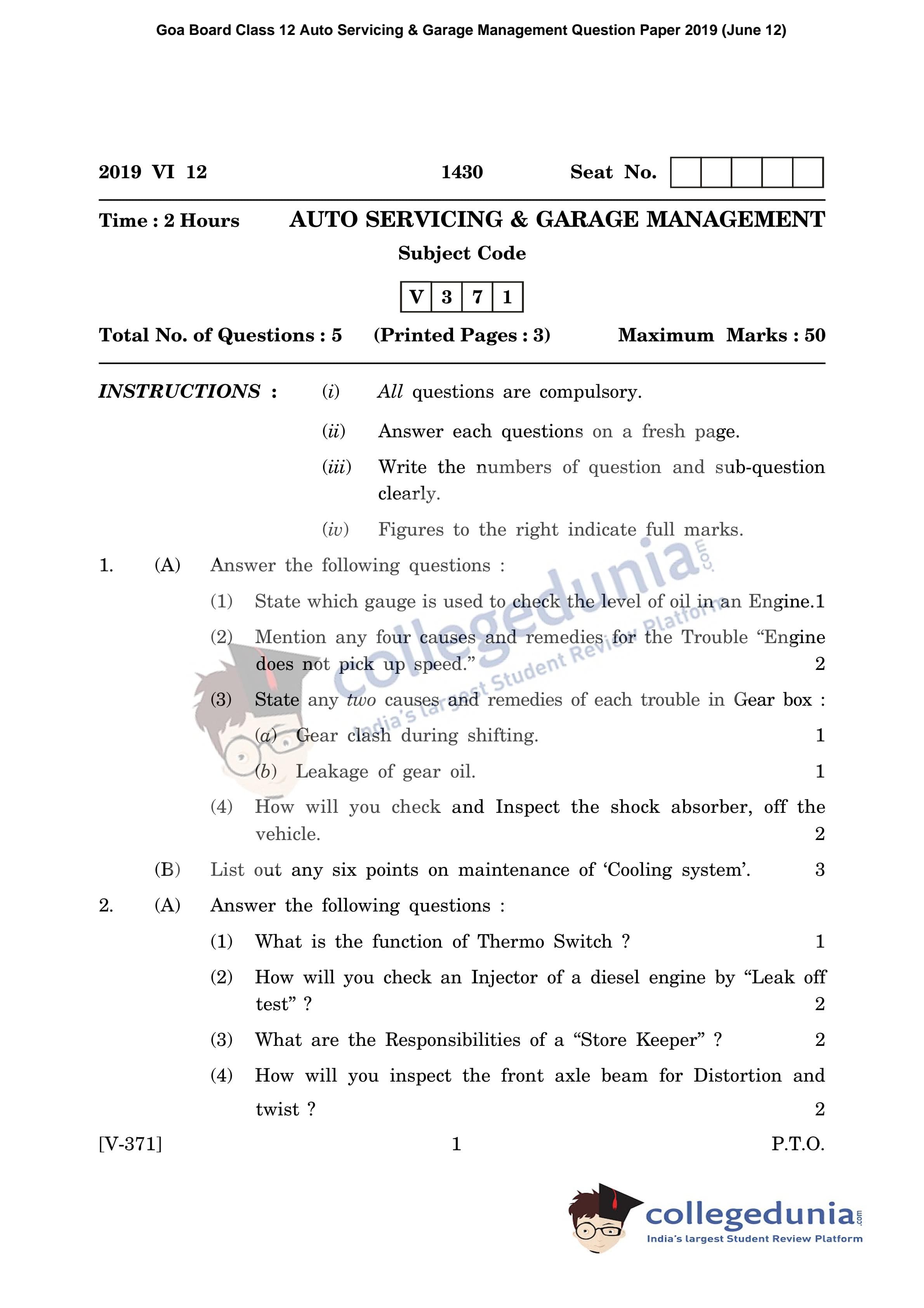 | Goa Board HSSC Auto Servicing & Garage Management Question Paper 2019 PDF | Goa Board HSSC Auto Servicing & Garage Management Answer Key 2019 PDF |