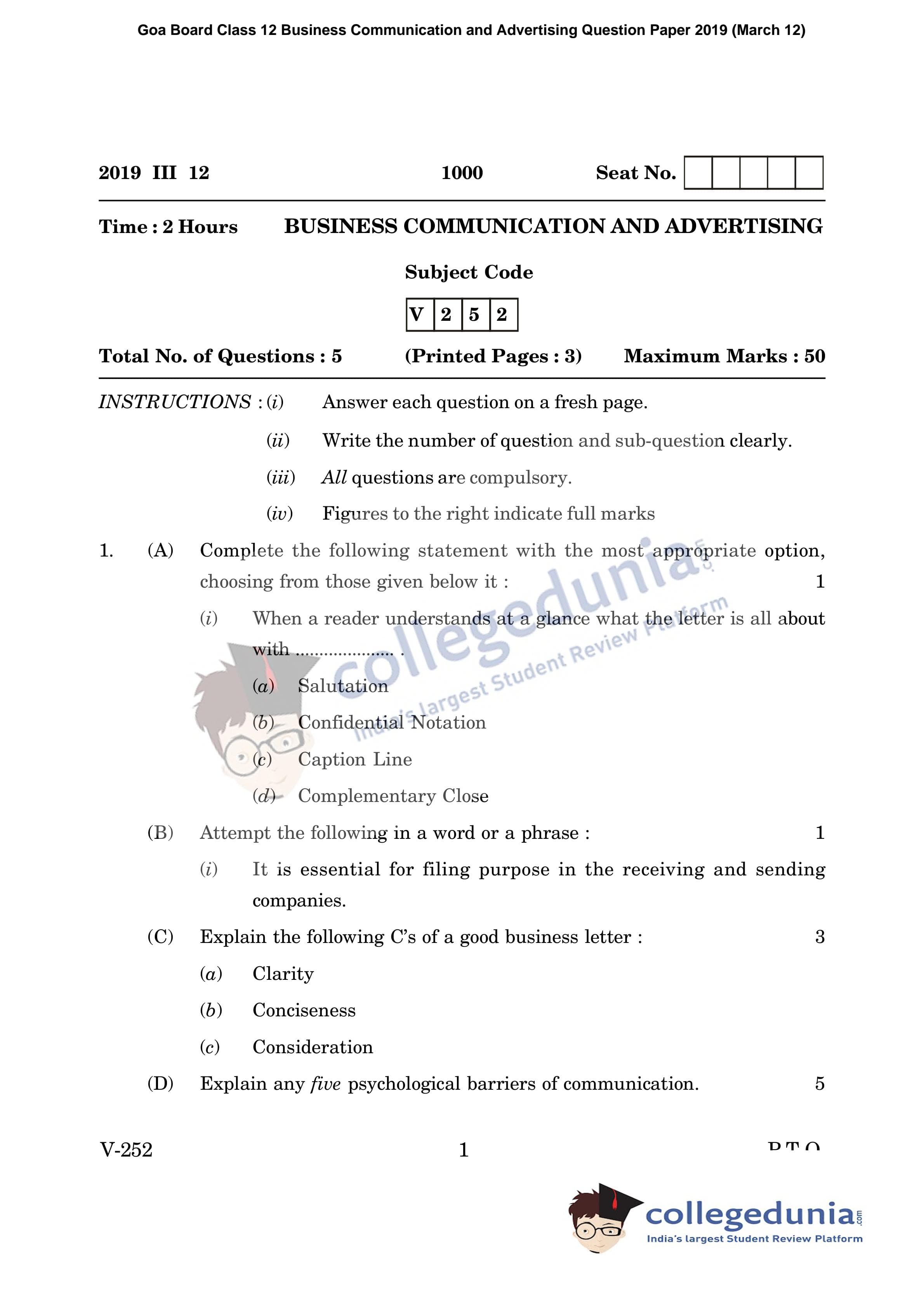 Goa Board HSSC Business Communication and Advertising Question Paper 2019 with Answer Key is available for download. The exam was conducted by the Goa Board of Secondary and Higher Secondary Education (GBSHSE) on March 12, 2019 in the Morning Session 10 AM to 12 PM. The medium of paper was English. The question paper comprised a total of 5 questions.