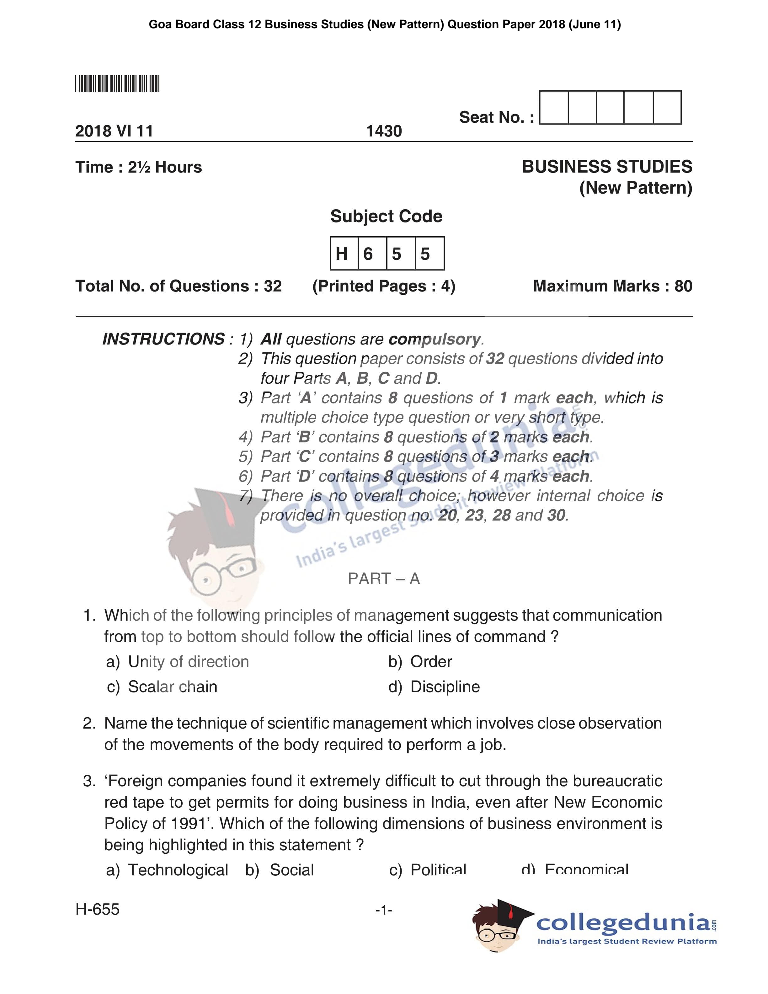 | Goa Board HSSC Business Studies (New Pattern) Question Paper 2018 PDF | Goa Board HSSC Business Studies (New Pattern) Answer Key 2018 PDF |