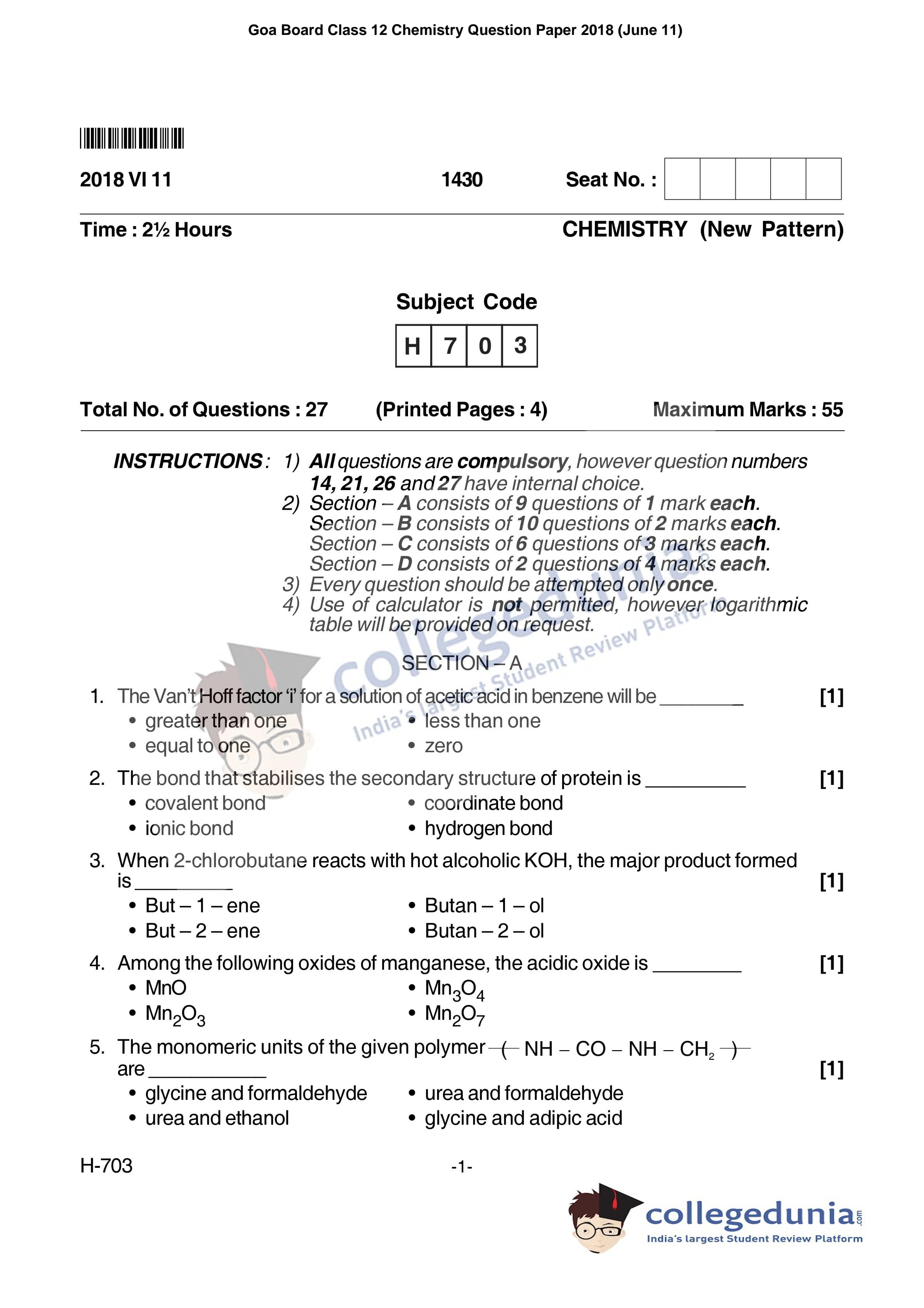 | Goa Board HSSC Chemistry Question Paper 2018 PDF | Goa Board HSSC Chemistry Answer Key 2018 PDF |