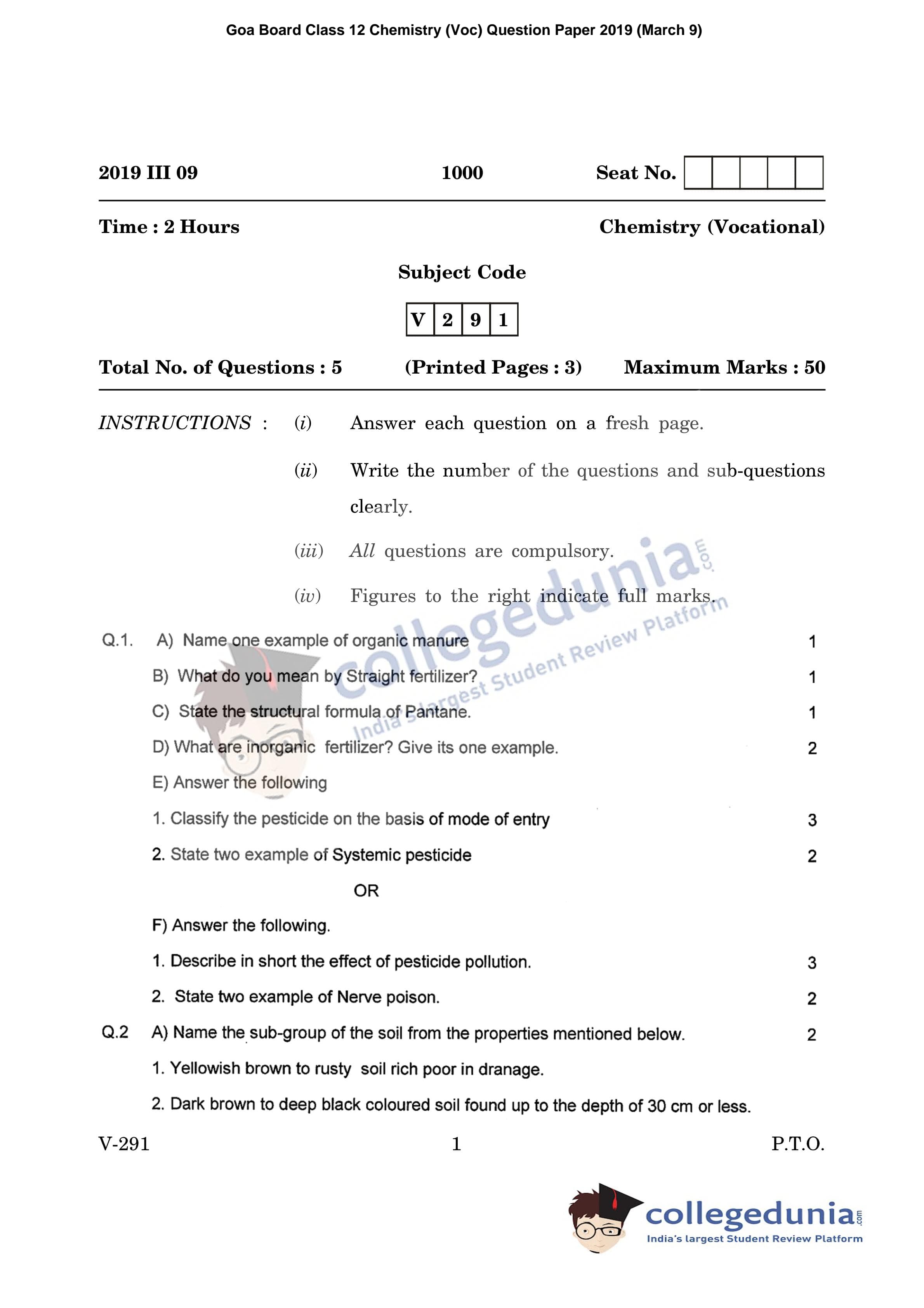 Goa Board HSSC Chemistry (Voc) Question Paper 2019 with Answer Key (March 9)