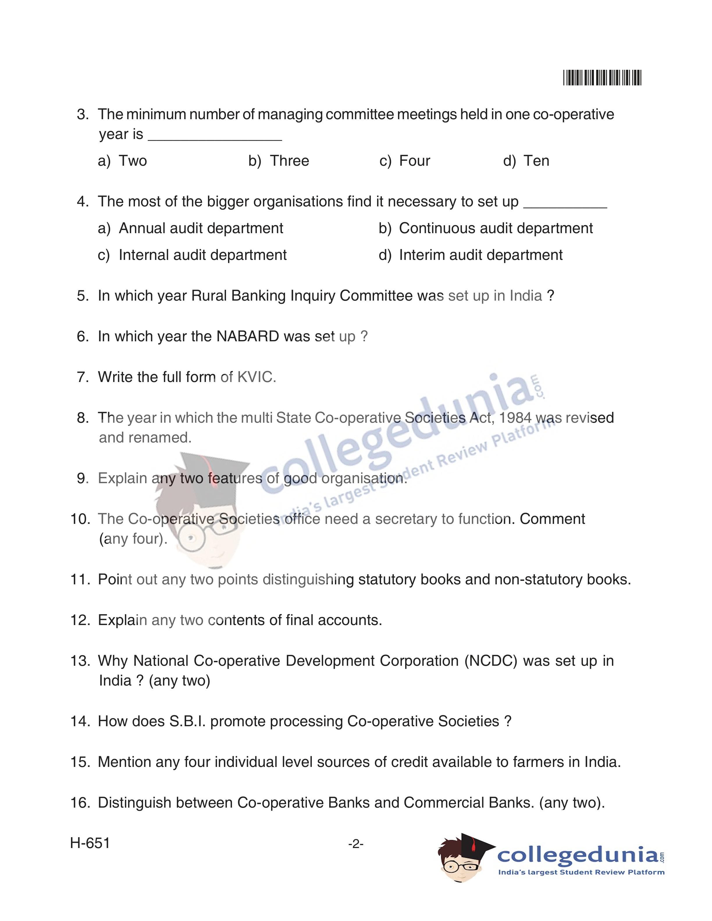 Goa Board HSSC Co-operation Supplementary Question Paper 2018 with Answer Key (June 13)
