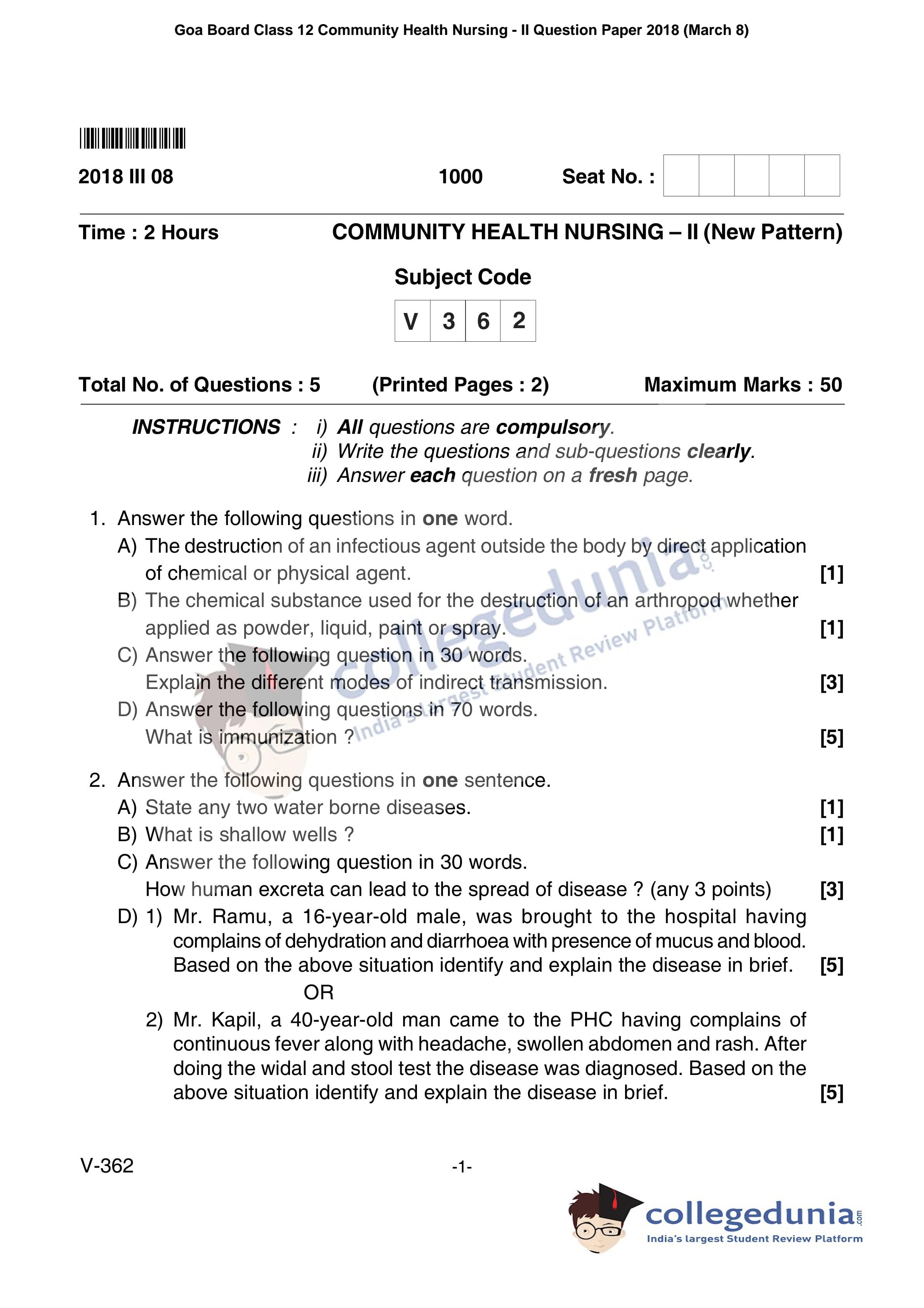 Goa Board HSSC Community Health Nursing - II Question Paper 2018 with Answer Key (March 8)