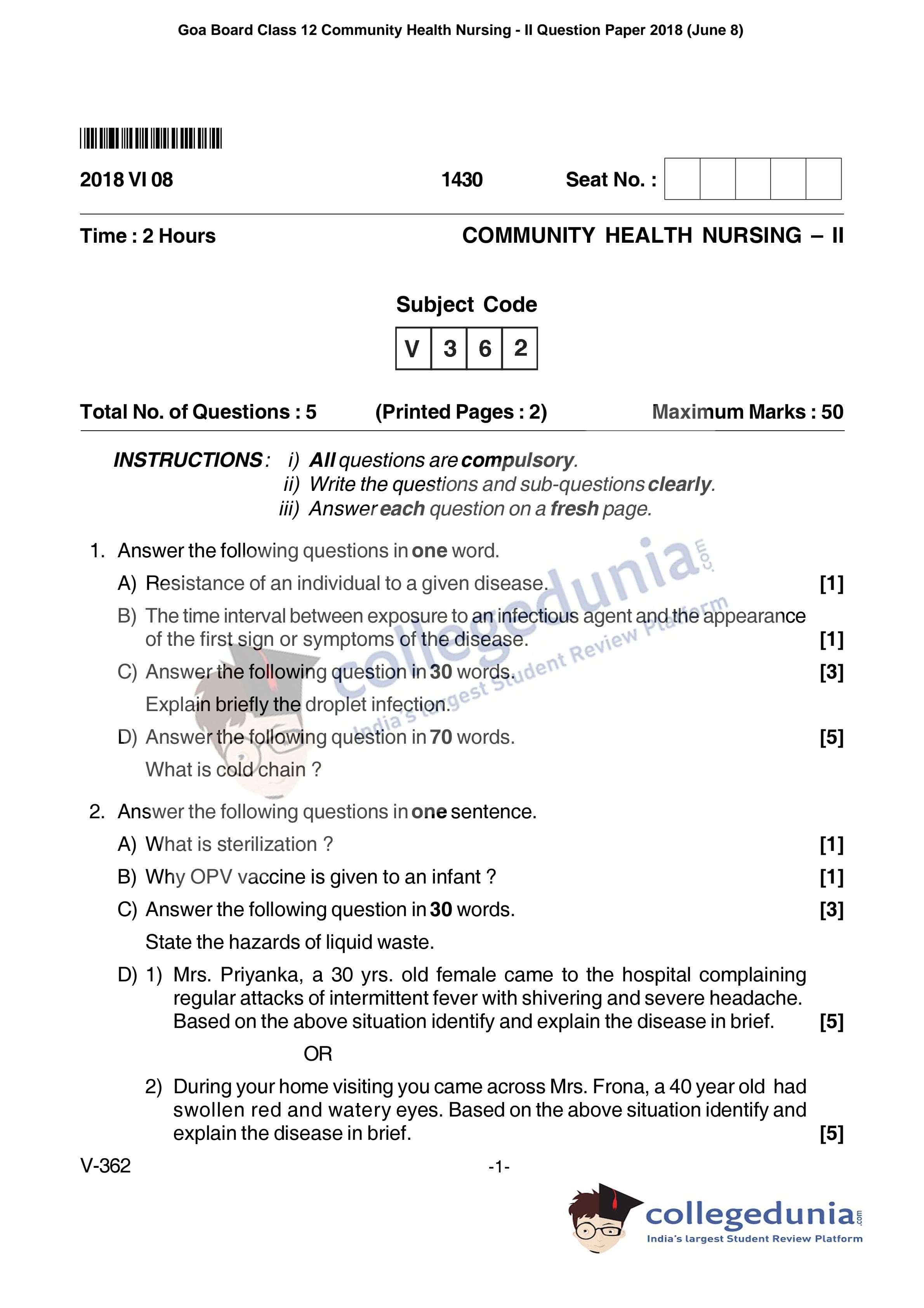 | Goa Board HSSC Community Health Nursing - II Question Paper 2018 PDF | Goa Board HSSC Community Health Nursing - II Answer Key 2018 PDF |