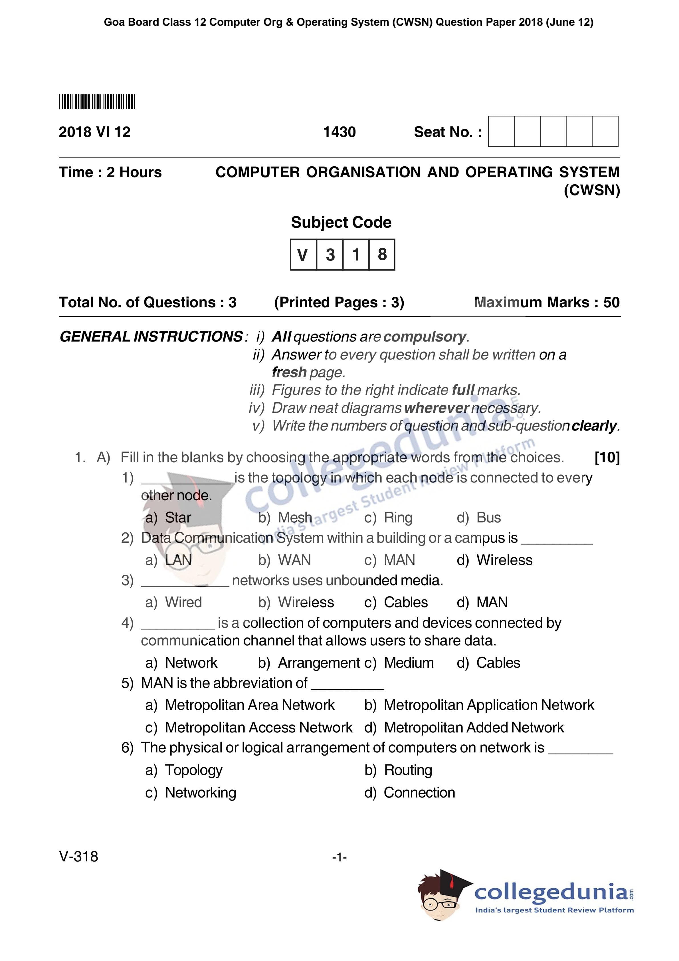 Goa Board HSSC Computer Org & Operating System (CWSN) Supplementary Question Paper 2018 with Answer Key (June 12)