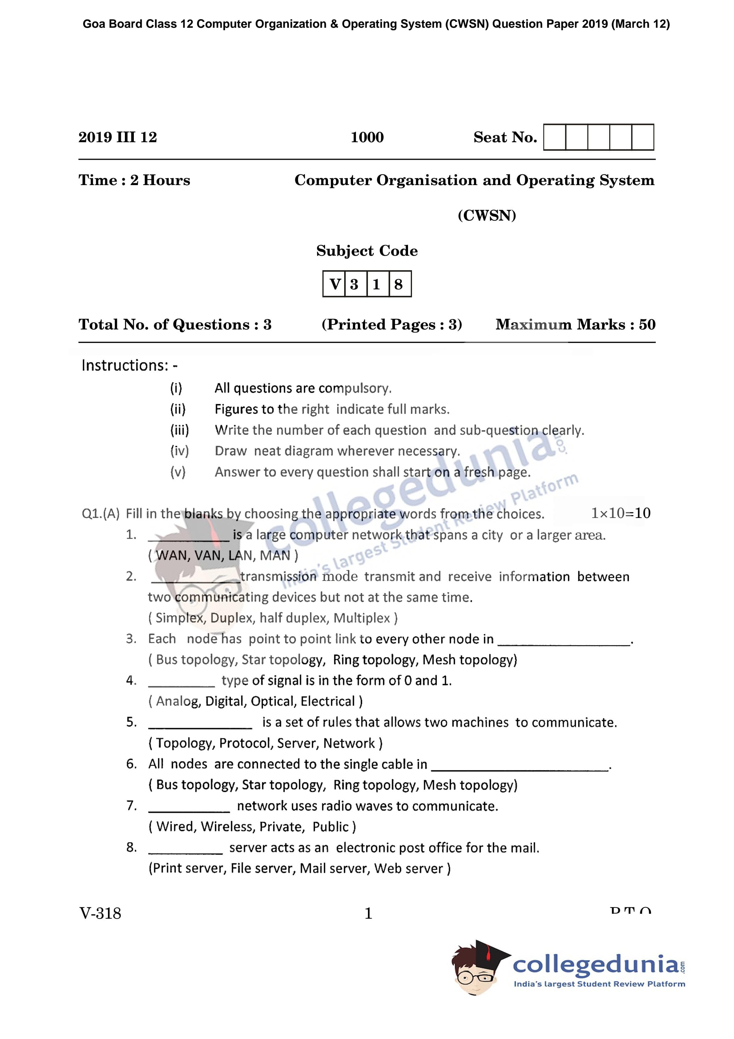 Goa Board HSSC Computer Organization & Operating System (CWSN) Question Paper 2019 with Answer Key (March 12)