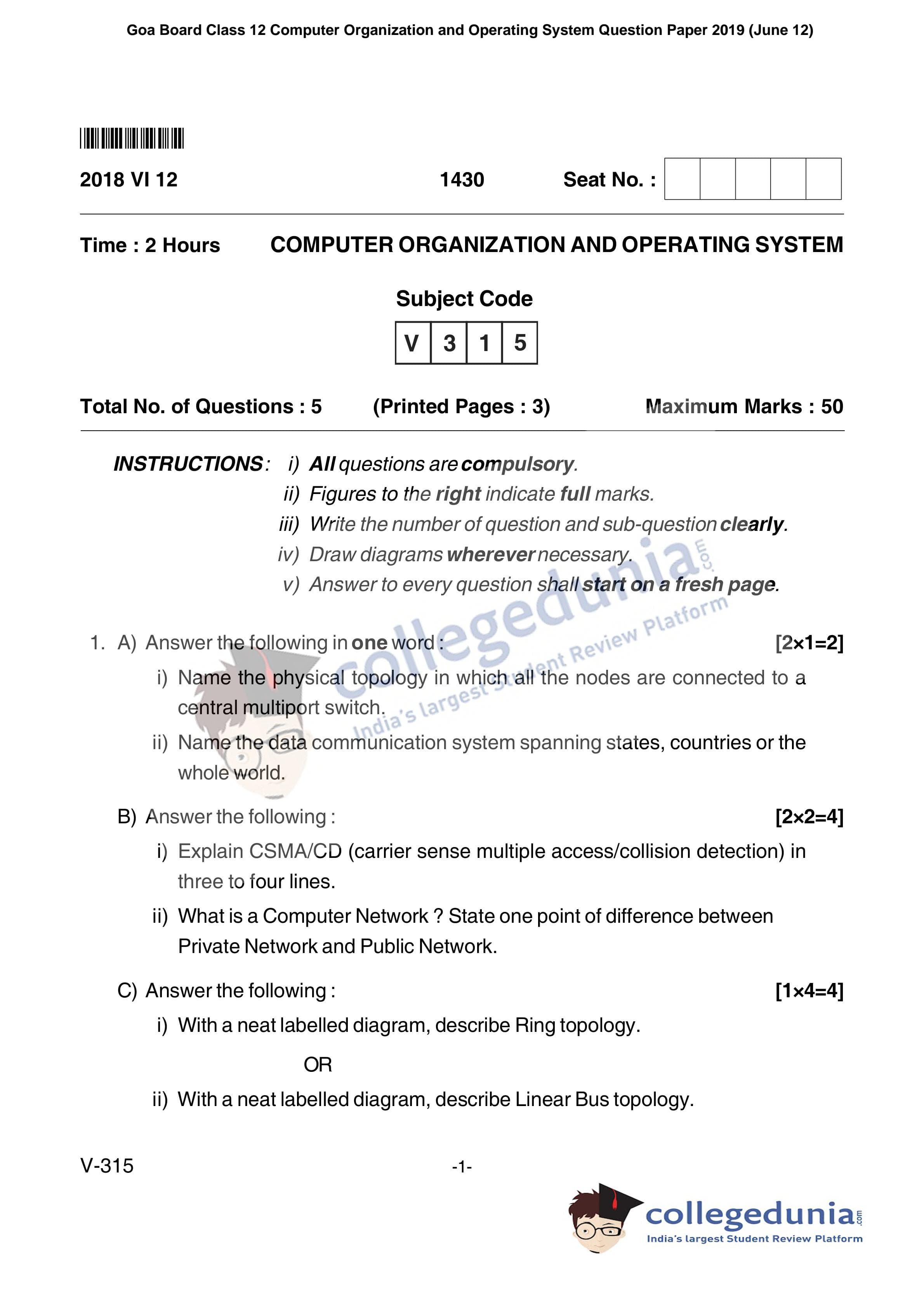 Goa Board HSSC Computer Organization and Operating System Supplementary Question Paper 2019 with Answer Key (June 12)