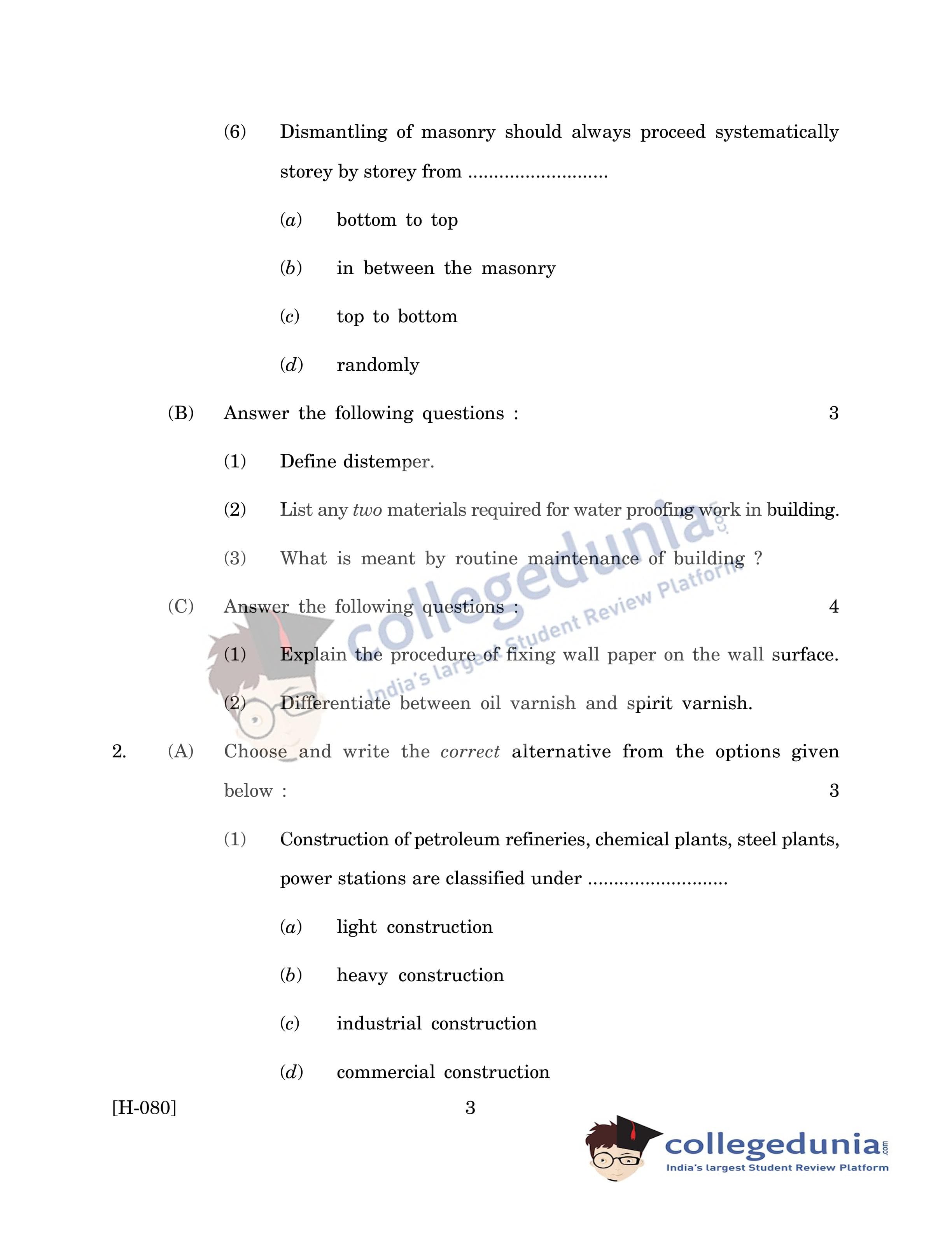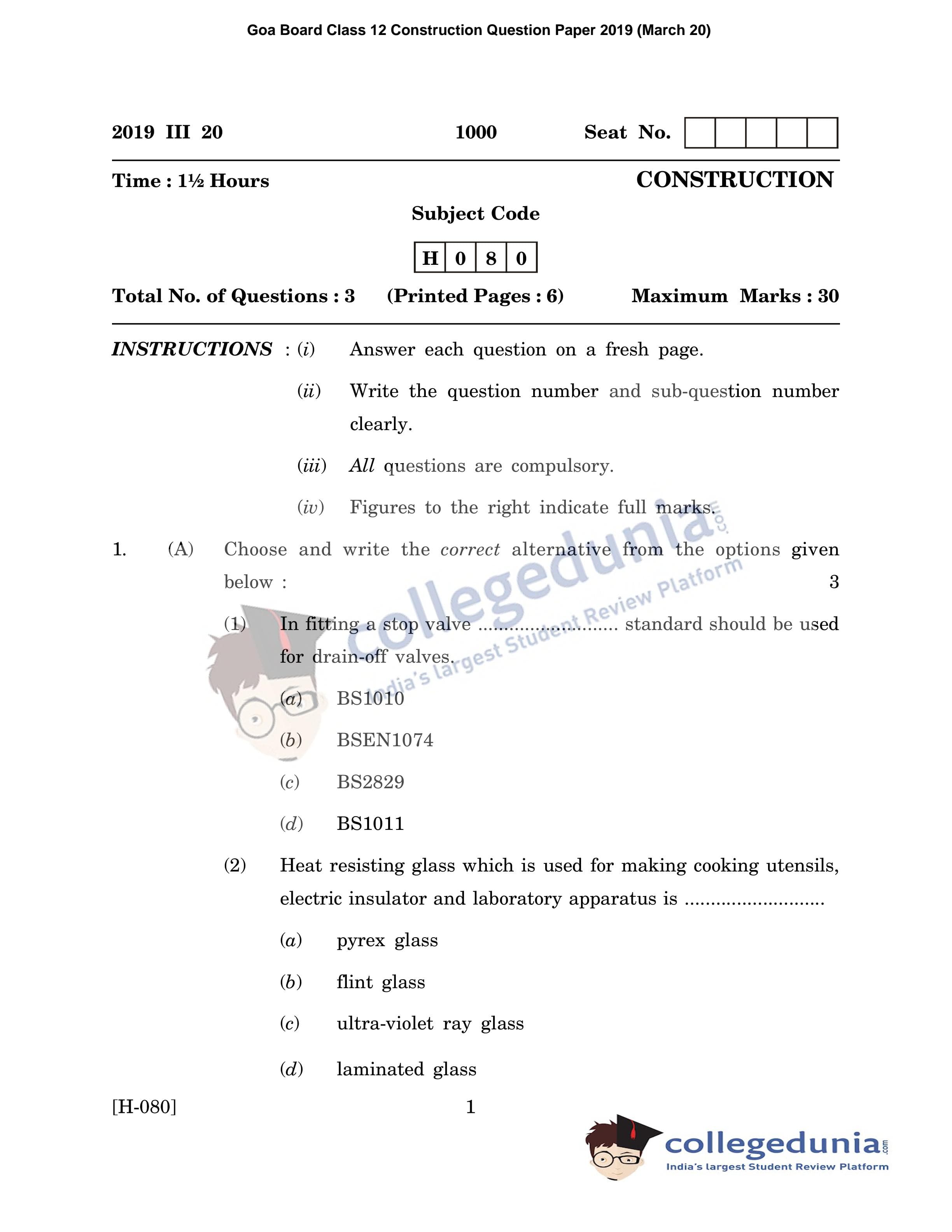 Goa Board HSSC Construction Question Paper 2019 with Answer Key (March 20)