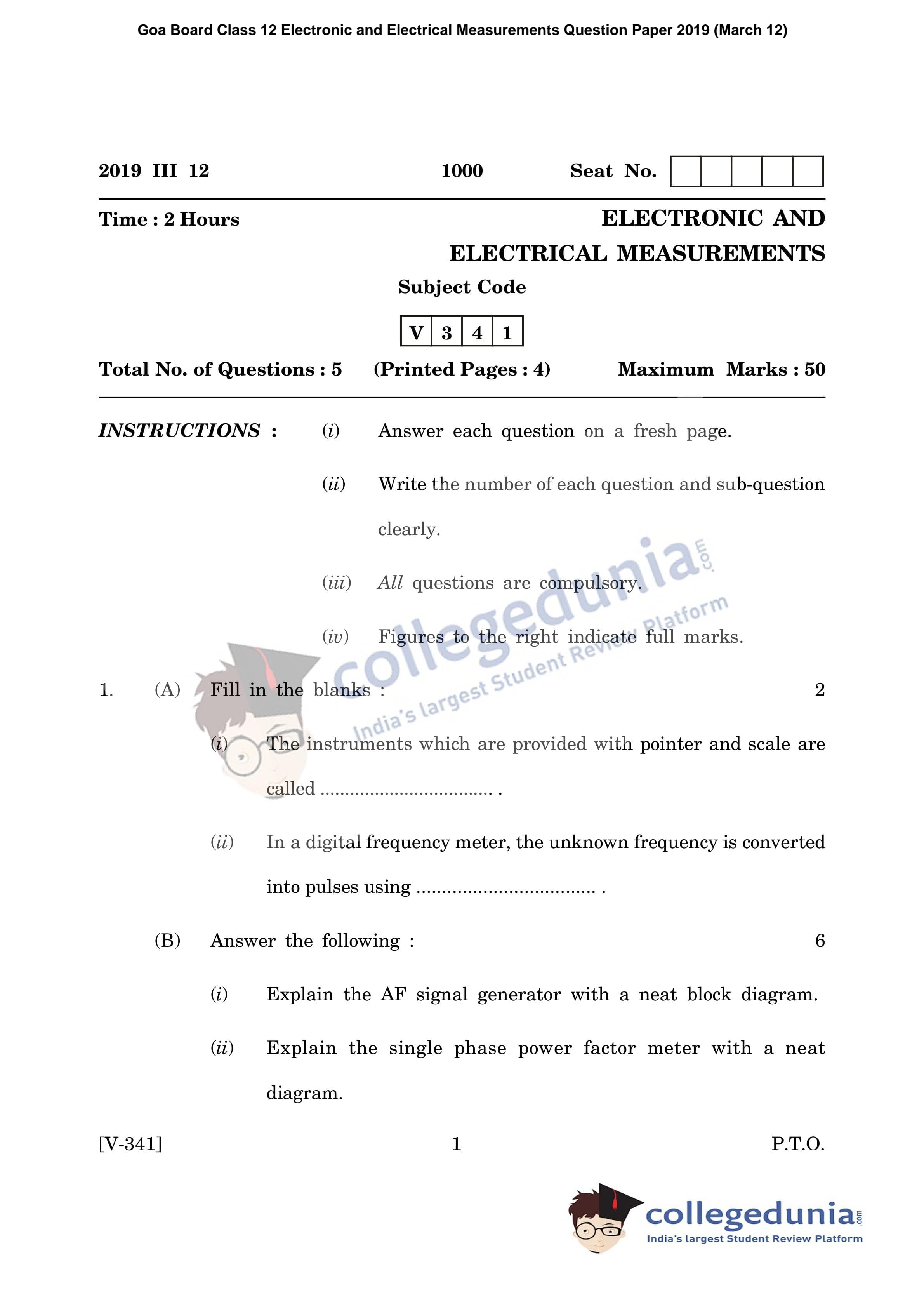 Goa Board HSSC Electronic and Electrical Measurements Question Paper 2019 with Answer Key (March 12)