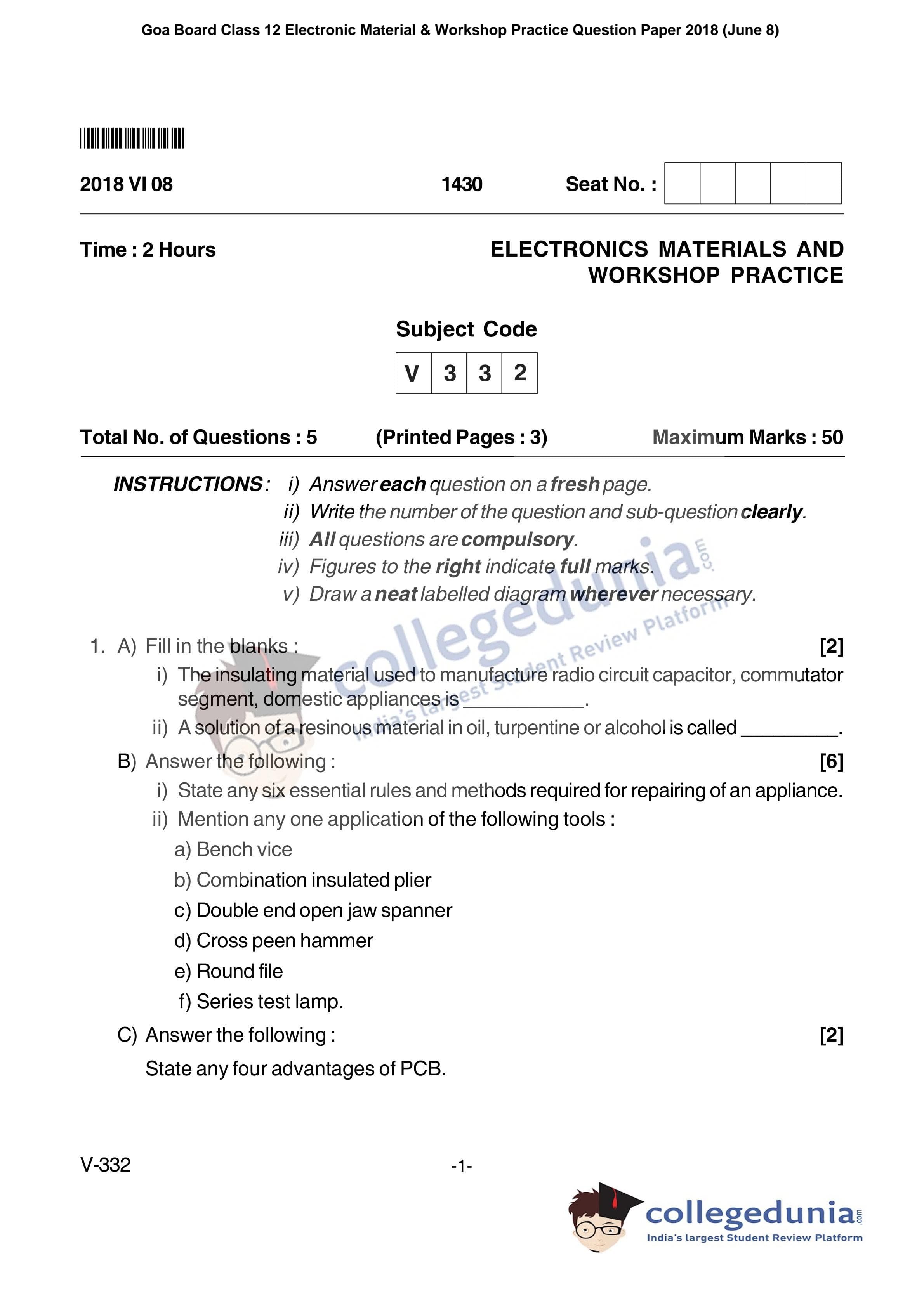 | Goa Board HSSC Electronic Material & Workshop Practice Question Paper 2018 PDF | Goa Board HSSC Electronic Material & Workshop Practice Answer Key 2018 PDF |