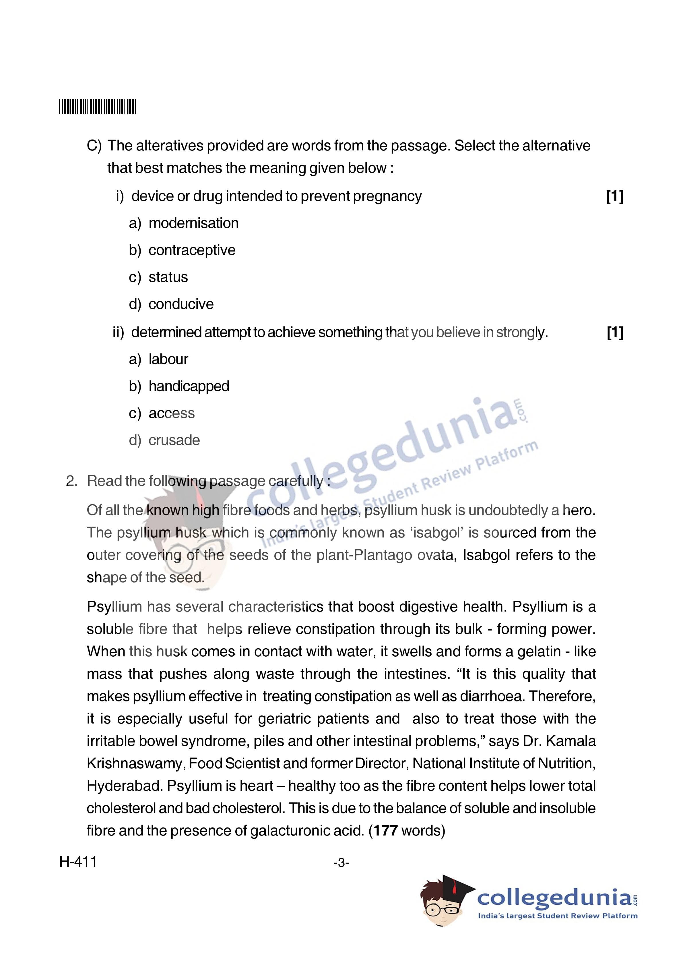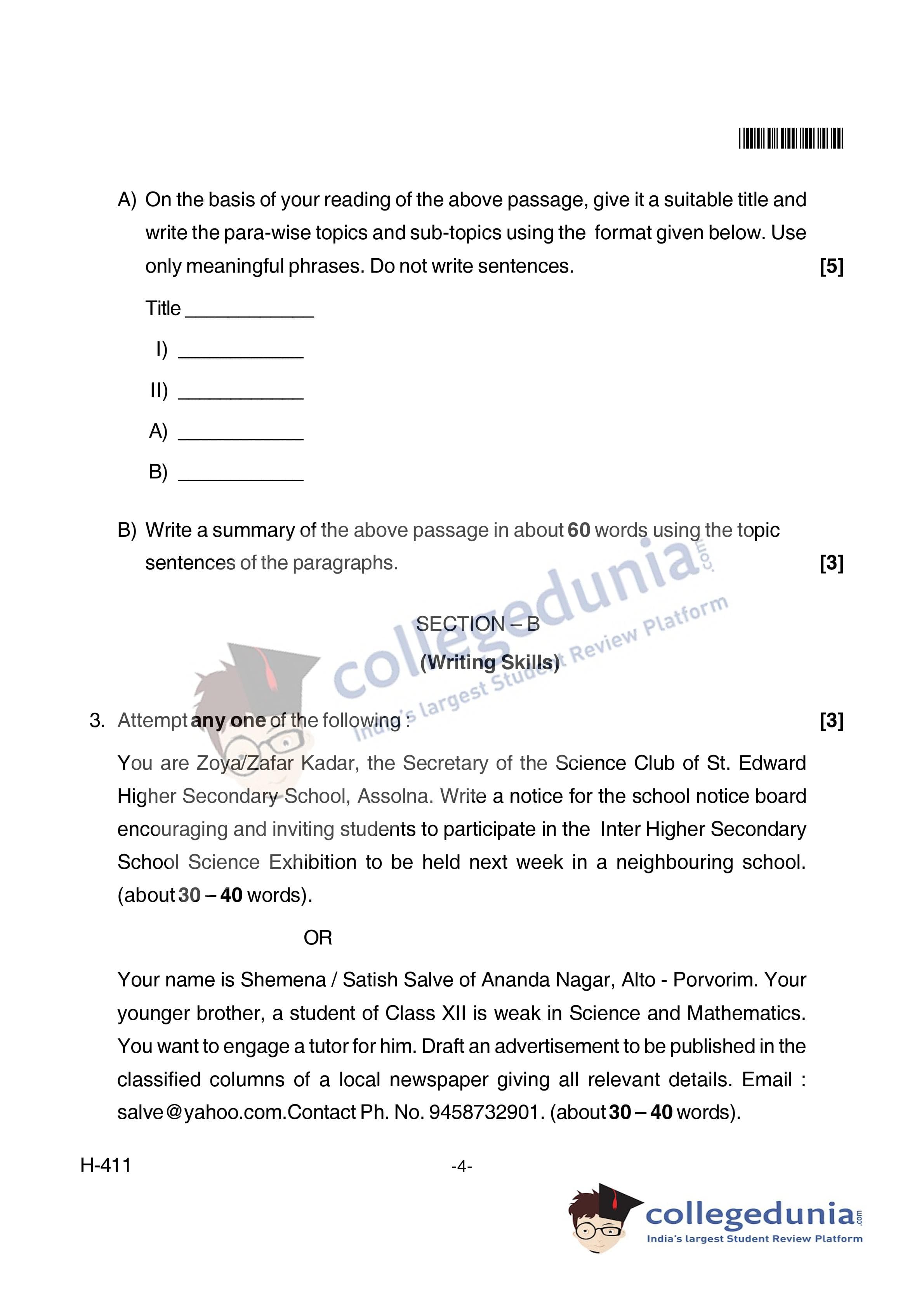 Goa Board HSSC English I Supplementary Question Paper 2018 with Answer Key (June 7)