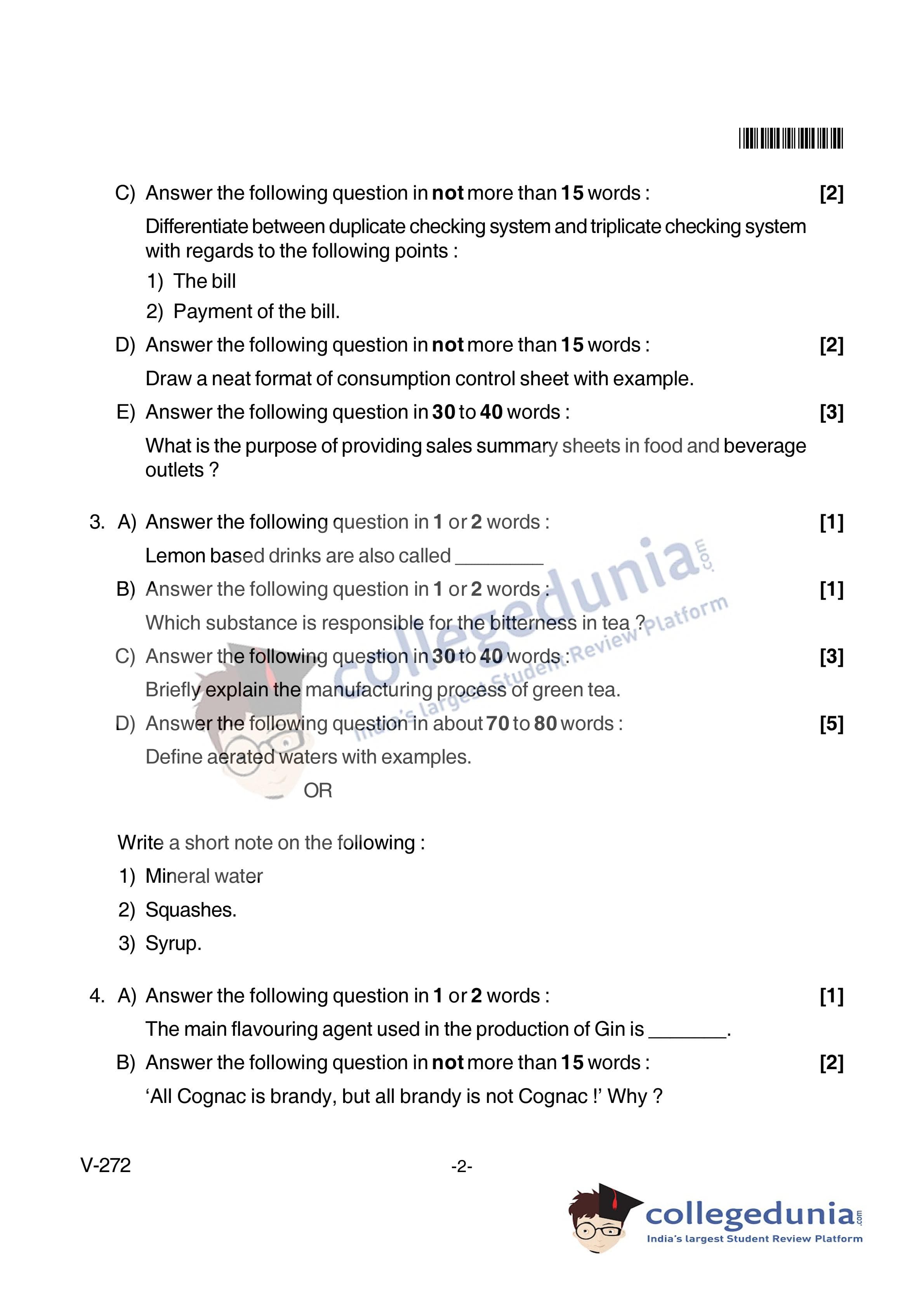 Goa Board HSSC Food & Beverage Service (Old) Question Paper 2018 with Answer Key (March 15)