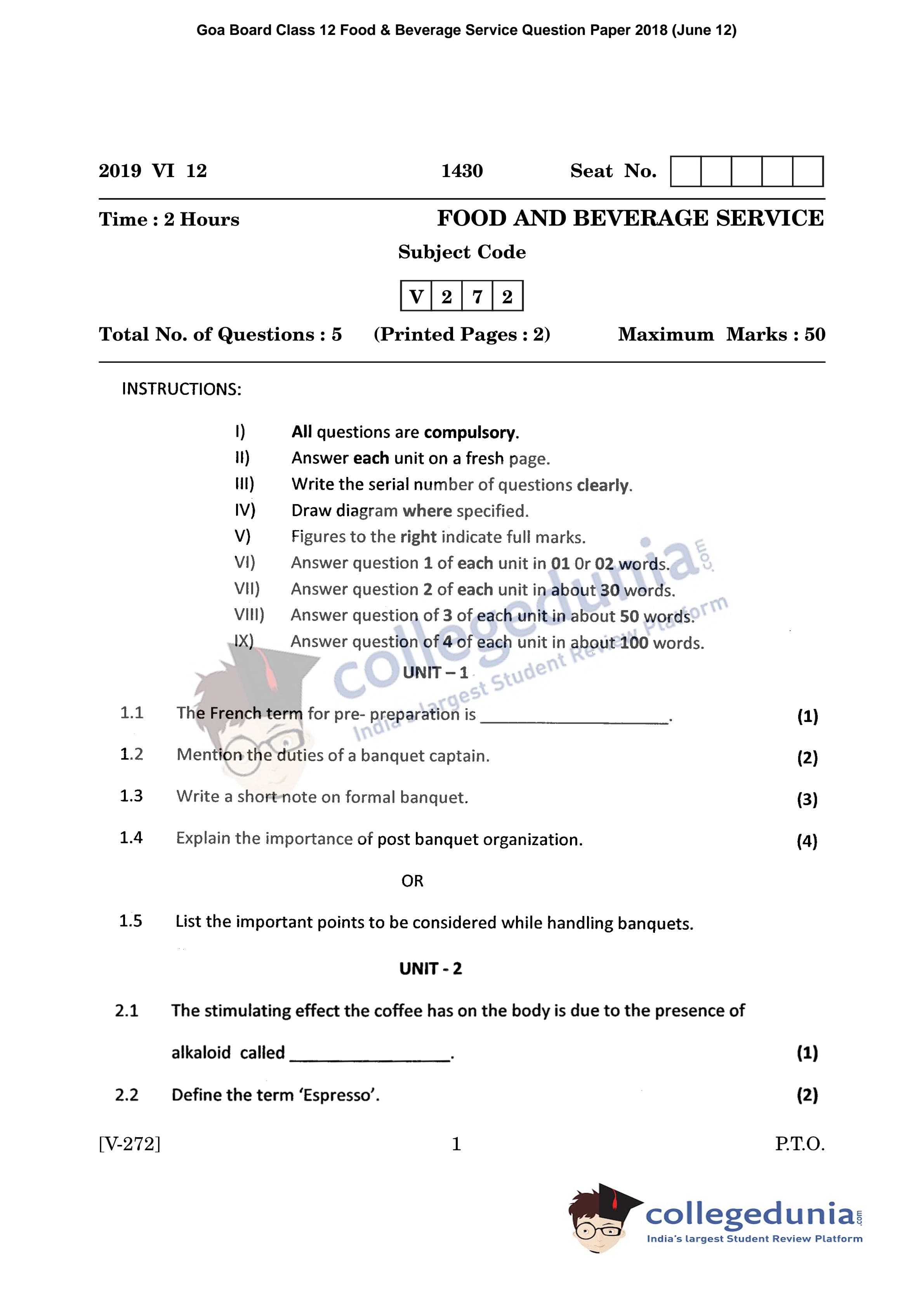 | Goa Board HSSC Food & Beverage Service Question Paper 2018 PDF | Goa Board HSSC Food & Beverage Service Answer Key 2018 PDF |