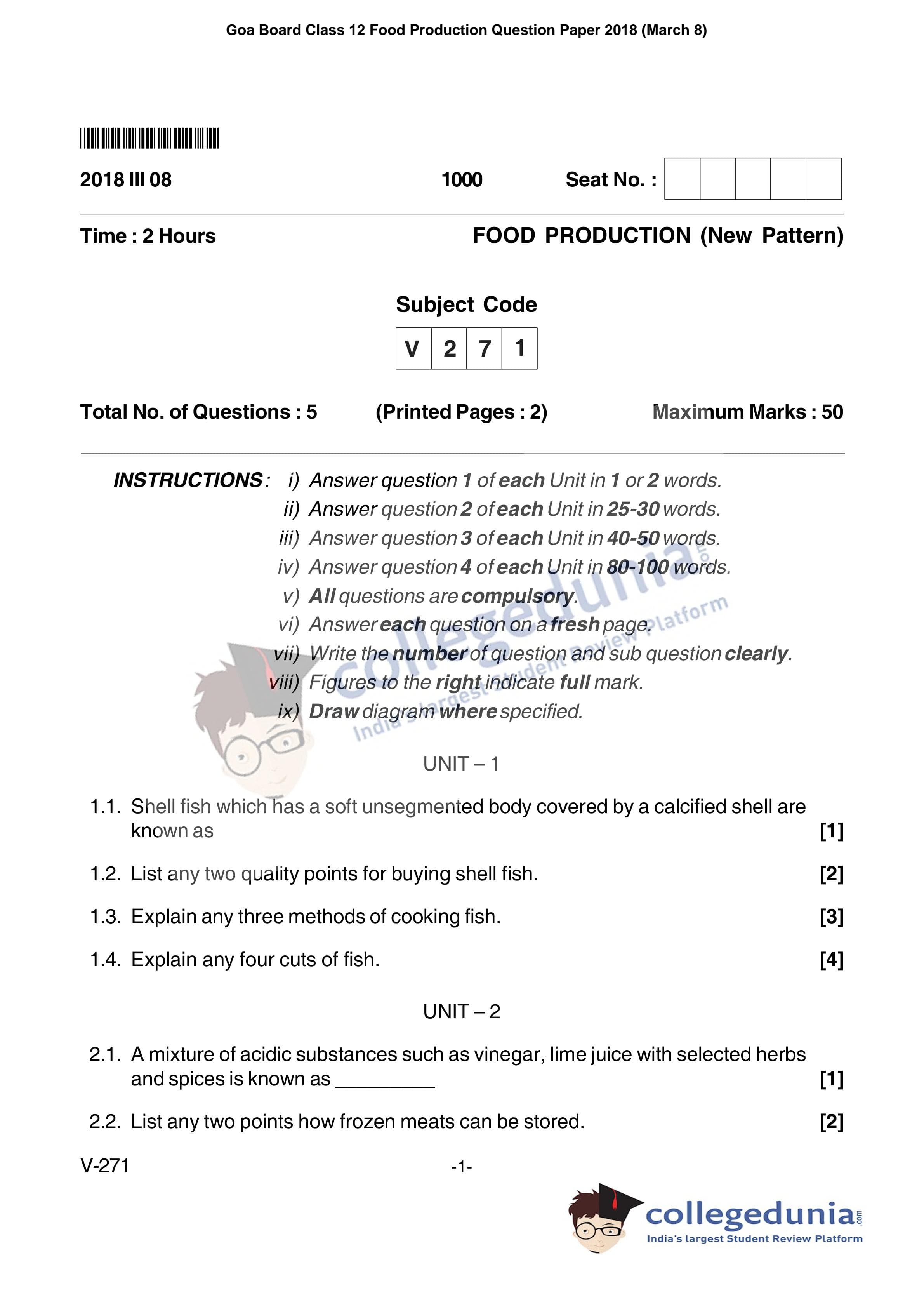 Goa Board HSSC Food Production Question Paper 2018 with Answer Key is available for download. The exam was conducted by the Goa Board of Secondary and Higher Secondary Education (GBSHSE) on March 8, 2018 in the Morning Session 10 AM to 12 PM. The medium of paper was English. The question paper comprised a total of 5 questions.