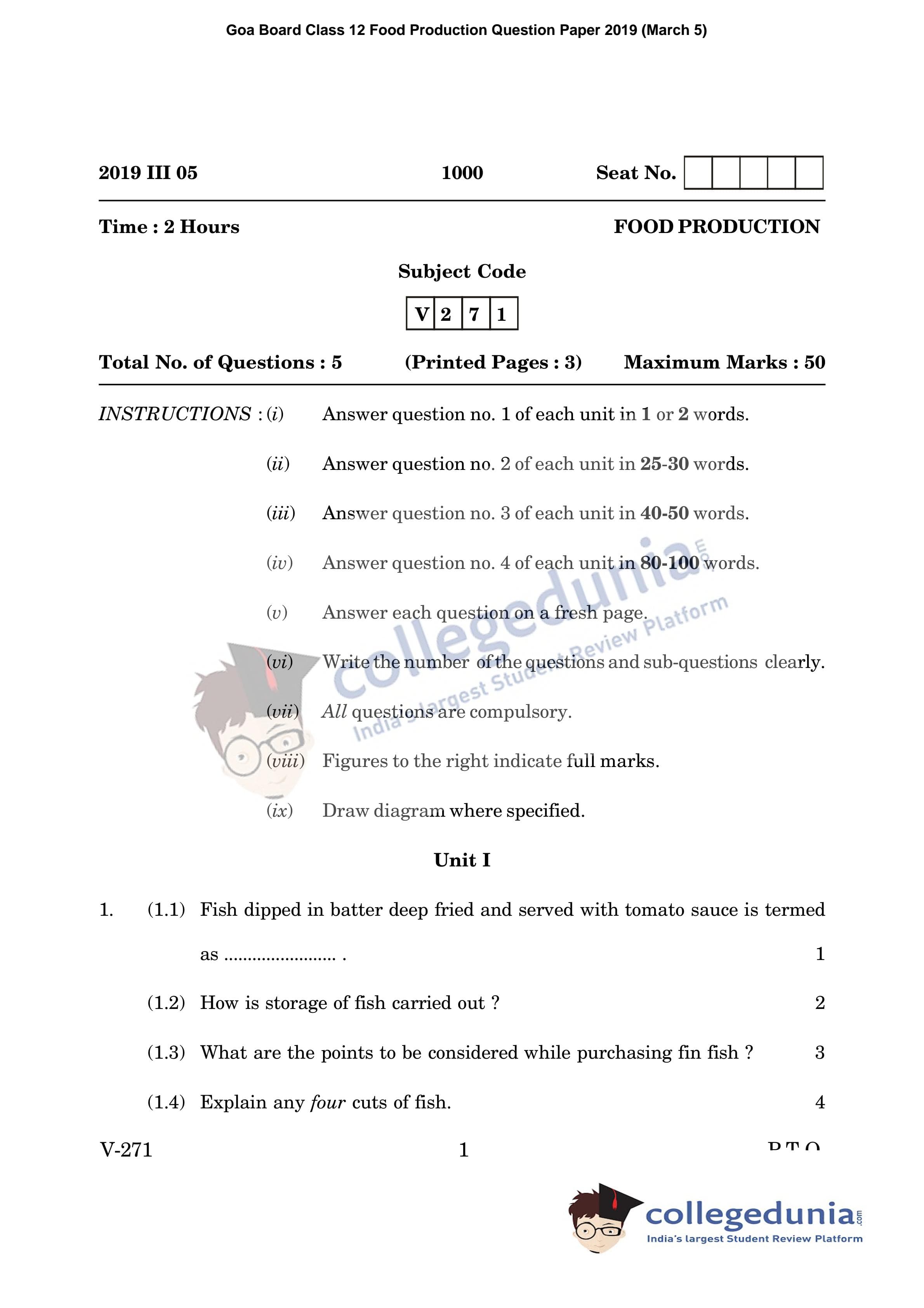 Goa Board HSSC Food Production Question Paper 2019 with Answer Key (March 5)