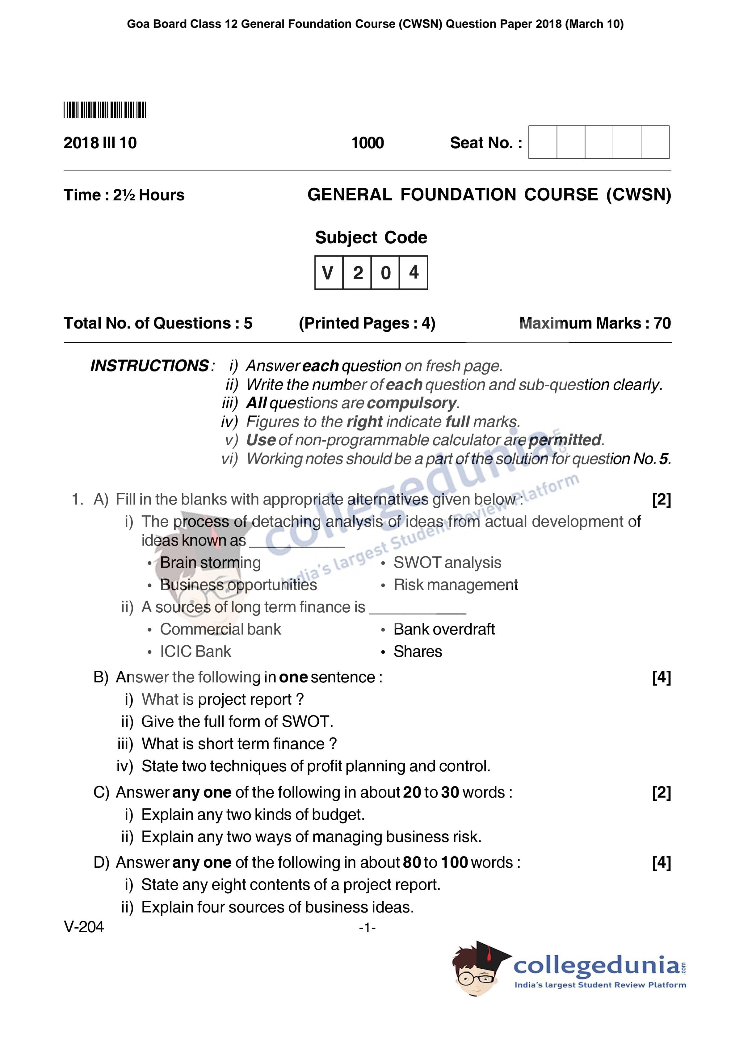 Goa Board HSSC General Foundation Course (CWSN) Question Paper 2018 with Answer Key (March 10)