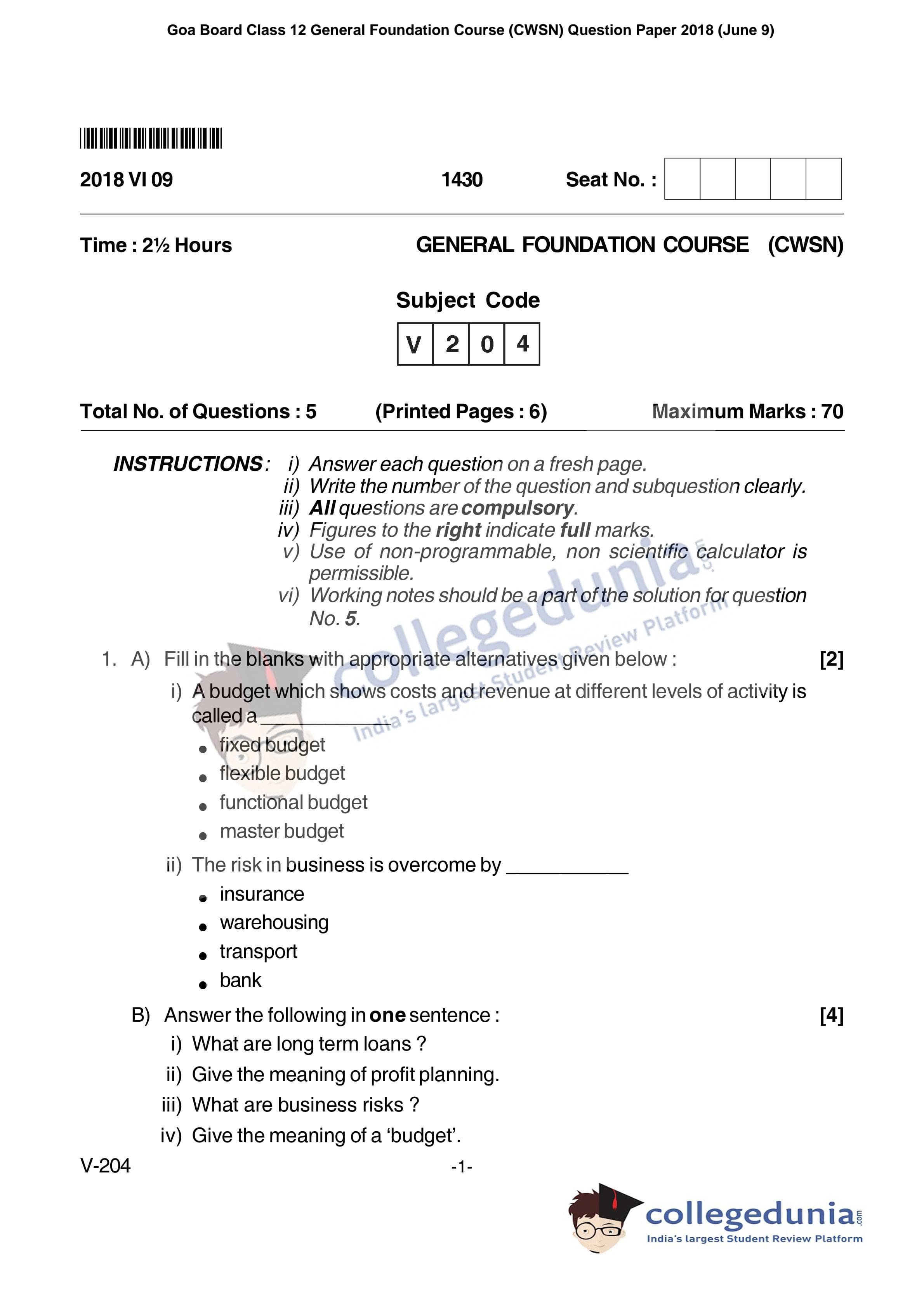 | Goa Board HSSC General Foundation Course (CWSN) Question Paper 2018 PDF | Goa Board HSSC General Foundation Course (CWSN) Answer Key 2018 PDF |