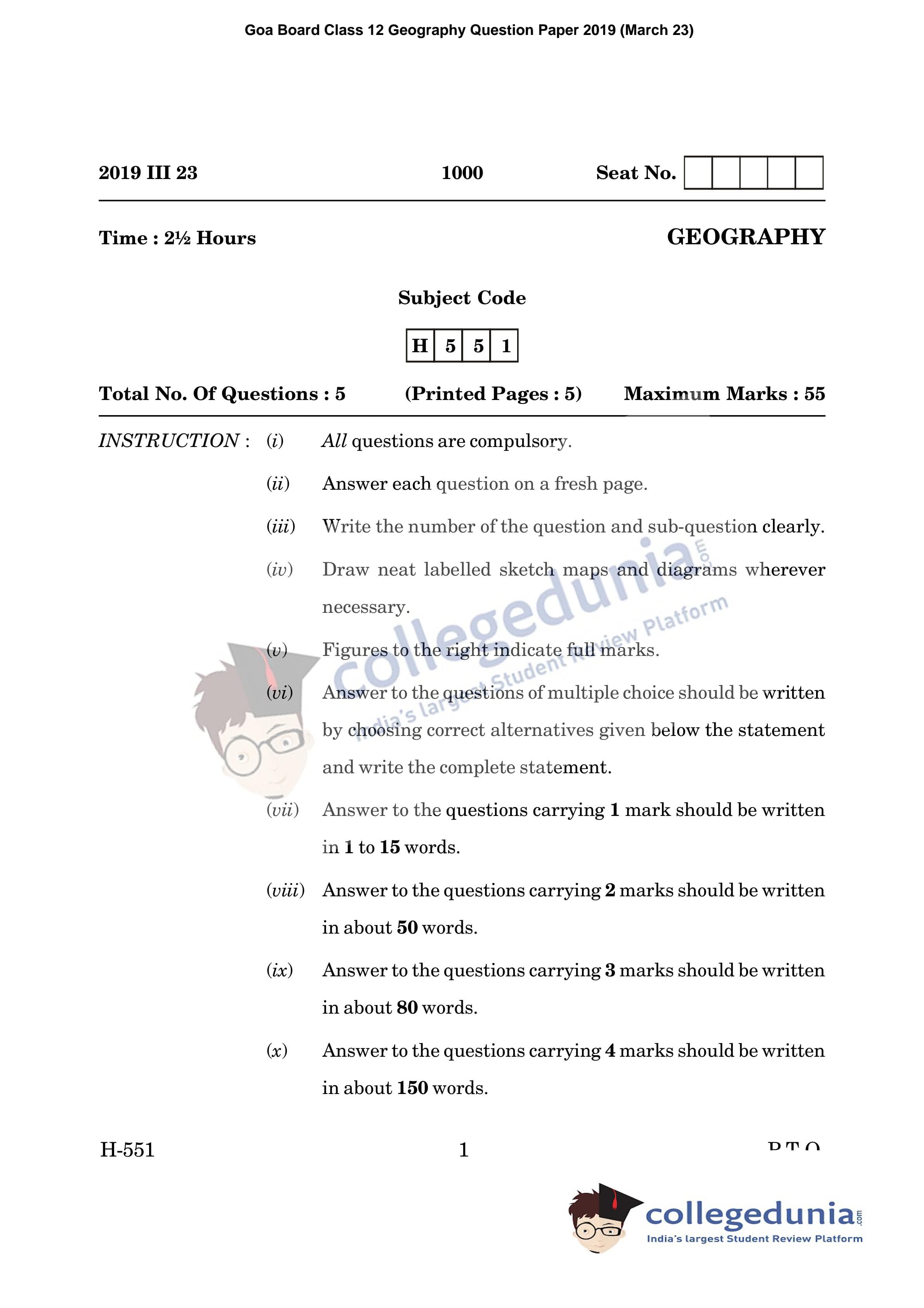 Goa Board HSSC Geography -CWSN Question Paper 2019 with Answer Key (March 23)
