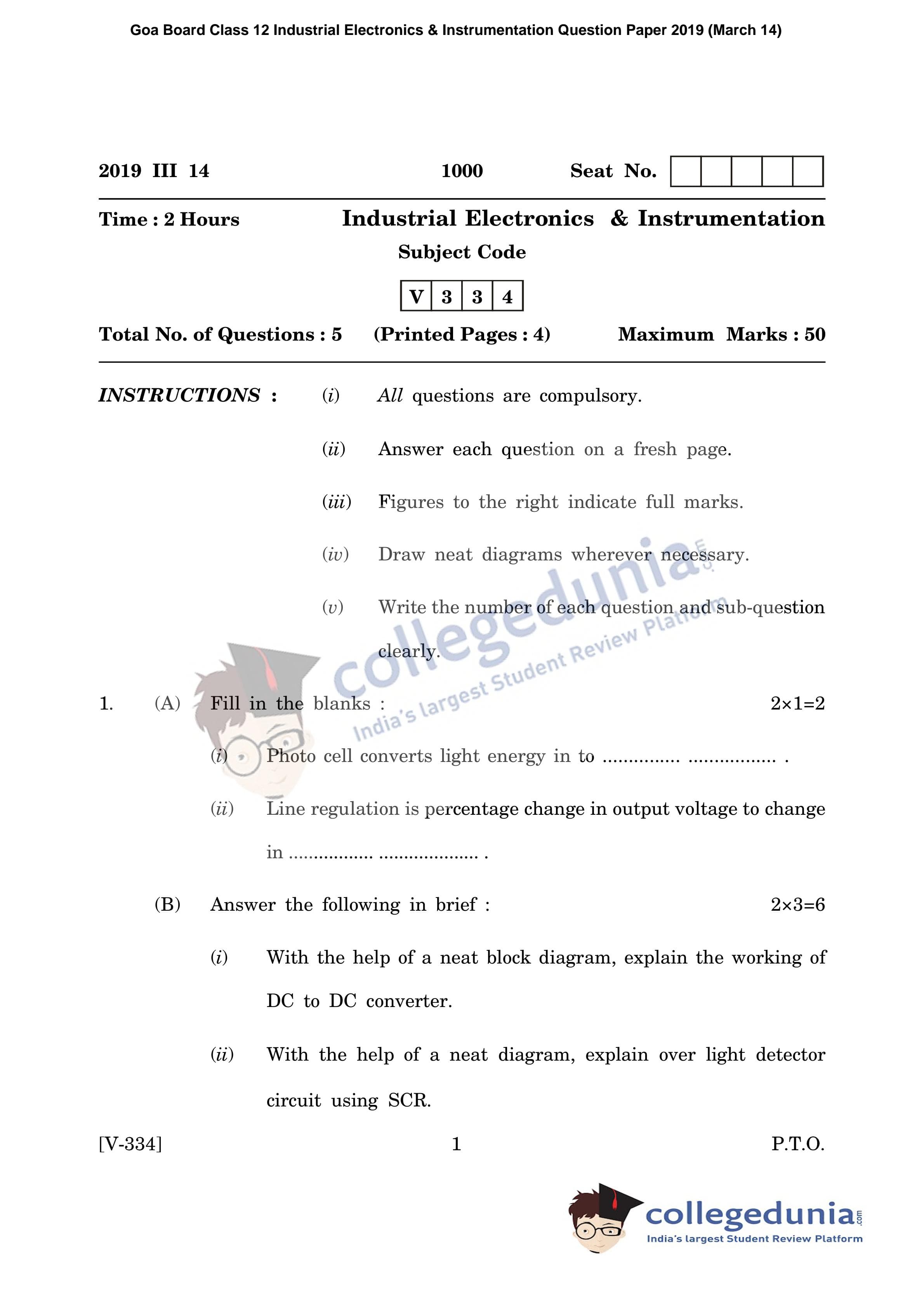 Goa Board HSSC Industrial Electronics & Instrumentation Question Paper 2019 with Answer Key (March 14)
