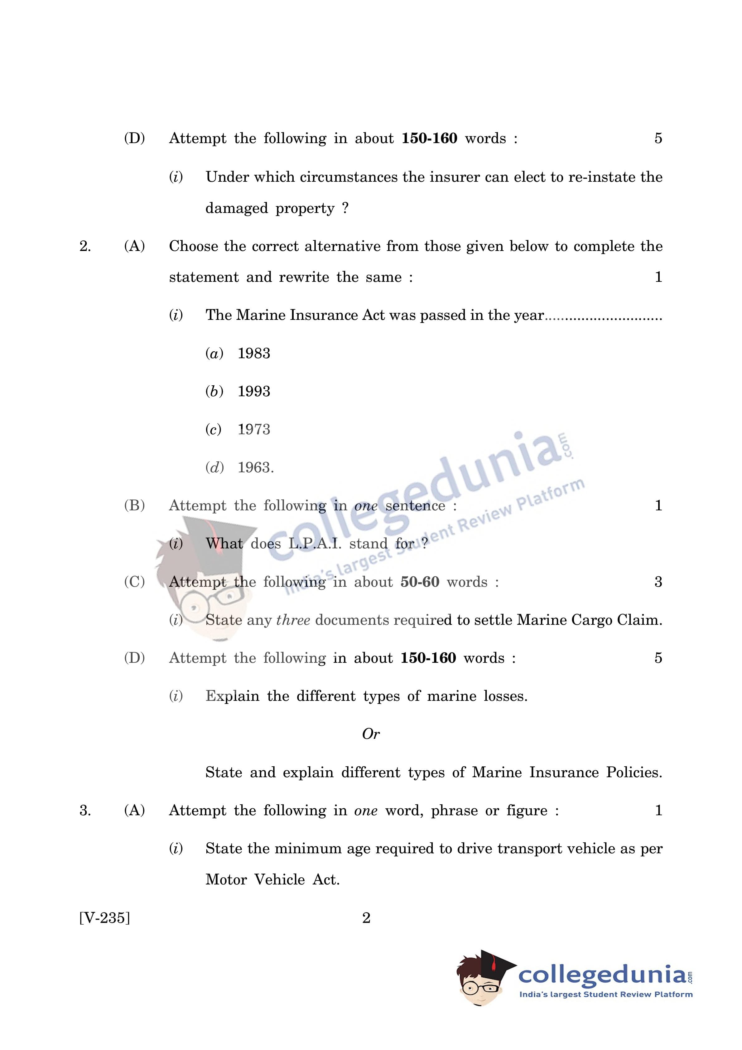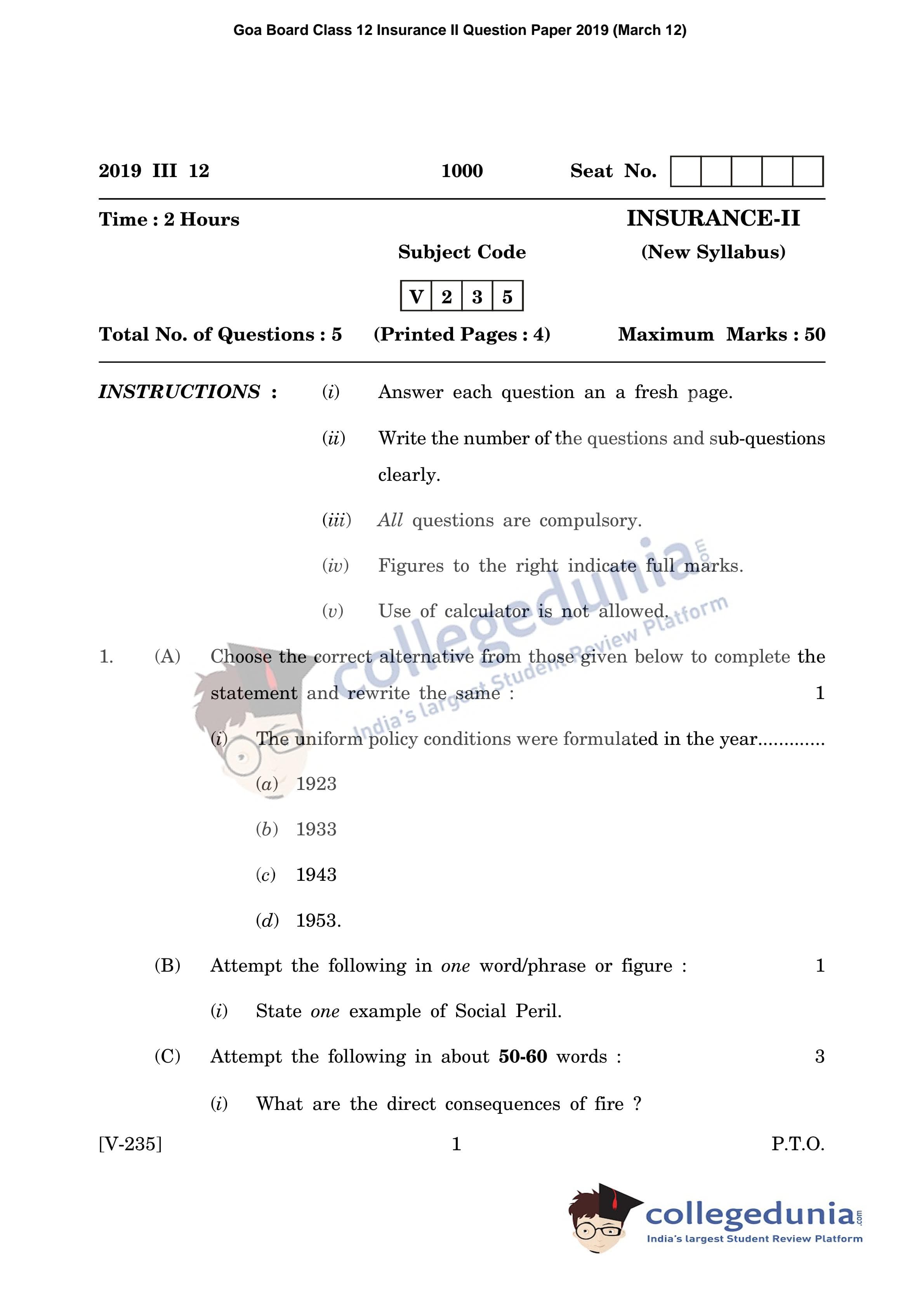 Goa Board HSSC Insurance II Question Paper 2019 with Answer Key (March 12)