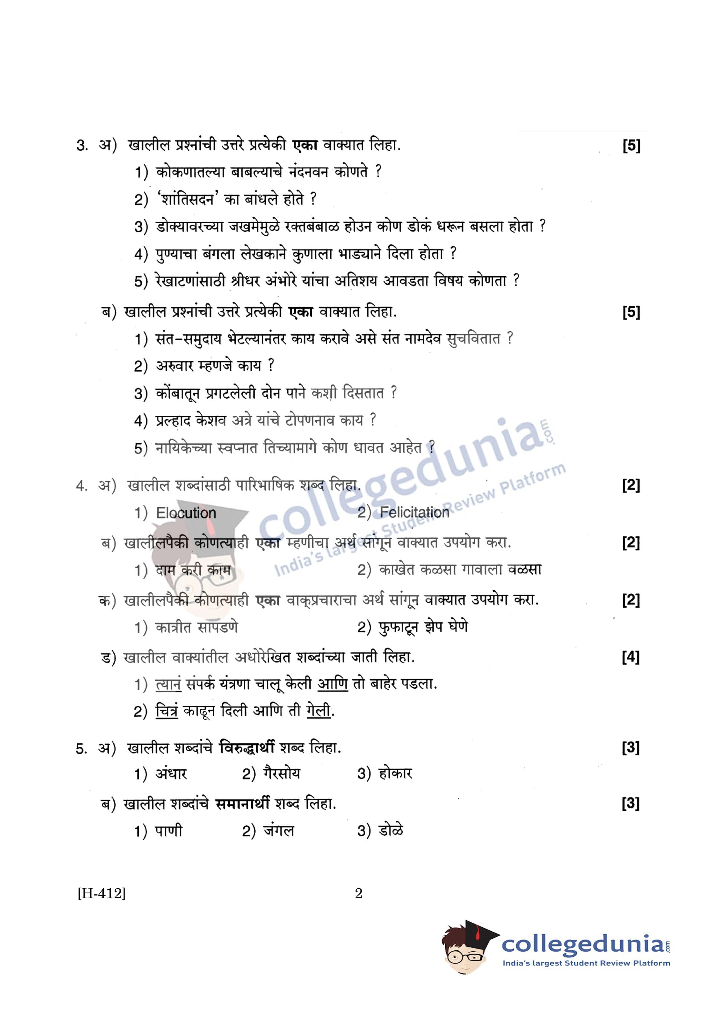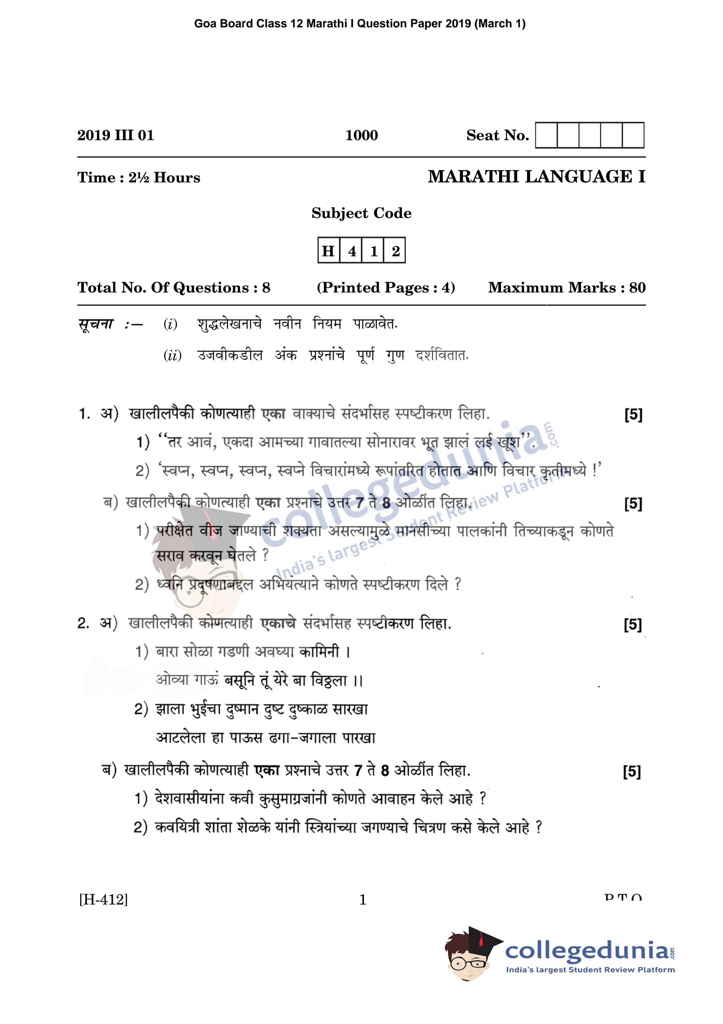 Goa Board HSSC Marathi I Question Paper 2019 with Answer Key (March 1)