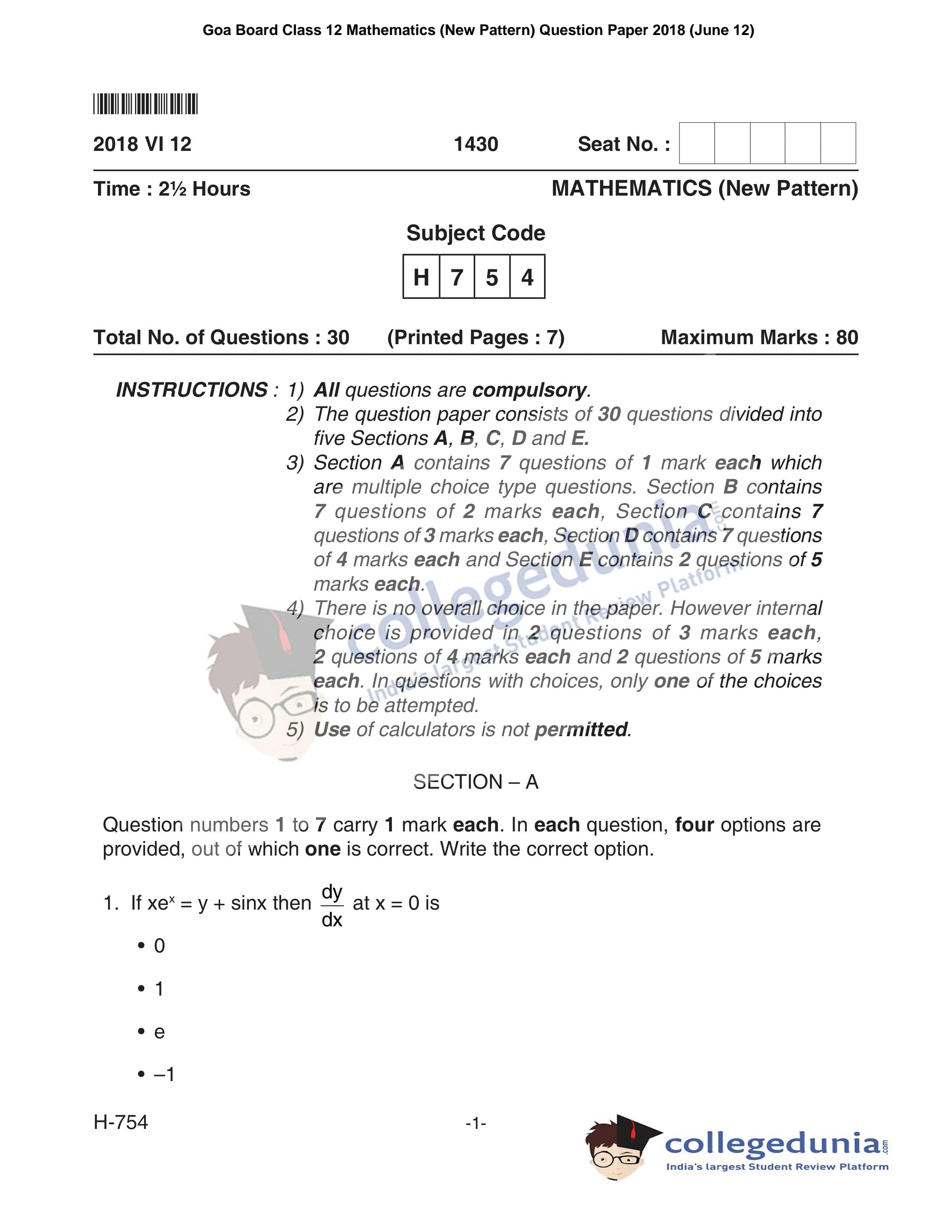 Goa Board HSSC Mathematics (New Pattern) Supplementary Question Paper 2018 with Answer Key is available for download. The exam was conducted by the Goa Board of Secondary and Higher Secondary Education (GBSHSE) on June 12, 2018 in the Afternoon Session 2:30 PM to 5 PM. The medium of paper was English. The Supplementary Question Paper comprised a total of 30 questions.