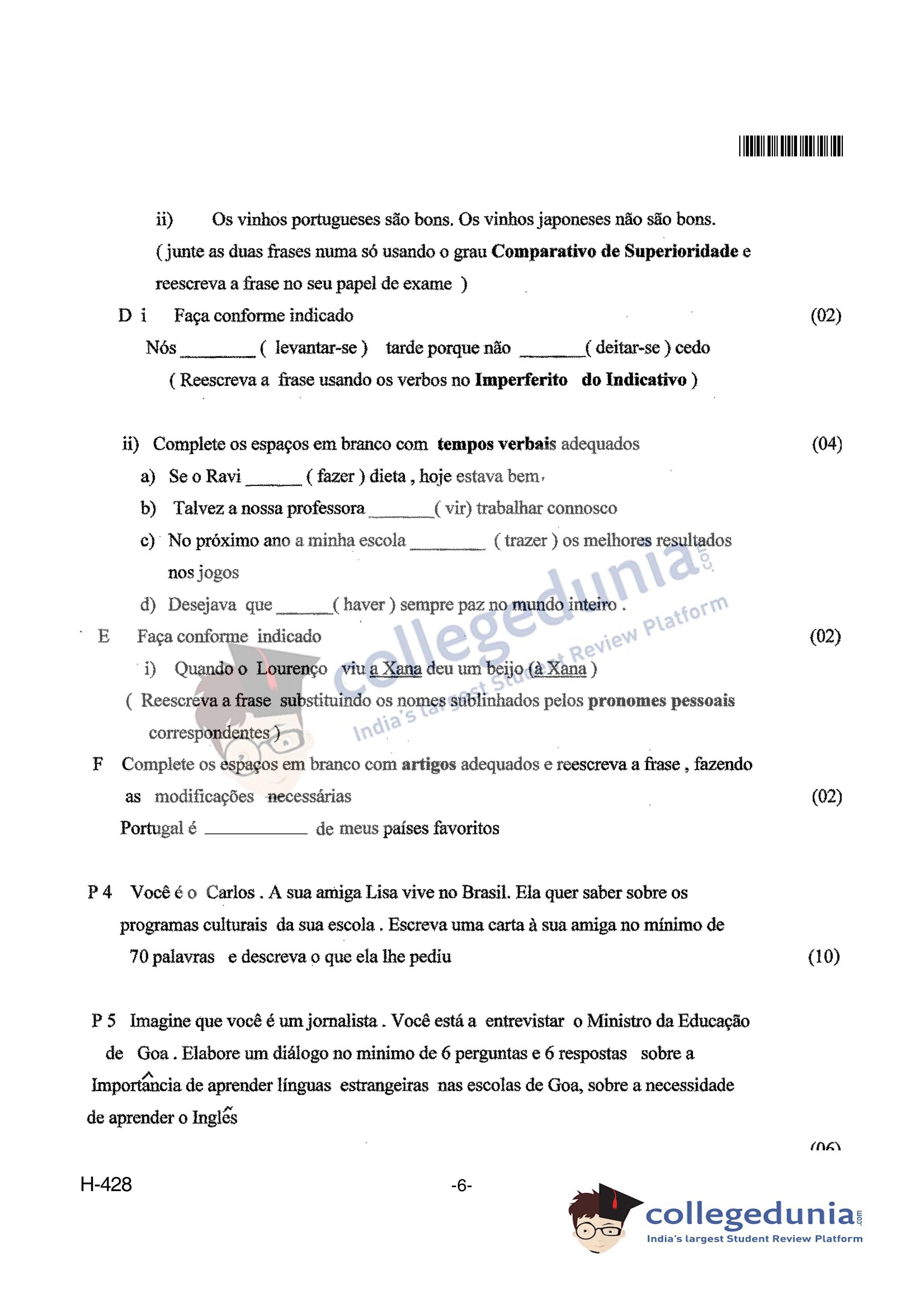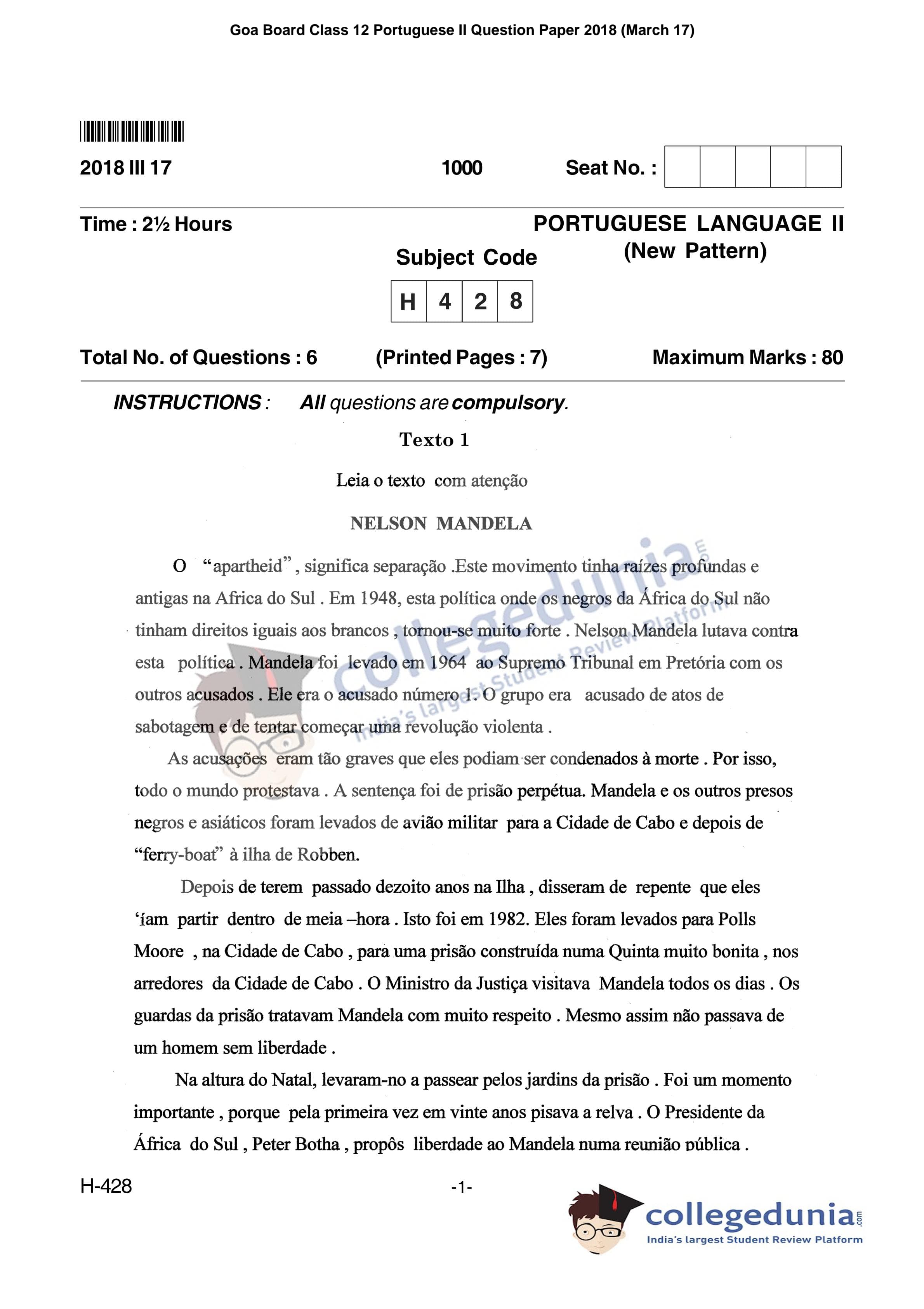Goa Board HSSC Portuguese II Question Paper 2018 with Answer Key (March 17)