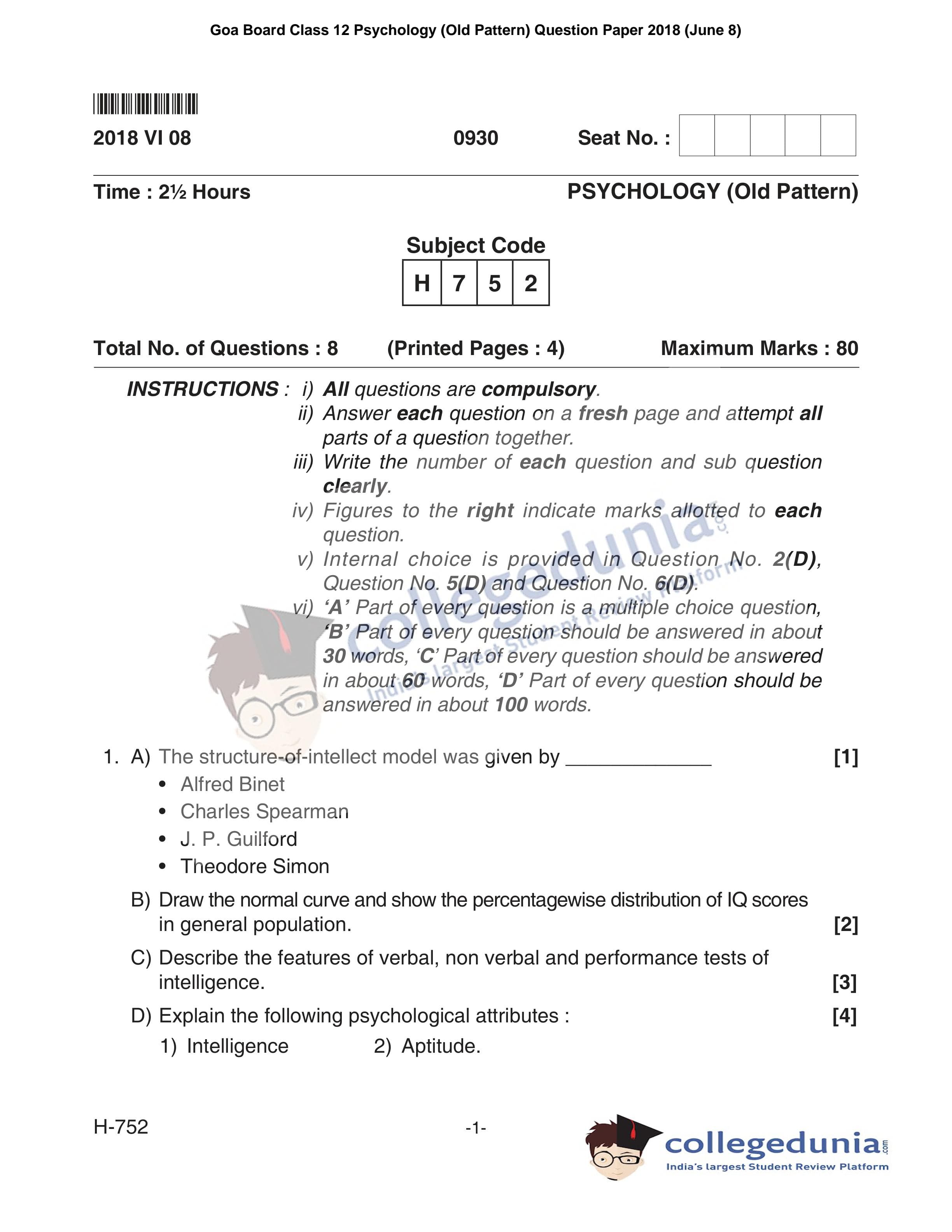 | Goa Board HSSC Psychology (Old Pattern) Question Paper 2018 PDF | Goa Board HSSC Psychology (Old Pattern) Answer Key 2018 PDF |