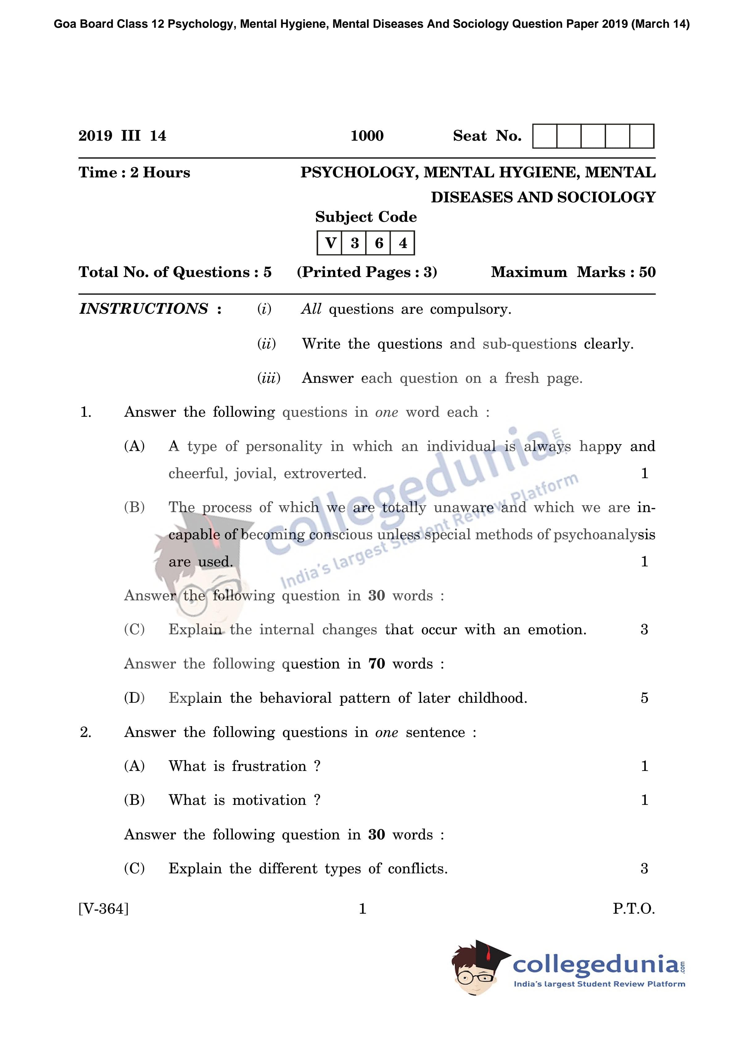Goa Board HSSC Psychology, Mental Hygiene, Mental Diseases And Sociology Question Paper 2019 with Answer Key (March 14)