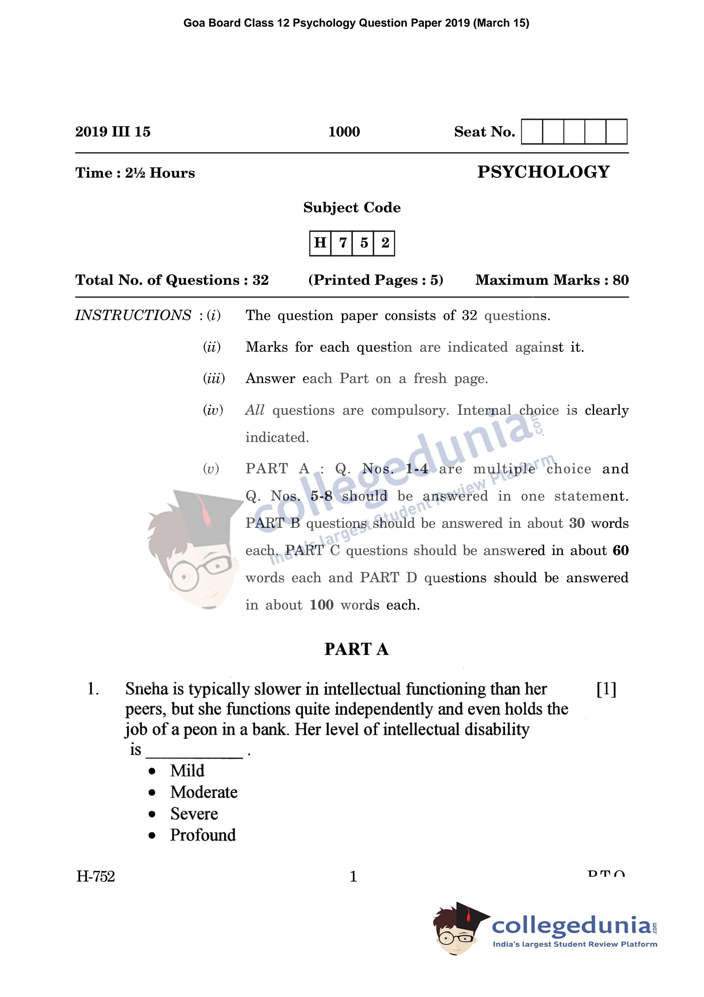 Goa Board HSSC Psychology Question Paper 2019 with Answer Key (March 15)