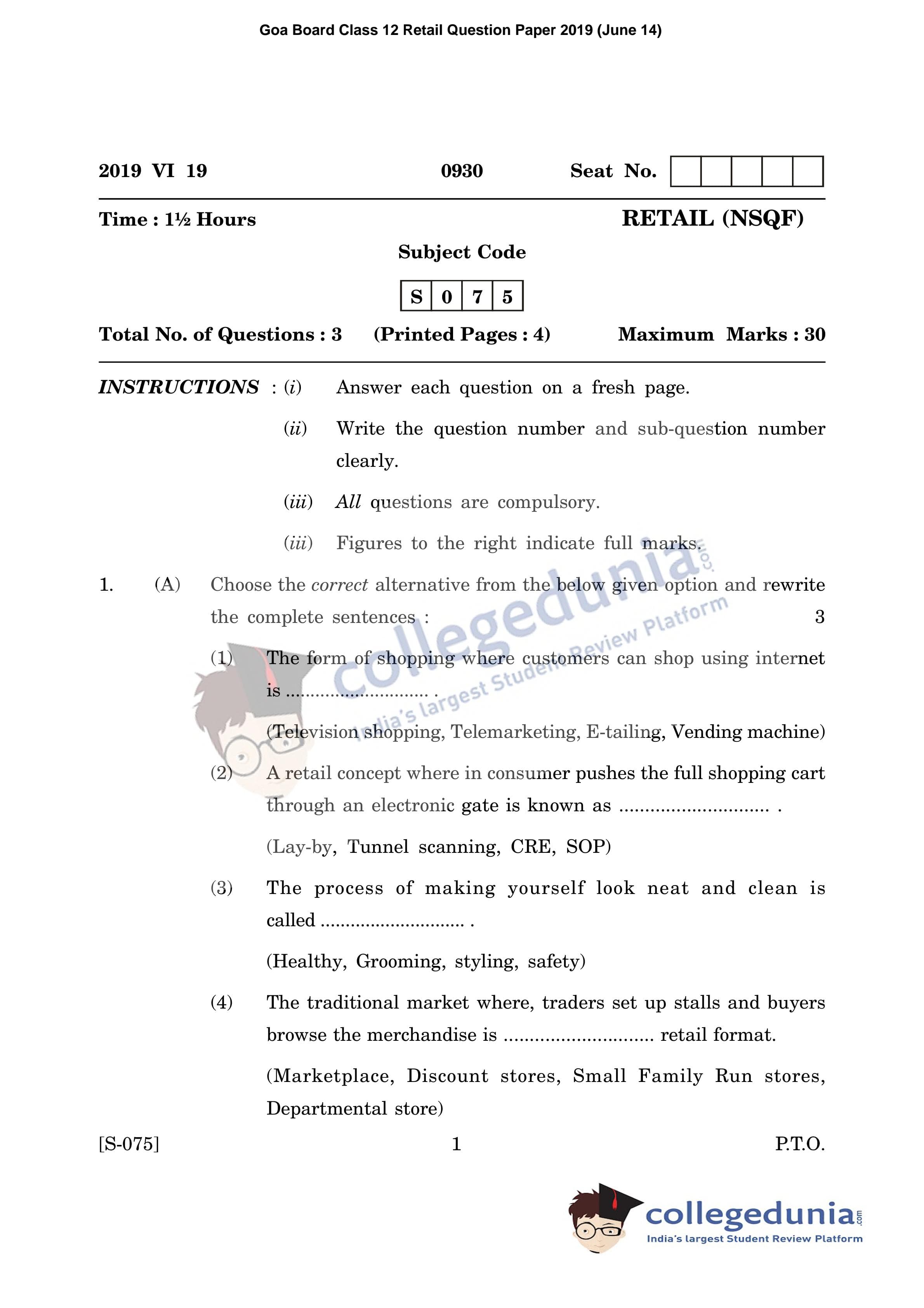 Goa Board HSSC Retail Supplementary Question Paper 2019 with Answer Key (June 14)