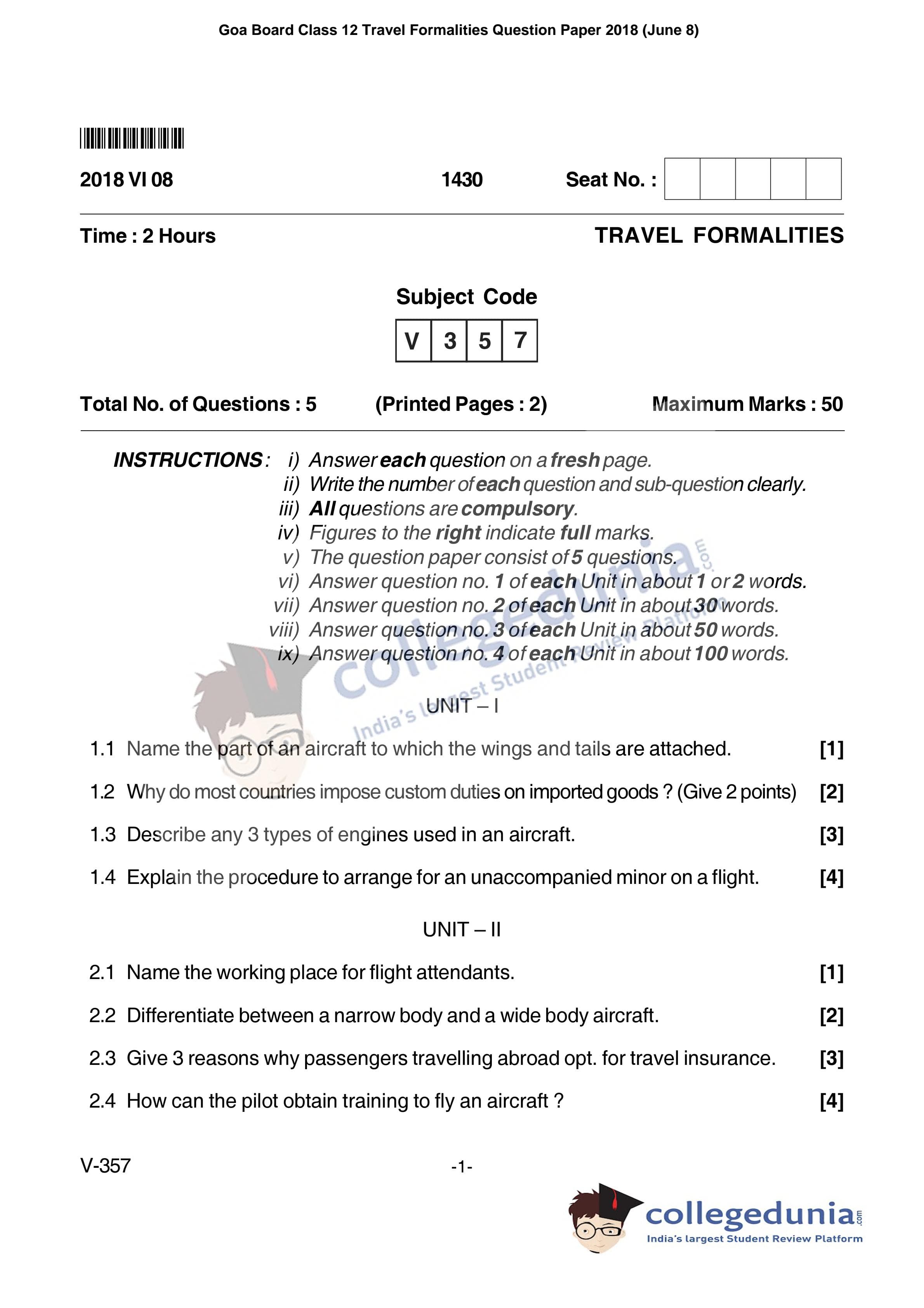 Goa Board HSSC Travel Formalities Supplementary Question Paper 2018 with Answer Key is available for download. The exam was conducted by the Goa Board of Secondary and Higher Secondary Education (GBSHSE) on June 8, 2018 in the Afternoon Session 2:30 PM to 4:30 PM. The medium of paper was English. The Supplementary Question Paper comprised a total of 5 questions.