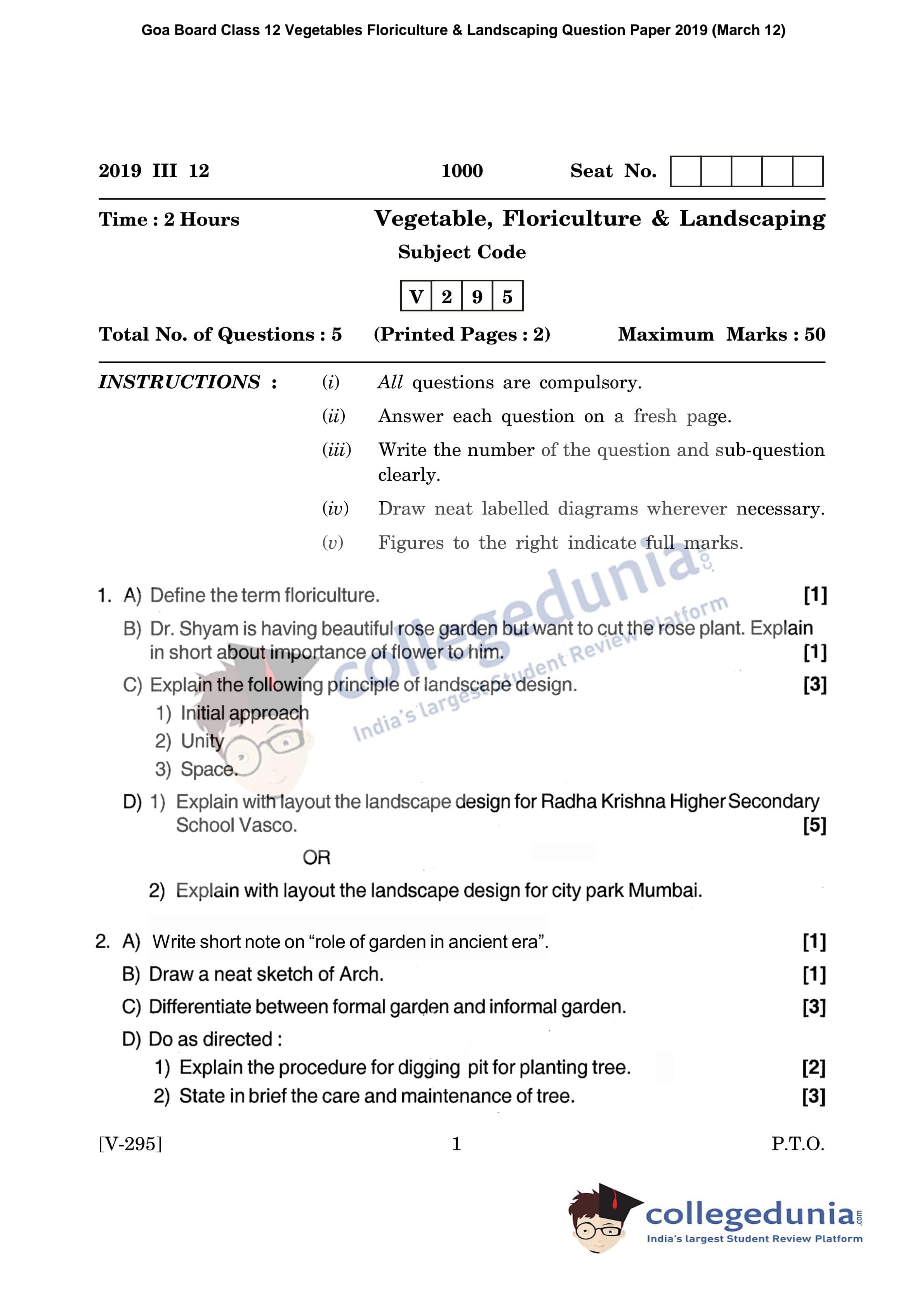 Goa Board HSSC Vegetables Floriculture & Landscaping Question Paper 2019 with Answer Key (March 12)