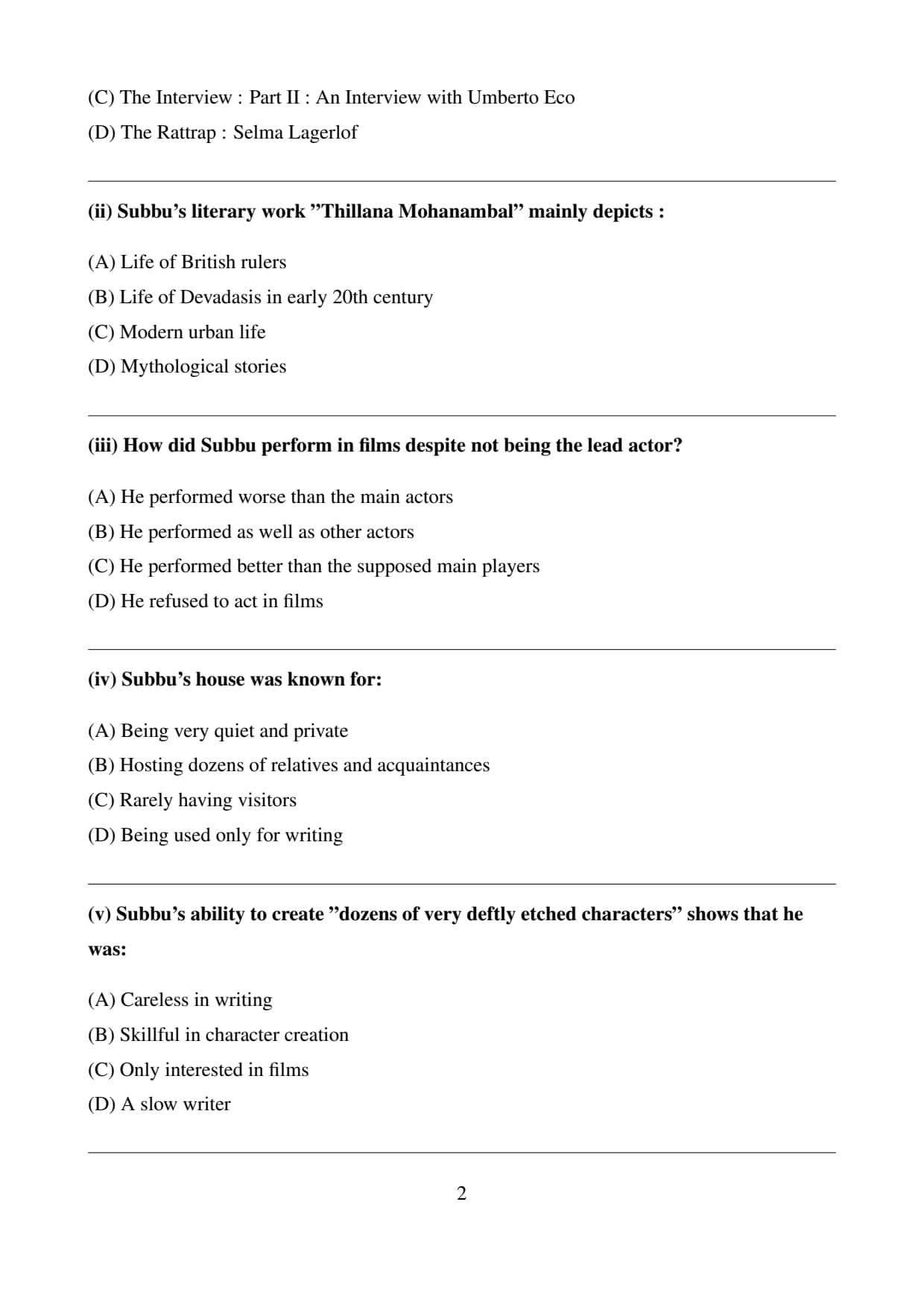 (A) His success in films overshadowed and dwarfed his literary achievements - or so his critics felt. He composed several truly original 'story poems' in folk refrain and diction and also wrote a sprawling novel Thillana Mohanambal with dozens of very deftly etched characters. He quite successfully recreated the mood and manner of the Devadasis of the early 20th century. He was an amazing actor—he never aspired to the lead roles—but whatever subsidiary role he played in any of the films, he performed better than the supposed main players. He had a genuine love for anyone he came across and his house was a permanent residence for dozens of near and far relations and acquaintances.