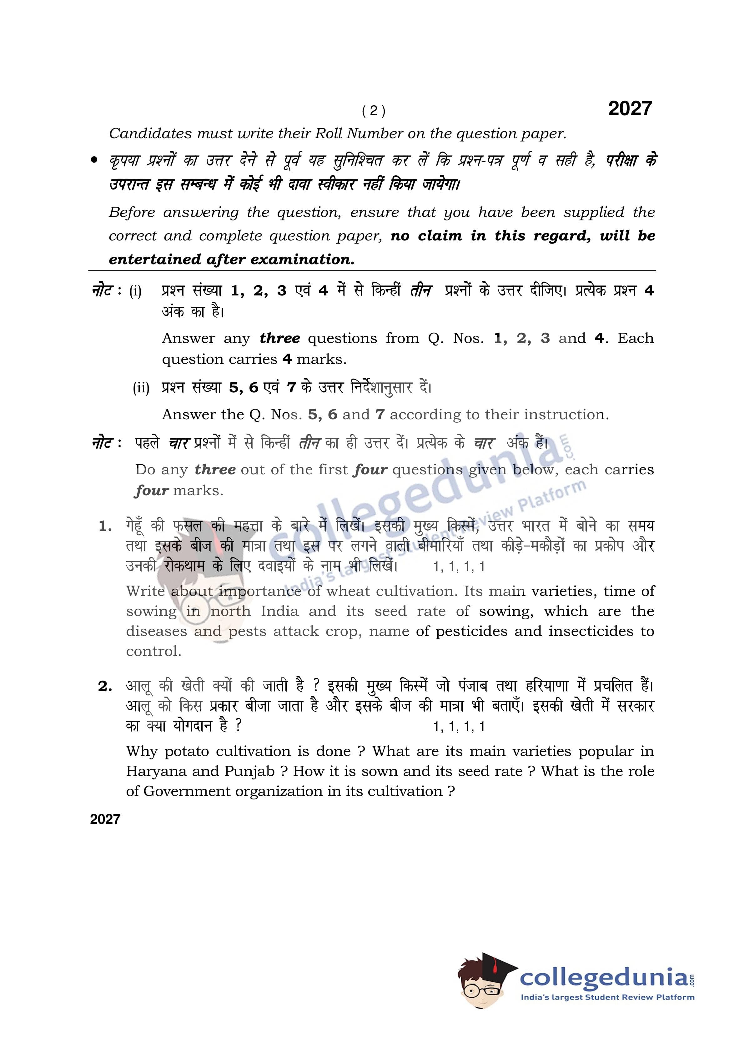HBSE Class 12 Agriculture Question Paper 2017 with Answer Key (March 18)