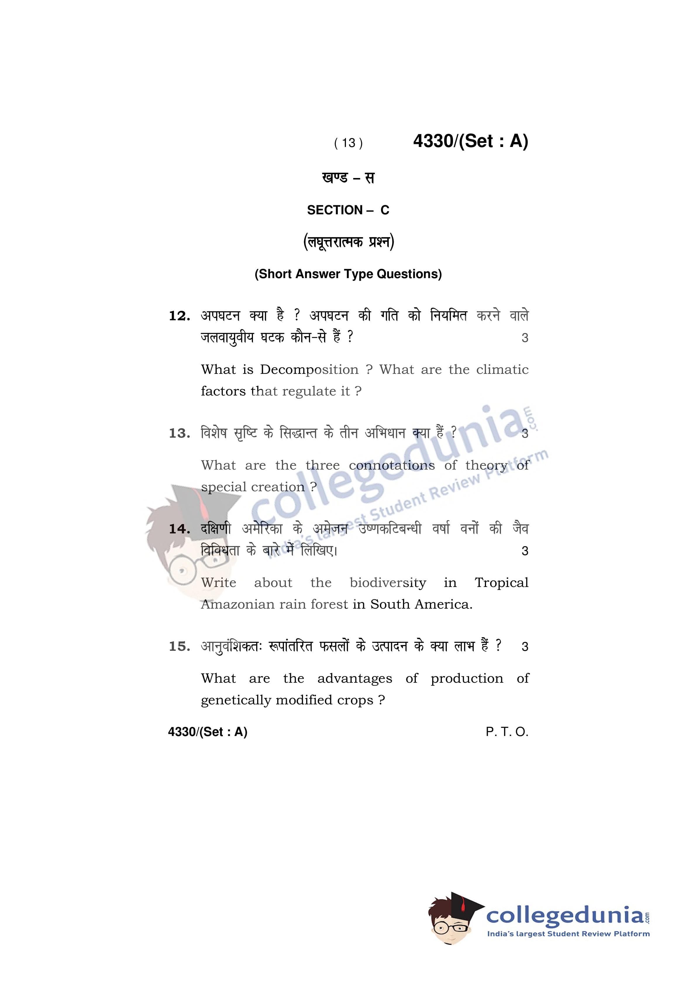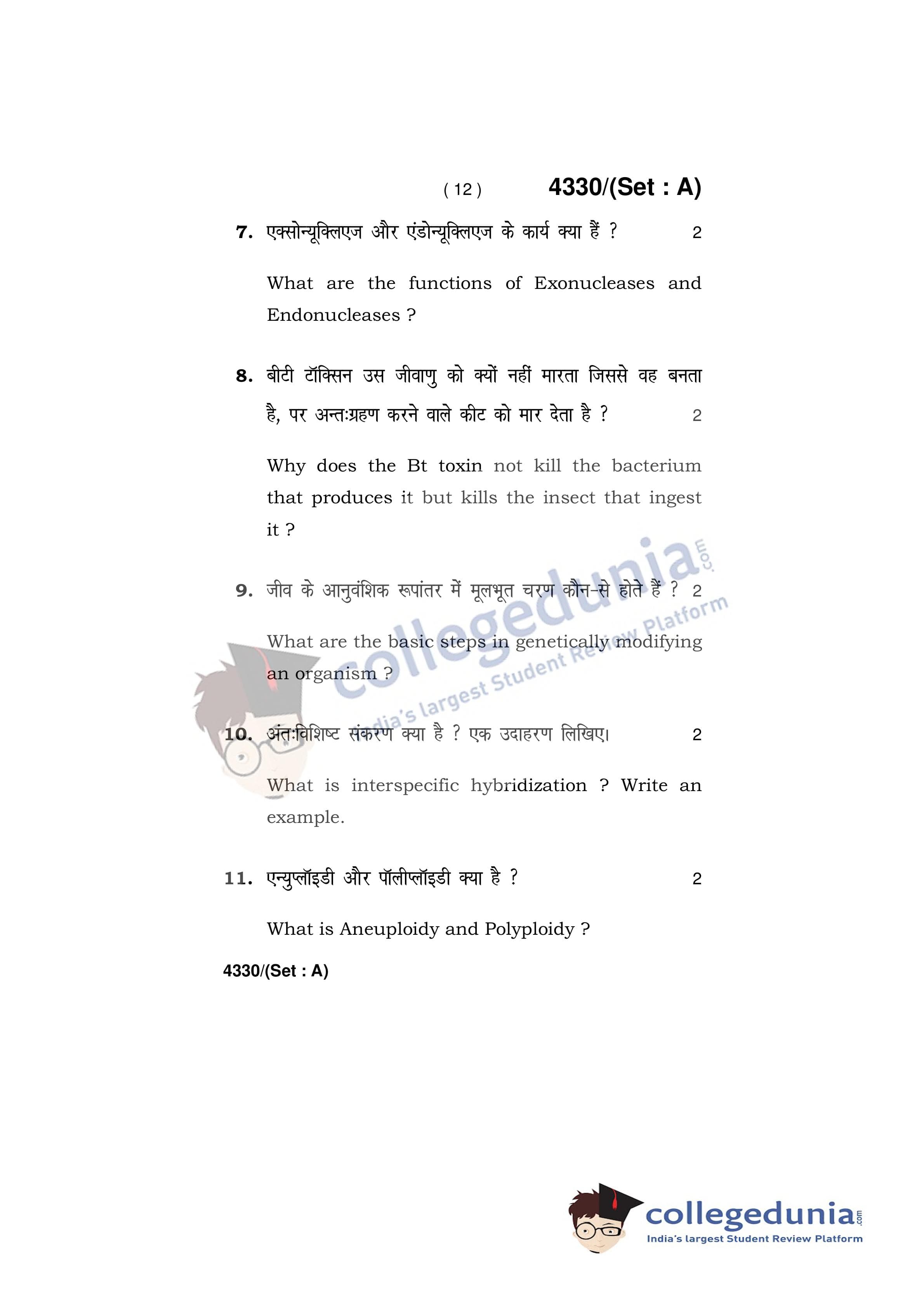 HBSE Class 12 Biology Set A Question Paper 2019 with Answer Key (March 30)
