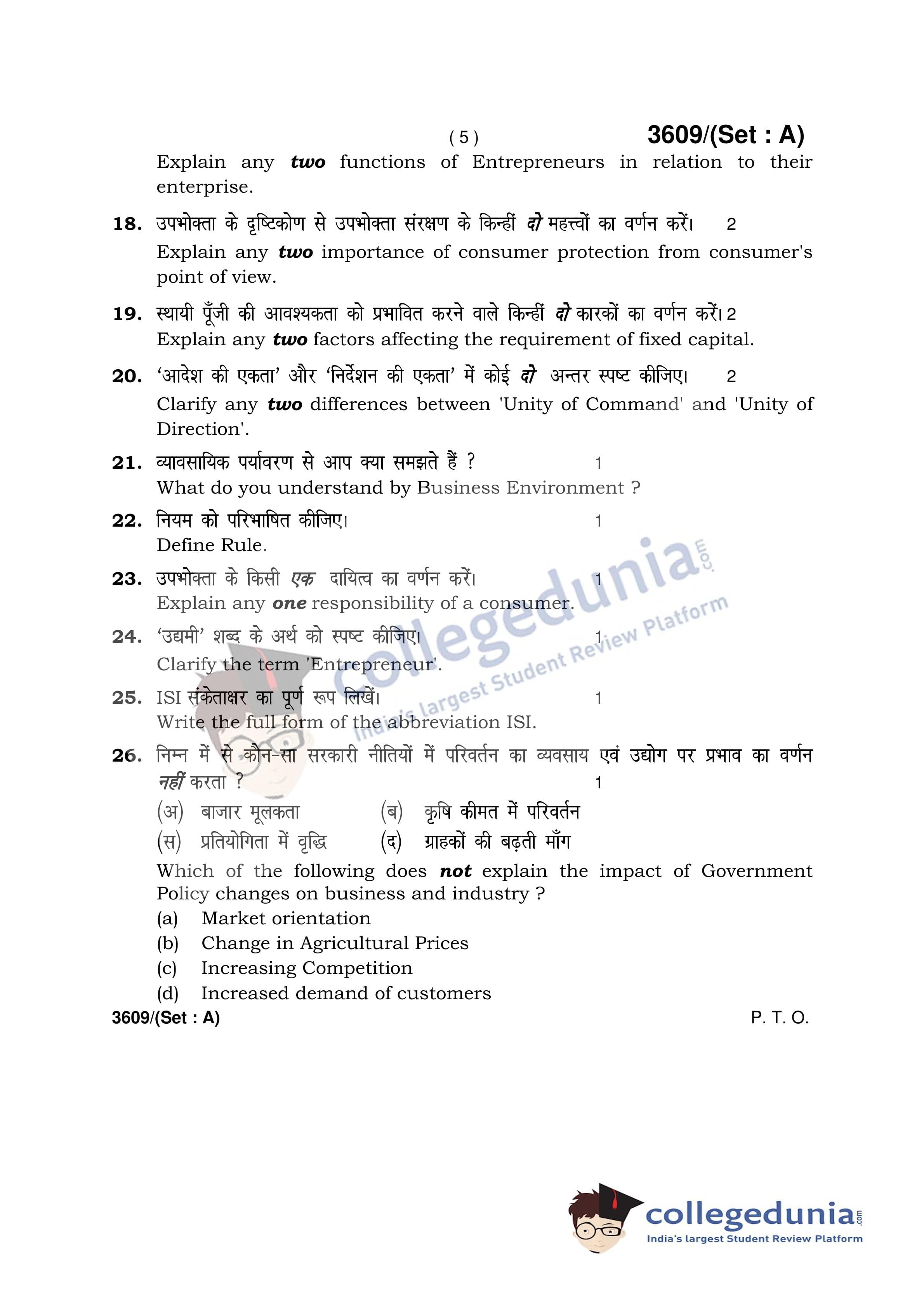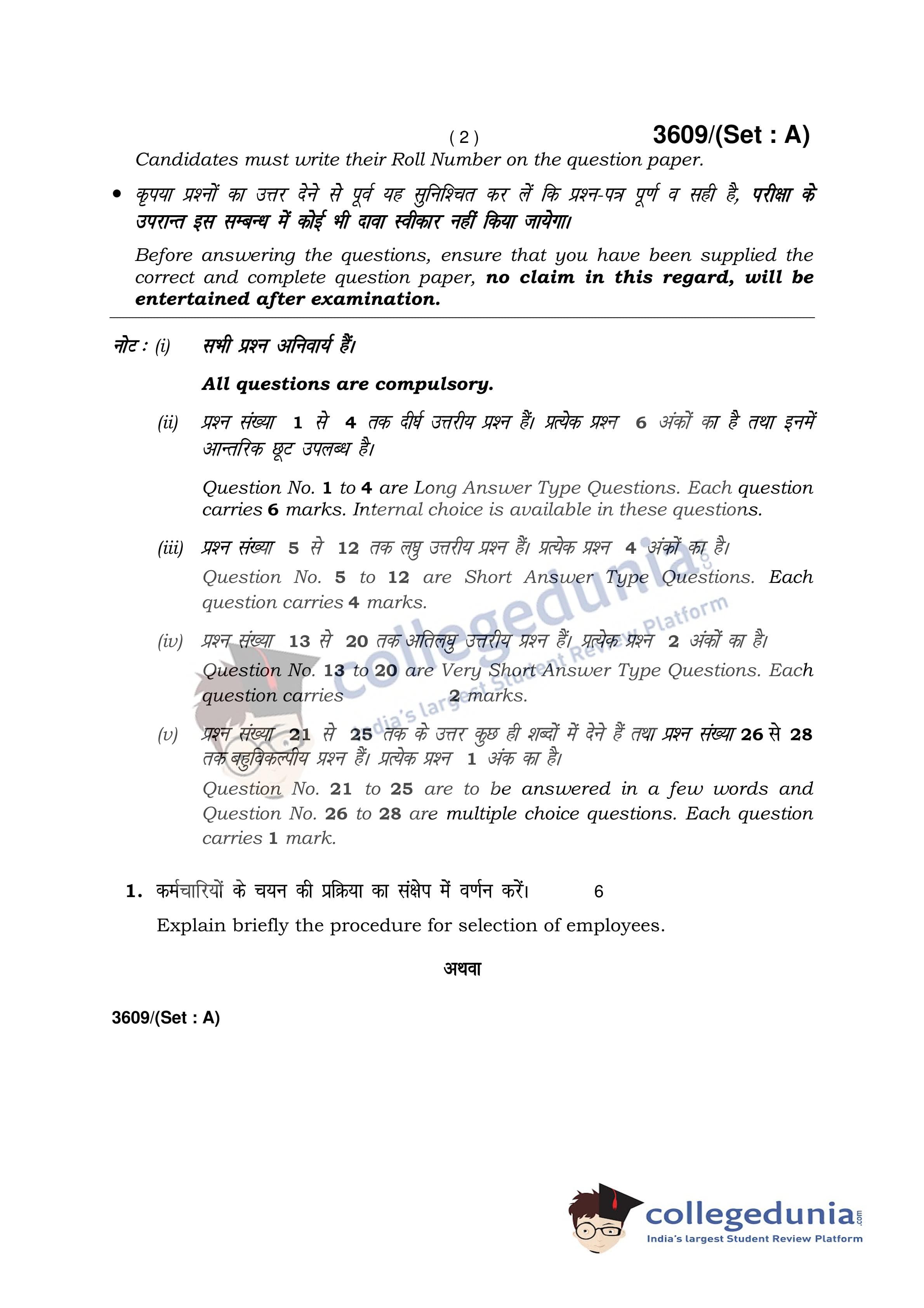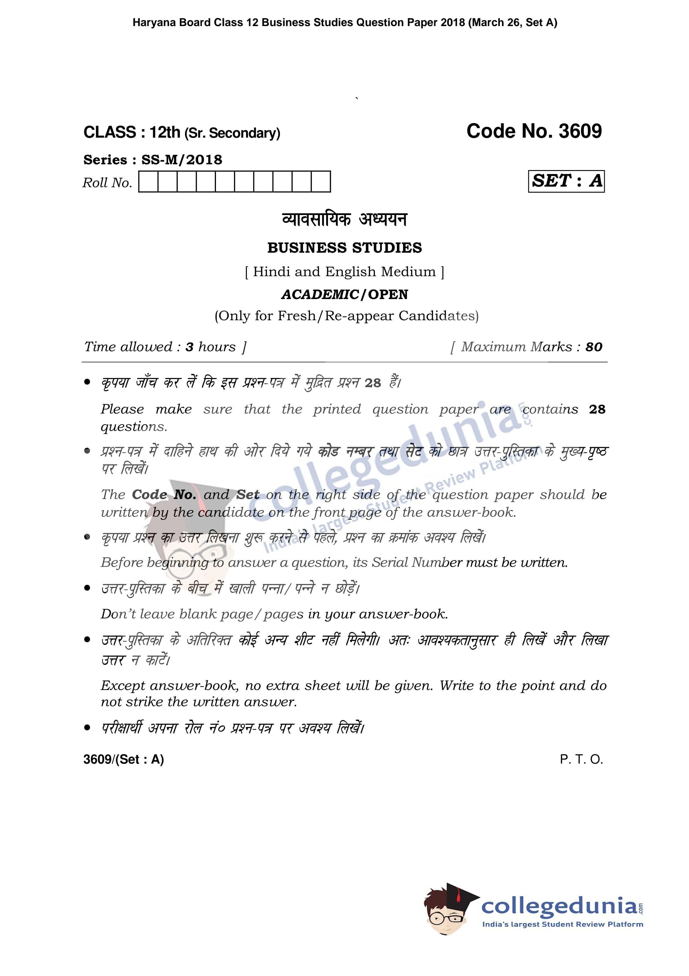 HBSE Class 12 Business Studies Set A Question Paper 2018 with Answer Key (March 26)