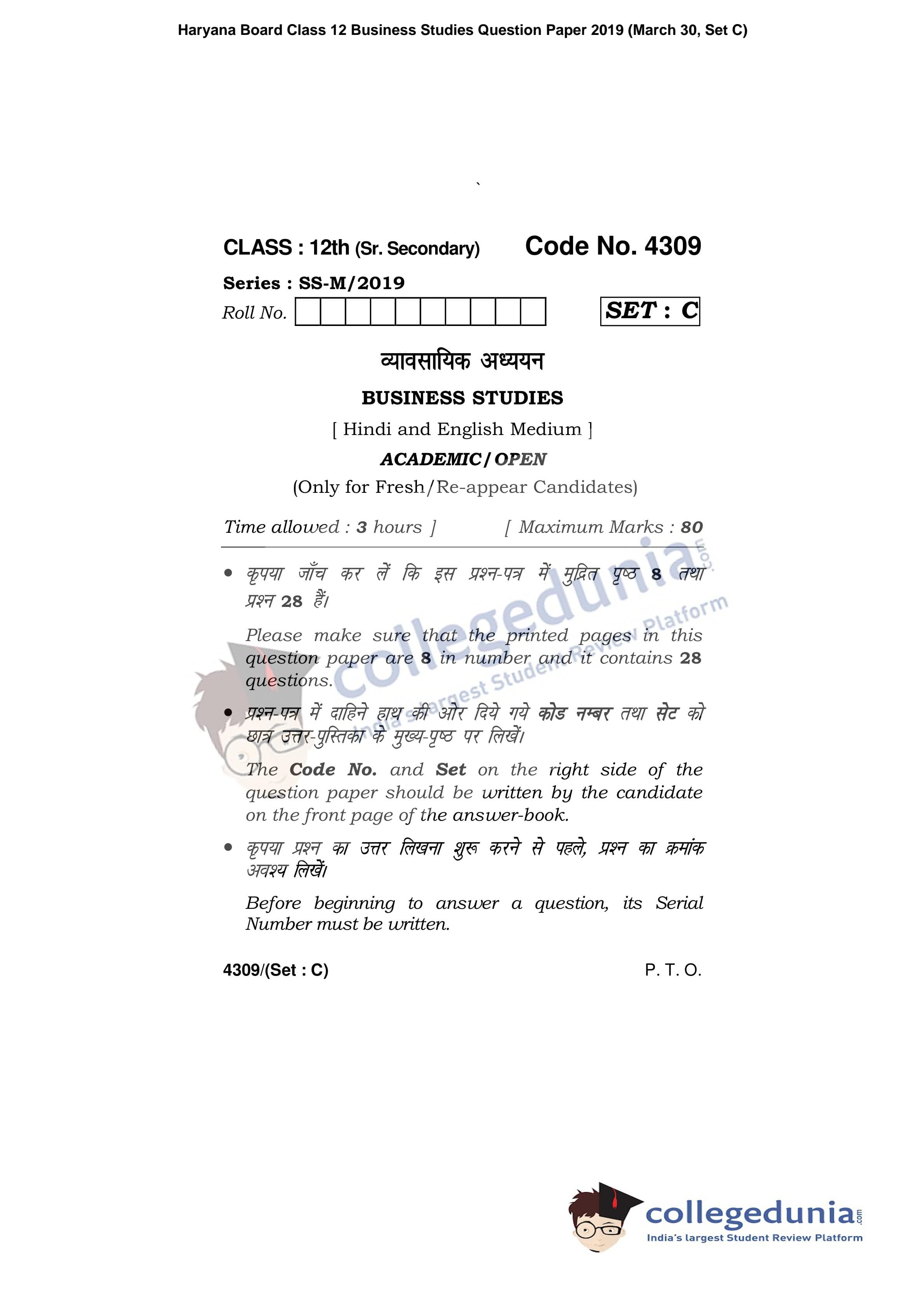 HBSE Class 12 Business Studies Set C Question Paper 2019 with Answer Key (March 30)